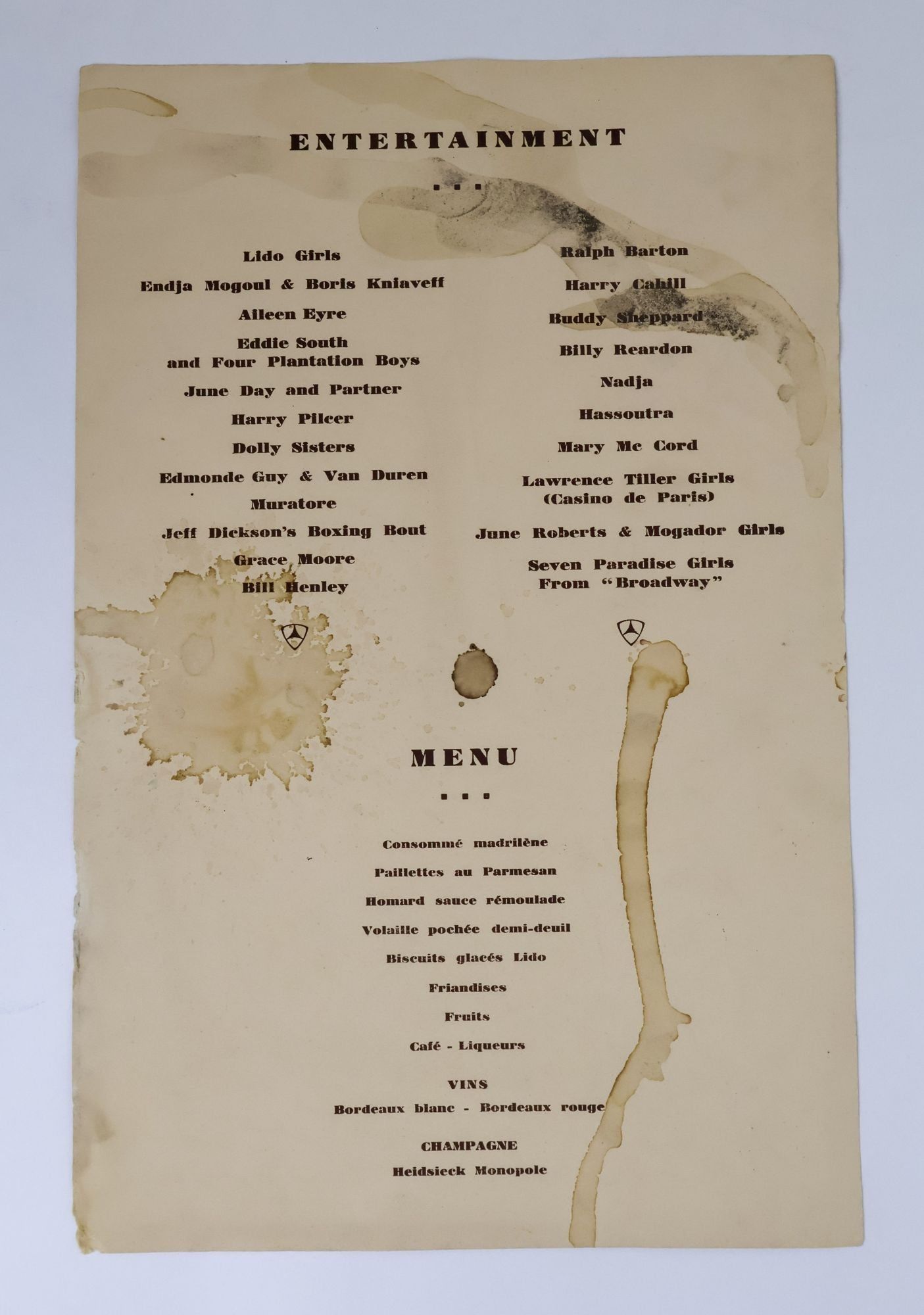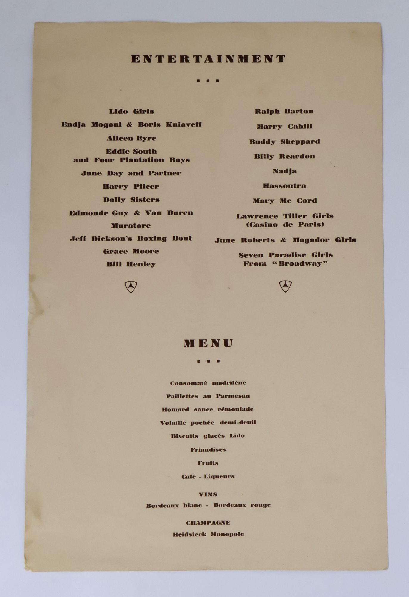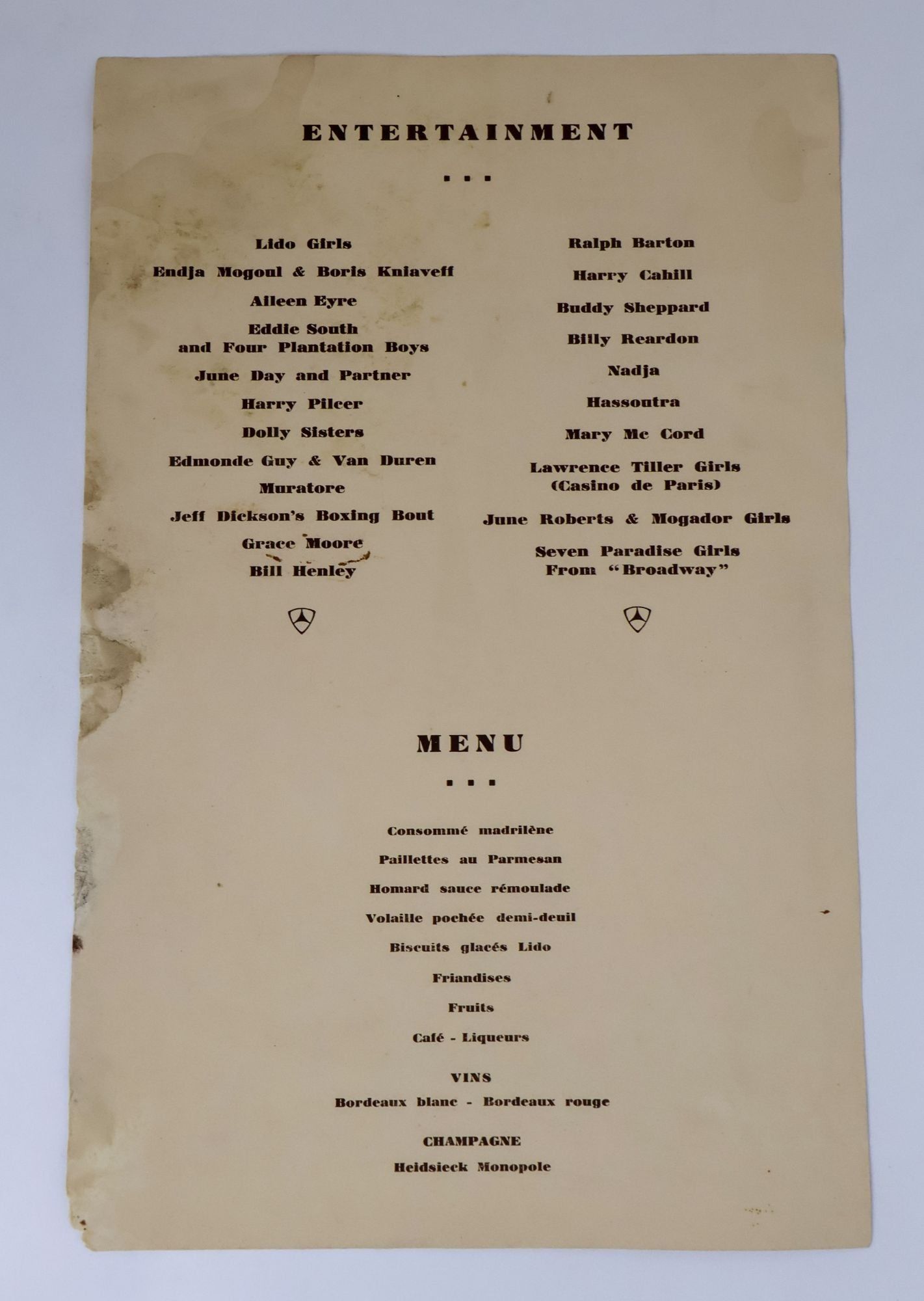 Paris: L'Association de la Presse Anglo-Americaine de Paris, 1928. Other. Three Programs, one sheet each. In Very Good condition. Illustrated on the front, with entertainment and food menu on the rear. Each program is lightly age toned, with some chipping and soiling along the right edge. Large, faint stains on the front of two of the programs near the top edge. Varying levels of soiling on the backs of the programs, with one being very lightly soiled along the edge, another with more moderate soiling, and the third showing heavier soiling and food stains. SH consignment. Shelved in Room A Oversize. . L'Association de la Presse Anglo-Americaine de Paris (The Association of the Anglo-American Press of Paris) is a journalist's organization, founded in 1907, that held weekly lunches and annual dinners for journalists and French politicians. The programs were produced for the association's 1928 dinner, held at the Lido des Champs Elysees, an iconic Parisian theater and cabaret that had opened earlier that year.
