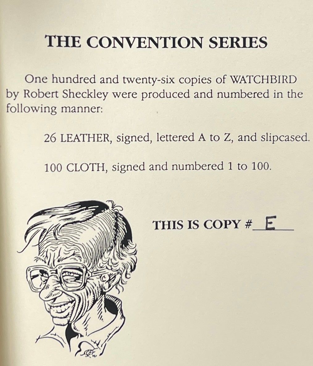 Eugene: The Convention Series | Pulphouse Publishing, 1990. First Edition. Hardcover. Fine. One of the 26 lettered copies signed by Sheckley and Frank Kelly Freas. Fine in a Fine slipcase. White leather with gilt lettering on the spine and front board. Square and firmly bound, clean internally. Sheckley's short story seemingly predicting the use of drone technology by law enforcement to monitor and deter crime.