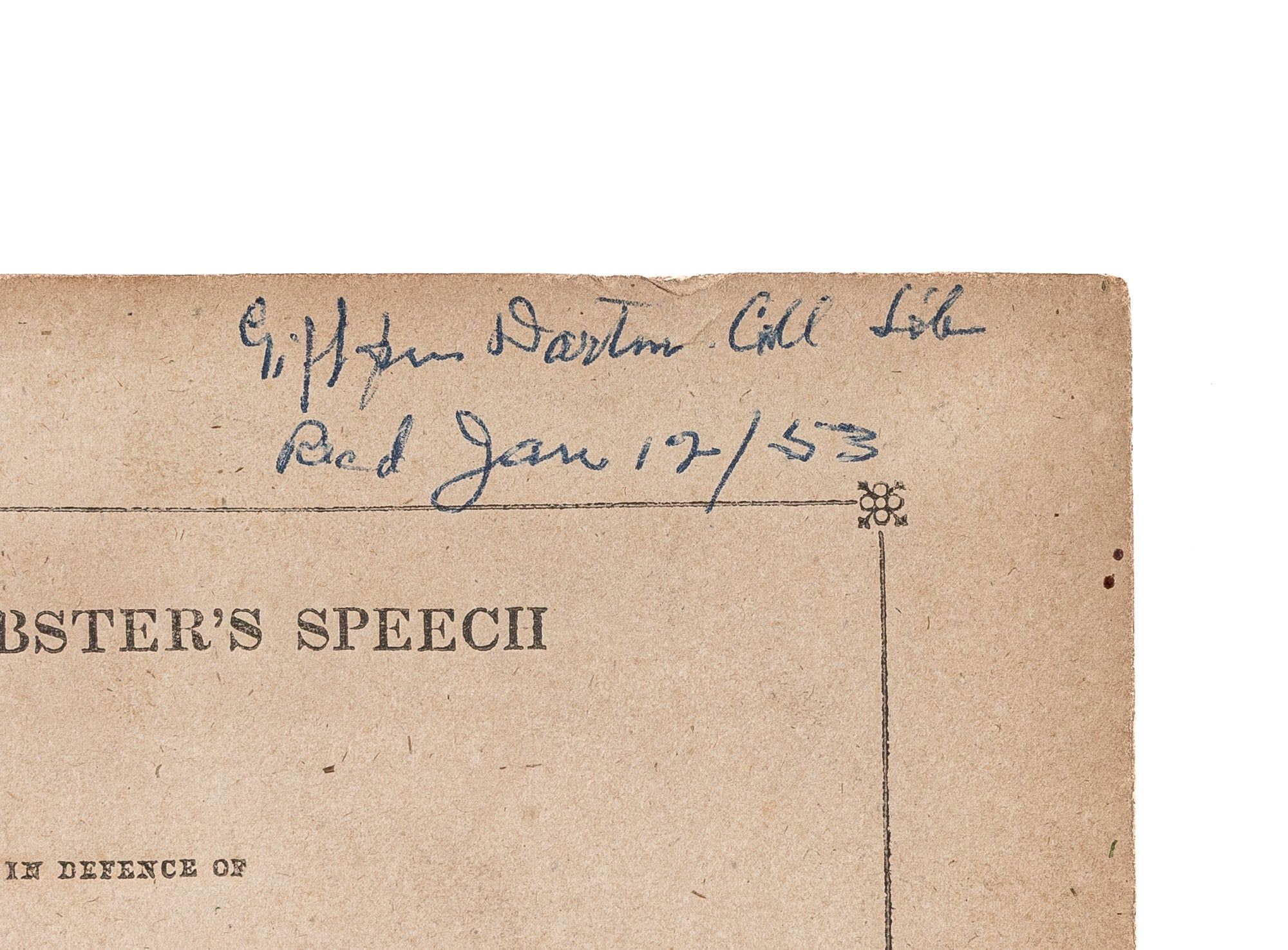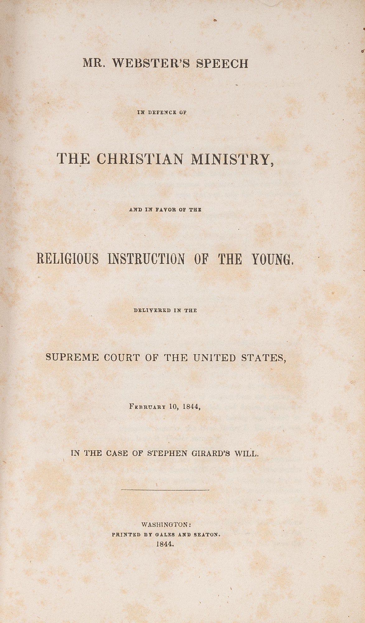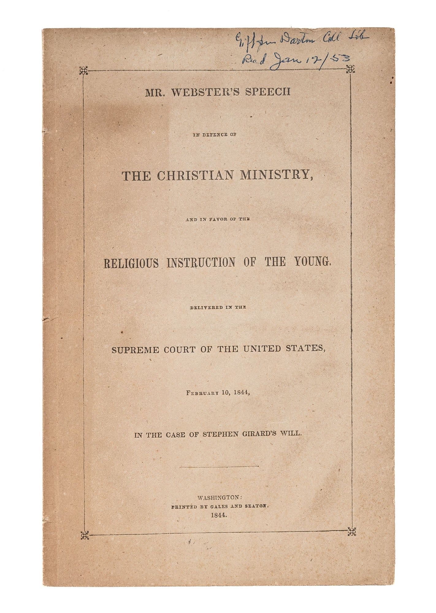 1844. One of Webster's Finest Courtroom Speeches Webster, Daniel [1782-1852]. Mr. Webster's Speech in Defence of the Christian Ministry, and in Favor of the Religious Instruction of the Young: Delivered in the Supreme Court of the United States, February 10, 1844: In the Case of Stephen Girard's Will. Washington: Printed by Gales and Seaton, 1844. 60 pp. Octavo (8-3/4" x 5-1/2"; 22.2 x 14.1 cm). Stab-stitched pamphlet in printed wrappers. Light soiling to exterior, light wear to spine ends and corners. "Gift of Dartmouth Coll Lib/ Recd Jan 12/53" to upper-ouside corner of front wrapper in tiny hand. Moderate toning to interior, foxing to title page and a few other leaves. $125. * Only edition. Girard's heirs sued unsuccessfully to overturn Girard's will, which left substantial sums to establish Girard College and other charitable institutions. Webster's speech in this pamphlet defends one of these, a religious institution for children. It is one of Webster's finest courtroom speeches. Cohen, Bibliography of Early American Law 1142.