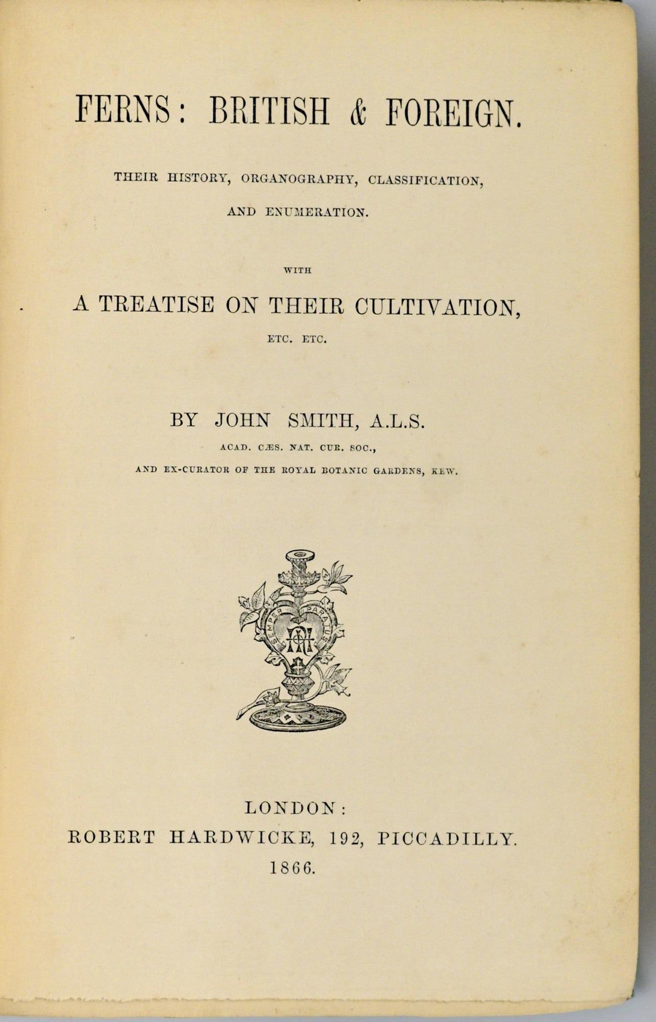 London: Robert Hardwicke, 1866. First Edition. Hard Cover. Near Fine binding. Octavo; in the publisher’s green cloth wit titling in gilt to the spine, and a gilt fern stamped to the upper board; xi, 412 pages, with illustrations throughout; the hinges have been discreetly reinforced with japanese tissue.~~Quite copy on this history of ferns. Near Fine binding.