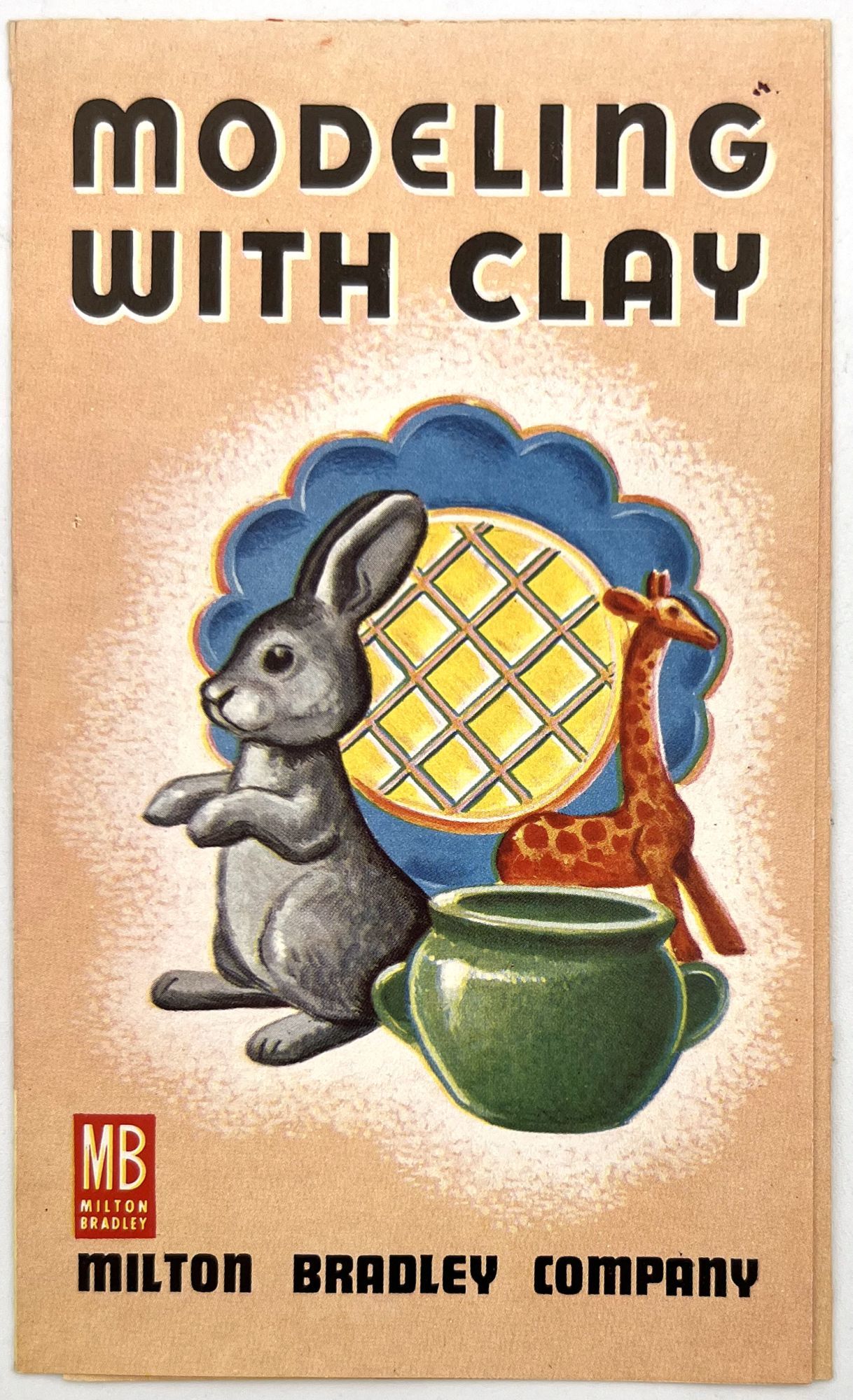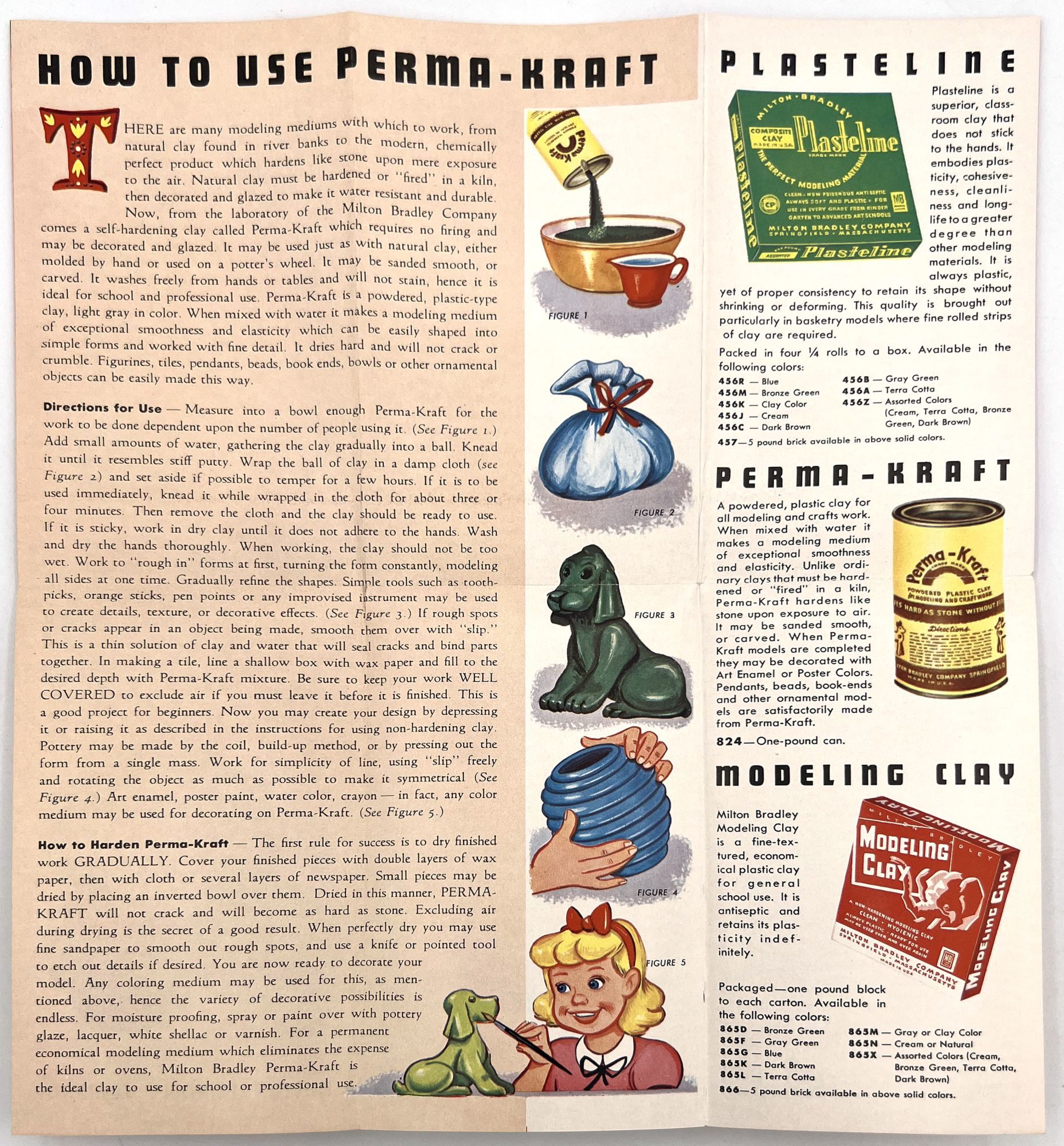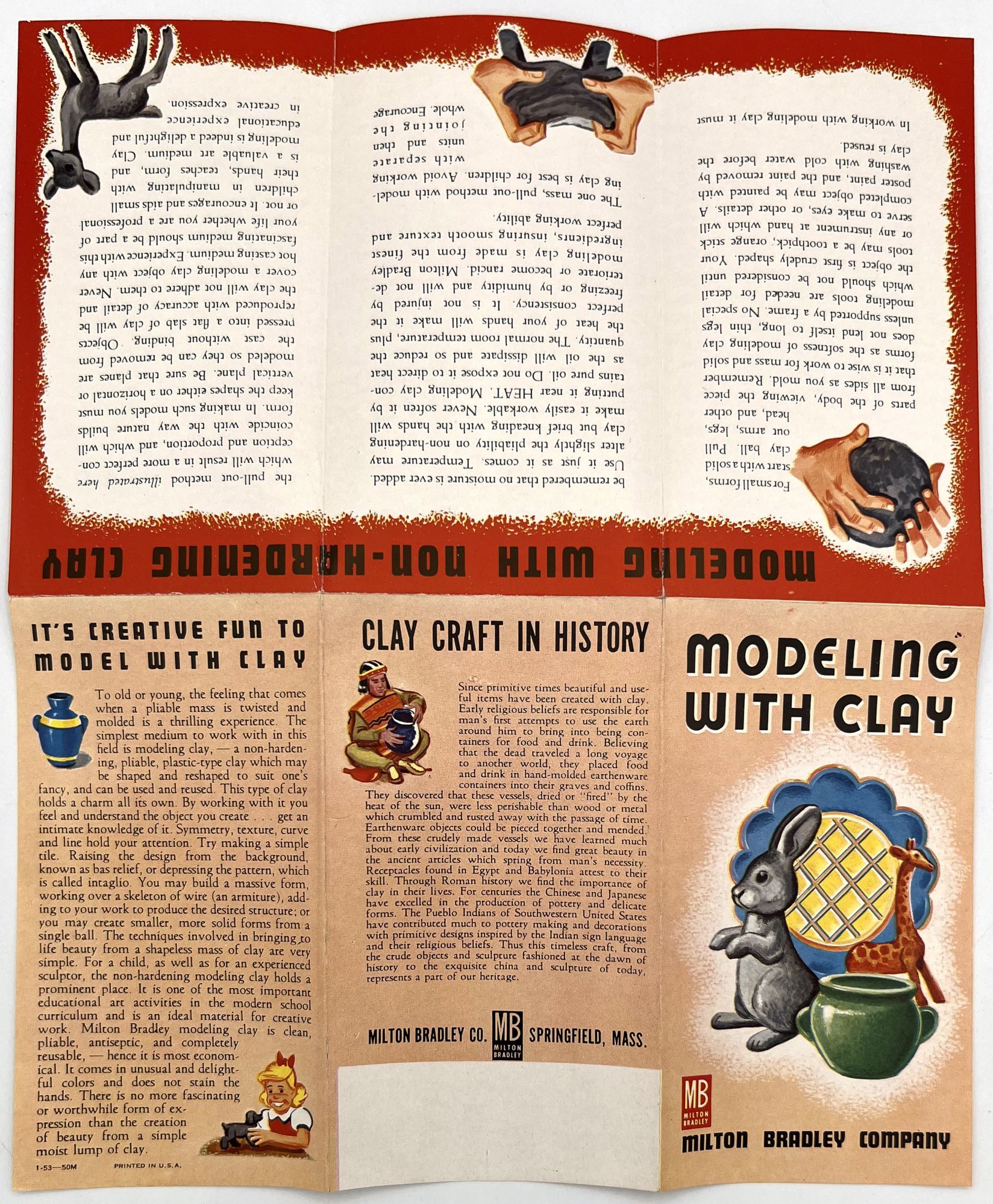 N.pl: Milton Bradley Company, 1953. Very good to near-fine.. Printed advertising leaflet for modeling clay sold by the Milton Bradley Company, produced to help children express themselves creatively and learn through play. Includes illustrations of the different figures children can make, and images of three different modeling clay products, with directions for use. Includes a brief description of how clay crafts have been used throughout history to make sculptures, china, and earthenware. Issued in the 1950s, most likely as a competitor for the popular "Play Doh" brand of modeling clay. Measures approx. 6" by 3.5" folded, 12" by 10.5" unfolded.