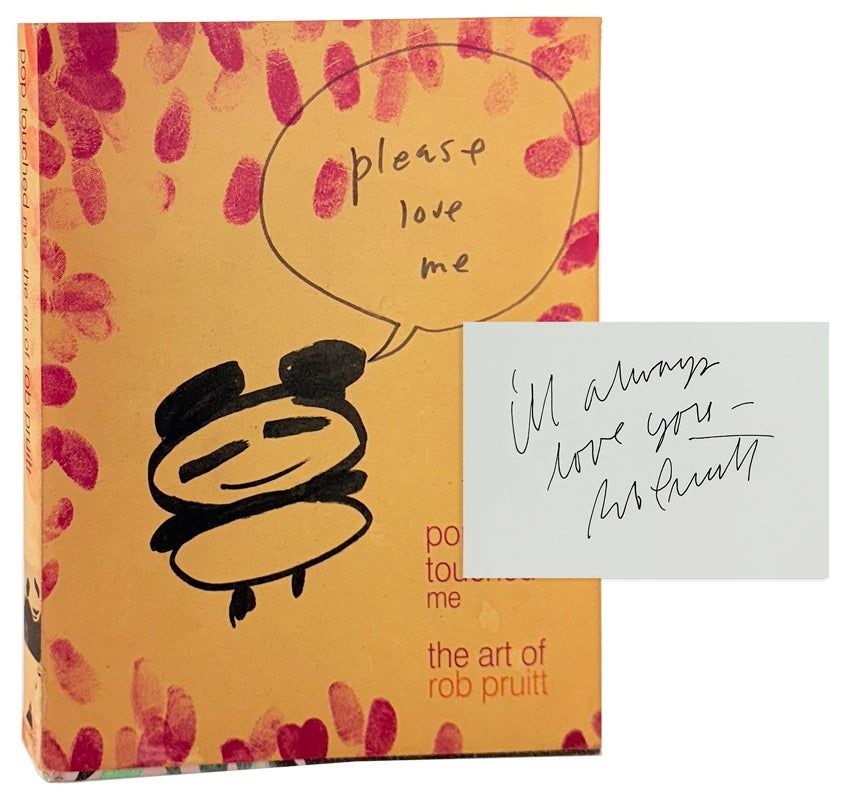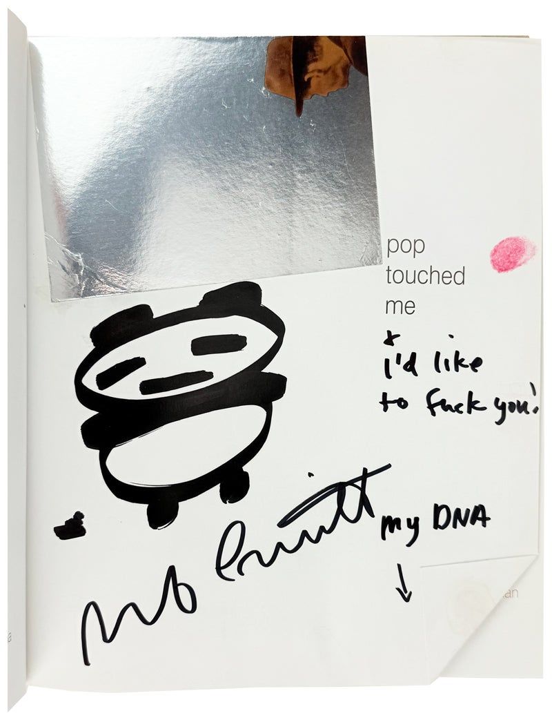 Twice inscribed and signed by Pruitt with a drawing of his alter ego panda bear on half title and title page, together with a questionable damp spot to the former to which the artist has written with an arrow, "my DNA." Front jacket panel additionally features an original drawing of a panda bear with the speech bubble "please love me.