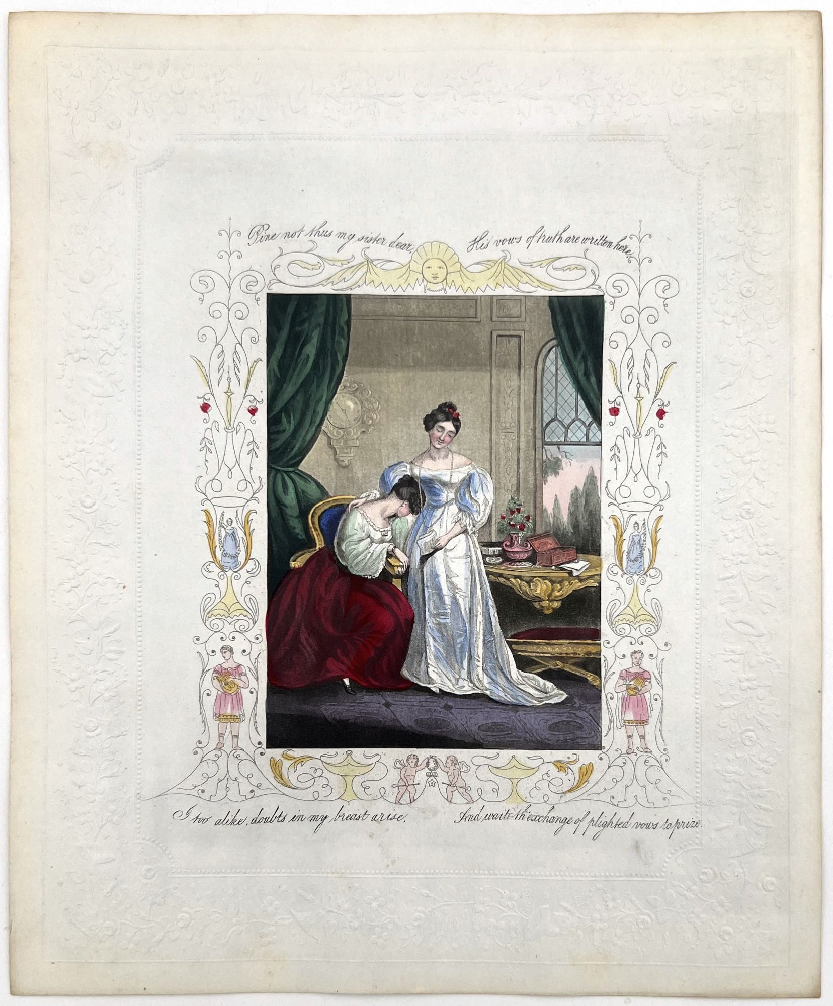 England, 1830. Very good. Light toning.. A rare example of one of the valentines produced for the so-called "Unrequited Love" or "Despondent Lover" valentine set, a highly sentimental series first produced in the 1830s. Most featured despondent lovers, but some featured happy or joyful scenes of love. This example does not feature the Addenbrooke name or 1828 watermark known in other examples, but appears contemporary. This example depicts two sisters in a drawing room, one consoling the other, with a poem that reads: "Pine not thus. my sister dear, His vows are written here, I too alike, doubts in my breast arise, ANd wait th' exchange of plighted vows to prize." Wove paper bifolium with embossed decorative border (10" by 8"), with hand colored aquatint in center.