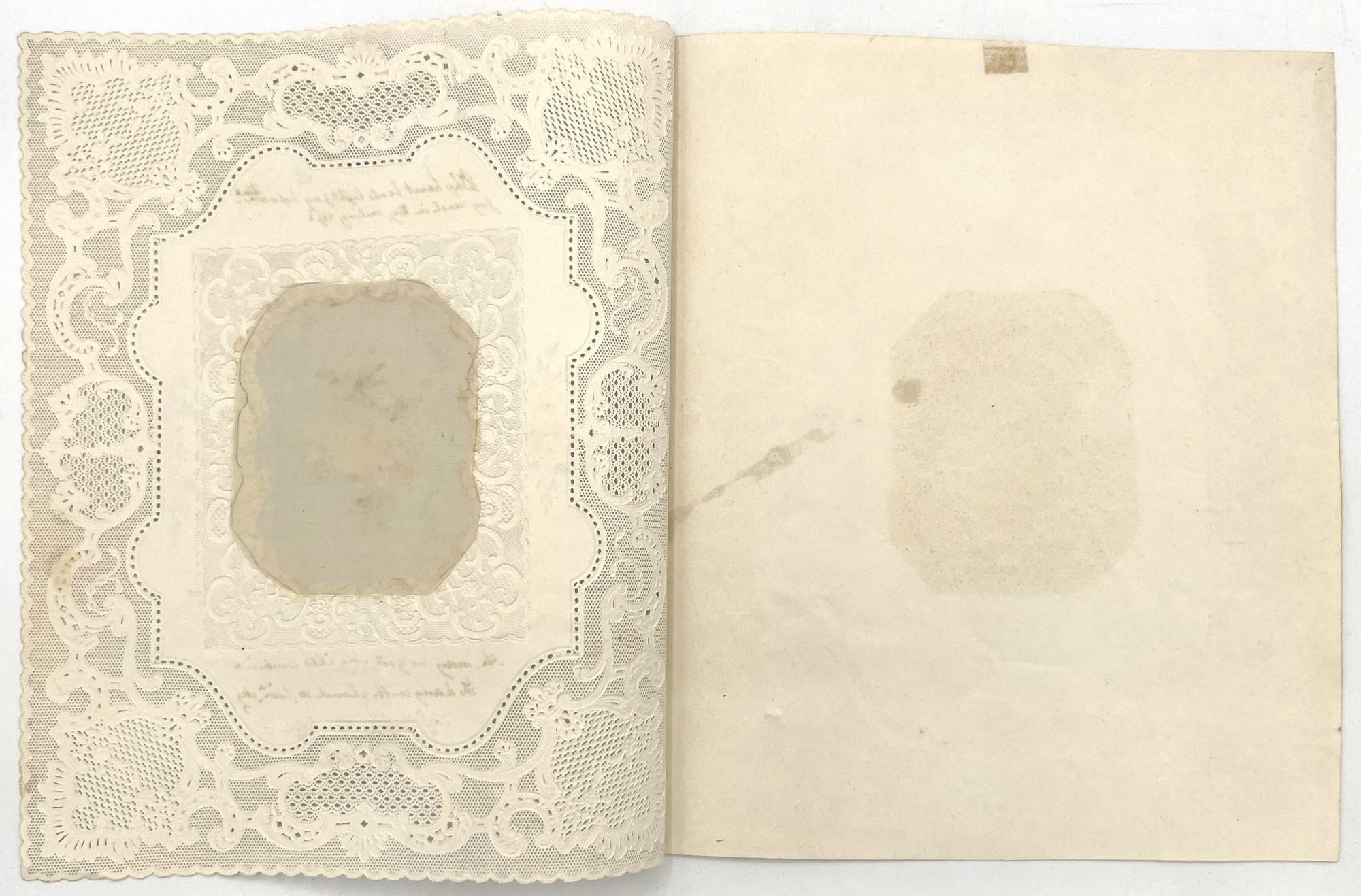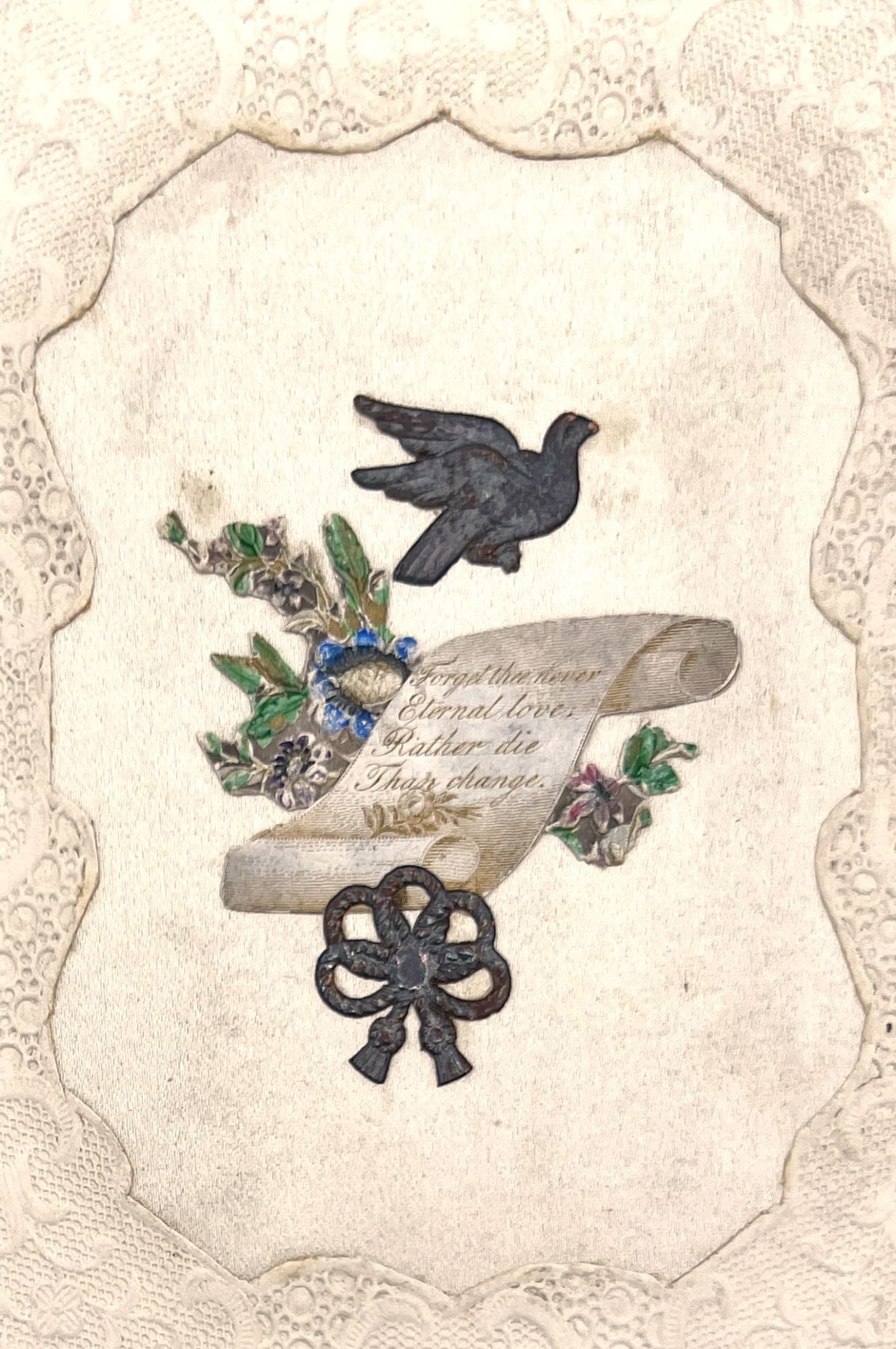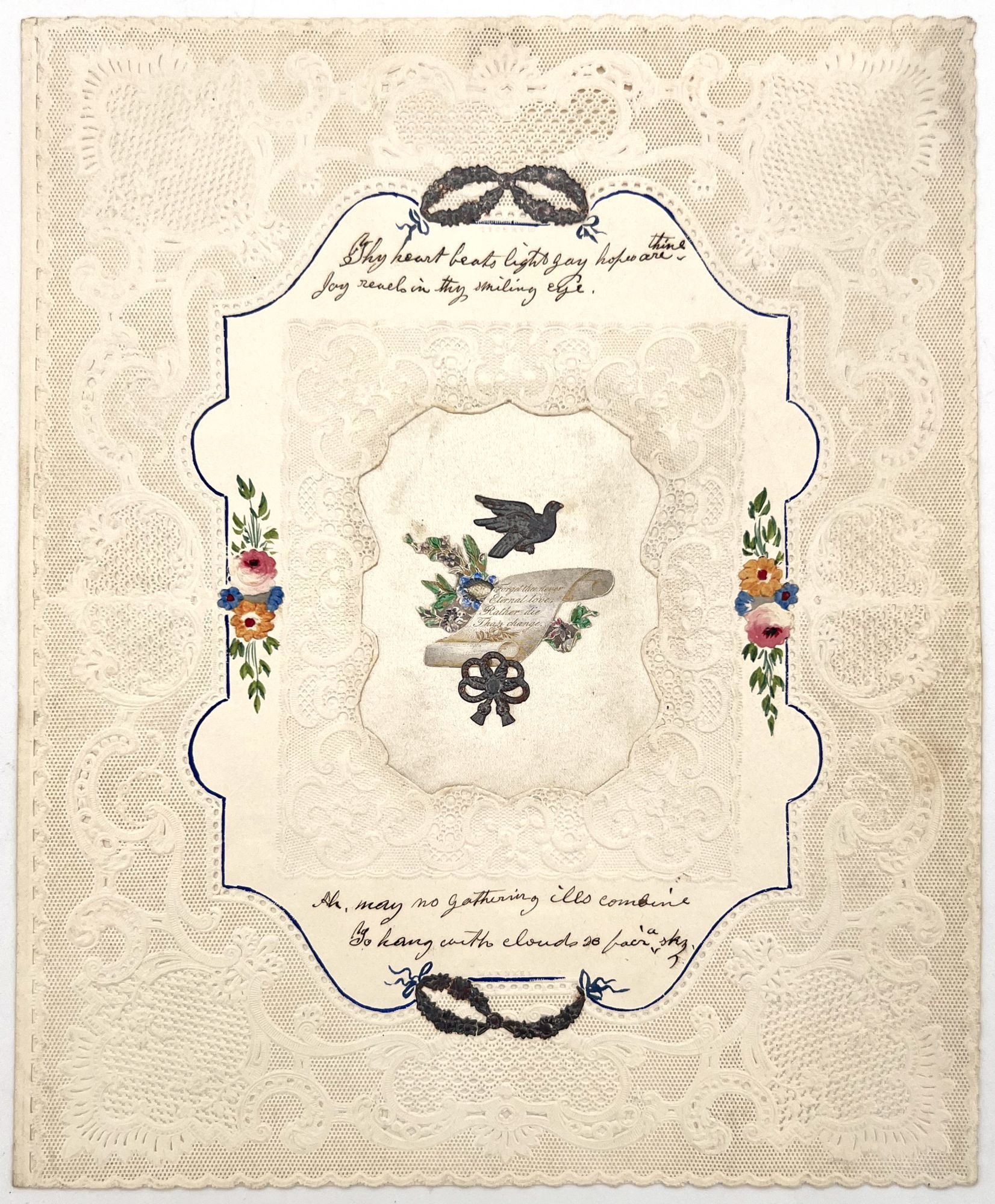 England, 1860. Very good. Toned with light dust soiling.. A particularly lovely valentine, notable for the following elements, which were less common and more expensive at the time: a particularly finely meshed lace paper; inset silk; hand water color leaves; and silver embossed Victorian scraps. There is also a poem in ink manuscript that reads, "Thy heart beats light gay hopes are thine, Joy reels in thy smiling eye. Ah, may no gathering ills combine To hang with clouds so far [in] a sky". The Victorian scrap in the center of the silk inset depicts a scroll surrounded by wildflowers with the message, "Forget thee never Eternal love, Rather die Than change." Lace paper bifolium (9" by 7.5"), with blind stamp of previous owner to second leaf.