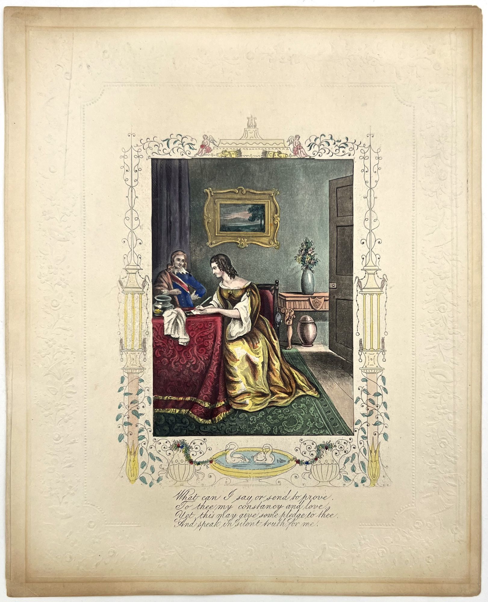 England, 1830. Very good. Light toning, a couple nicks, one short open tear to lower left-hand corner of first leaf.. A rare example of one of the valentines produced for the so-called "Unrequited Love" or "Despondent Lover" valentine set, a highly sentimental series first produced in the 1830s. Most featured despondent lovers, but some featured happy or joyful scenes of love. This example does not feature the Addenbrooke name or 1828 watermark known in other examples, but appears contemporary. This example depicts a woman in a yellow gown at a writing desk, with a poem underneath that reads: "What can I say or send to prove, To thee my constancy and love: Yet this may give some pledge to thee, And speak in silent truth for me." Wove paper bifolium with embossed decorative border (10.25" by 8"), with hand colored aquatint in center. Blind stamp of previous owner on second leaf. "On quarto size paper, each valentine of this series is adorned with a lightly embossed decorative border. The central picture of each shows a delightful aquatint, beautifully colored and finished by hand ... The set numbers fourteen in all, which was recognized as a regular 'valentine dozen'. The original publisher of this interesting series, which came out in the 1830s, is believed to be Addenbrooke" (Staff, "The Valentine and its Origins", p. 62).