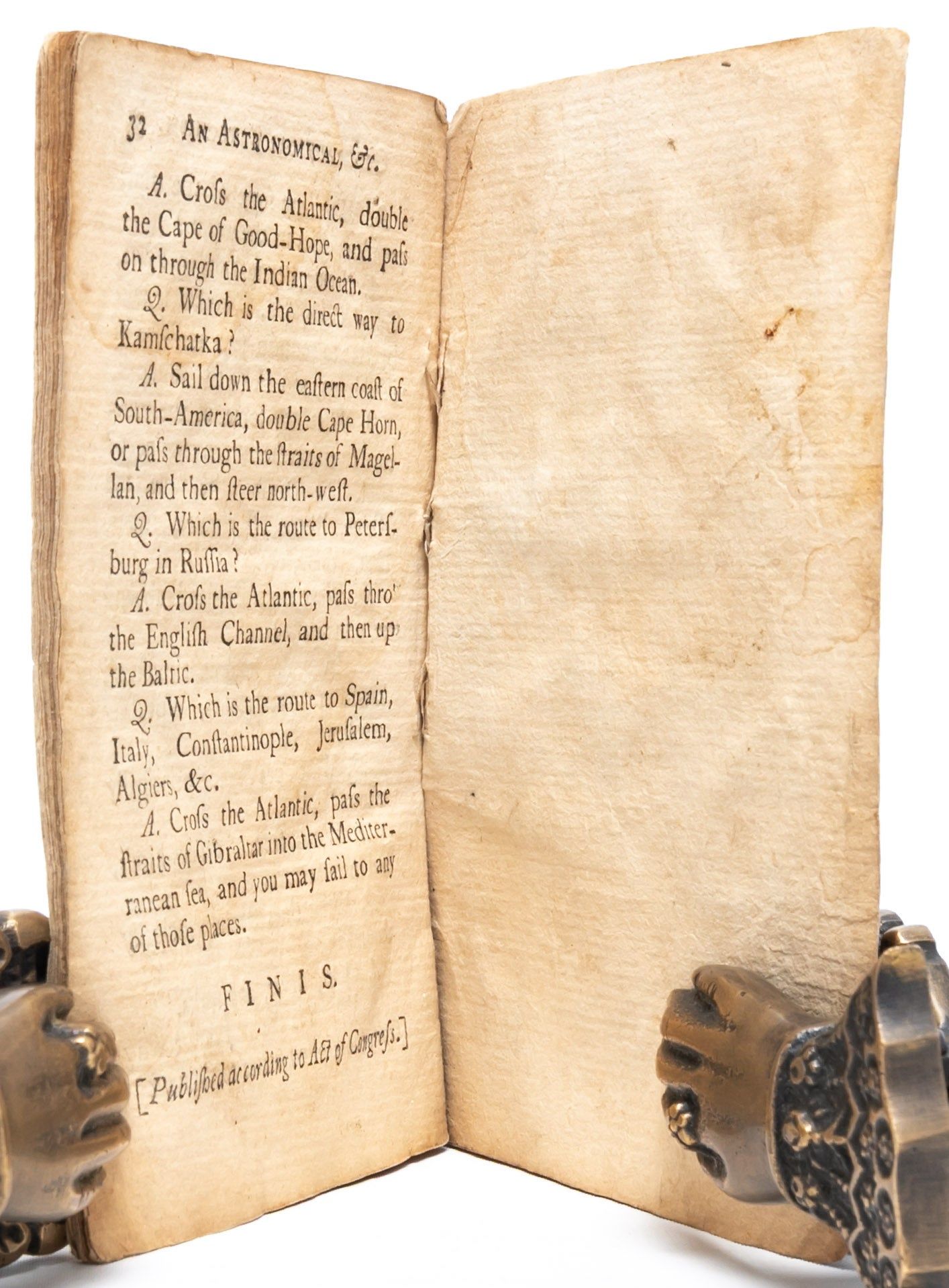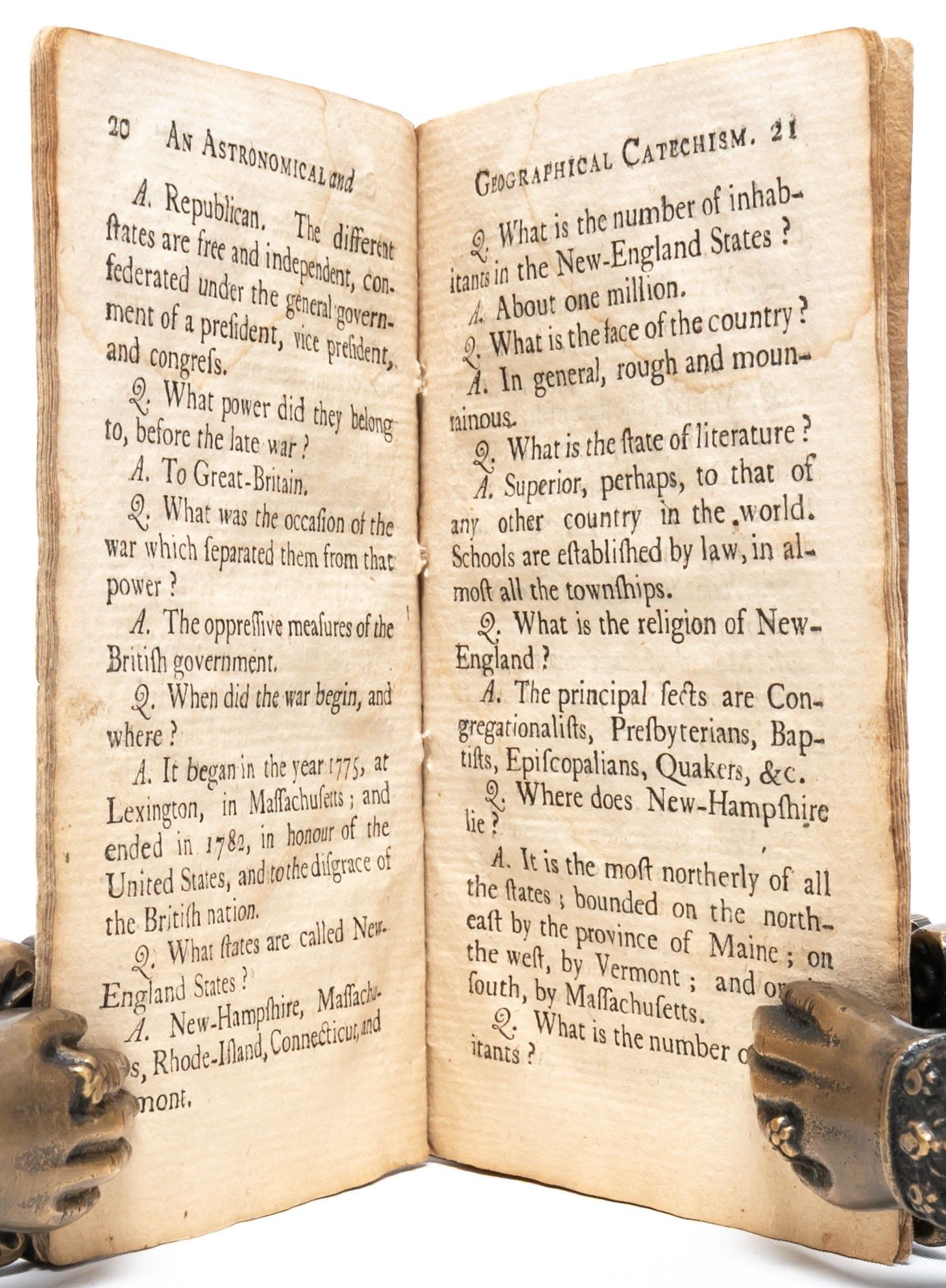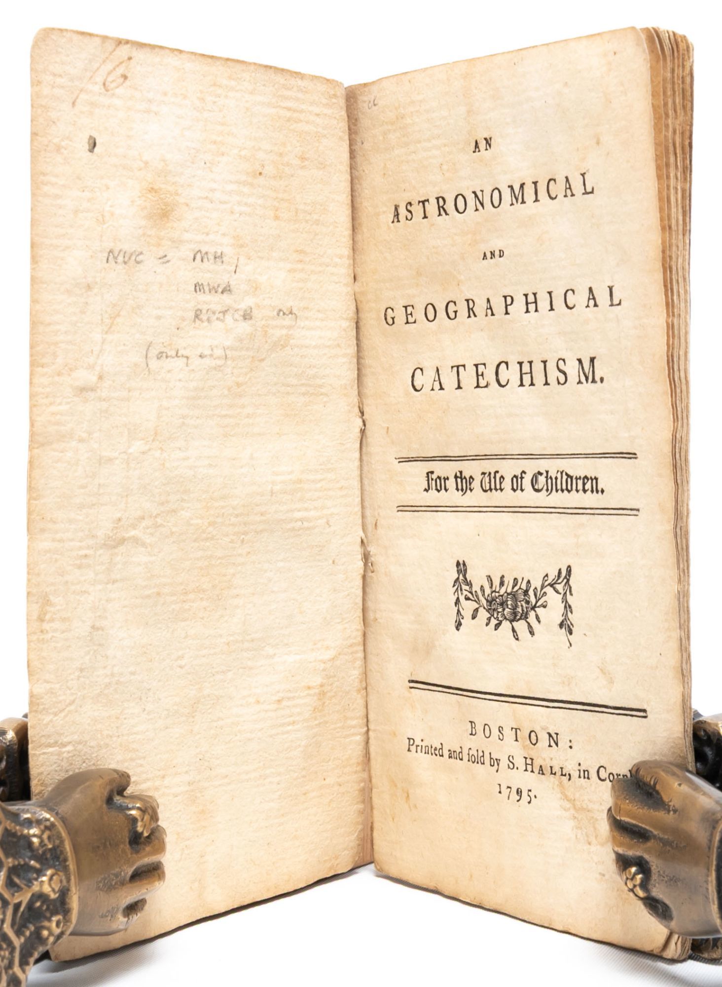 Seemingly the first educational work on astronomy published in the United States, An Astronomical and Geographical Catechism was "arranged as a series of questions and answers designed to be memorized and recited by rote, this popular 'catechism' sheds light on the astronomical and geographical knowledge deemed important for young Americans in the 1790s – when there were seven planets (one of which was named "Herschel"), fifteen United States, and the nation's western boundary was defined by the Mississippi River. The author, Caleb Bingham, was a schoolmaster at Moor's Indian Charity School (which became Dartmouth College), as well as a private girls' school in Boston" (John Carter Brown Library).