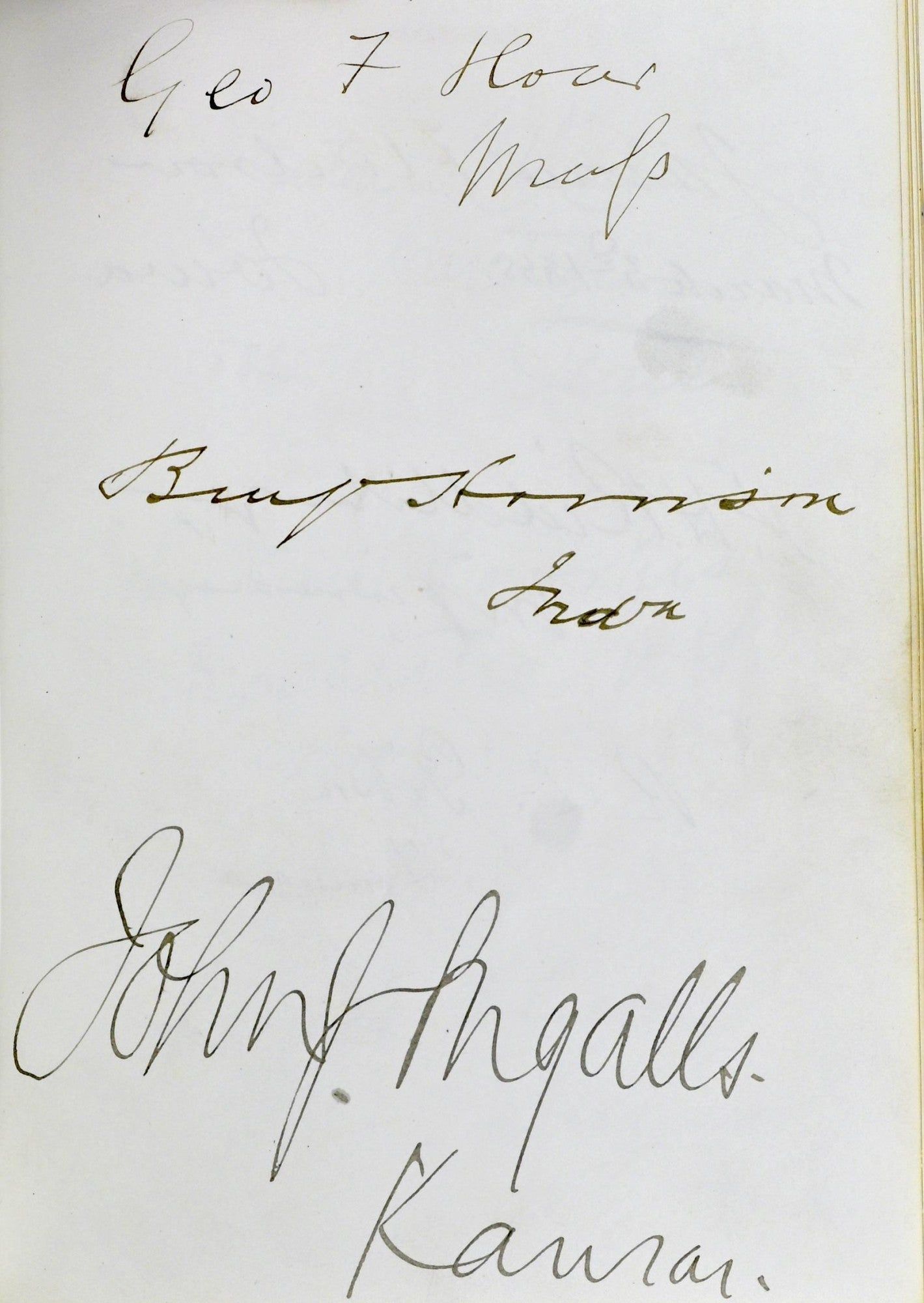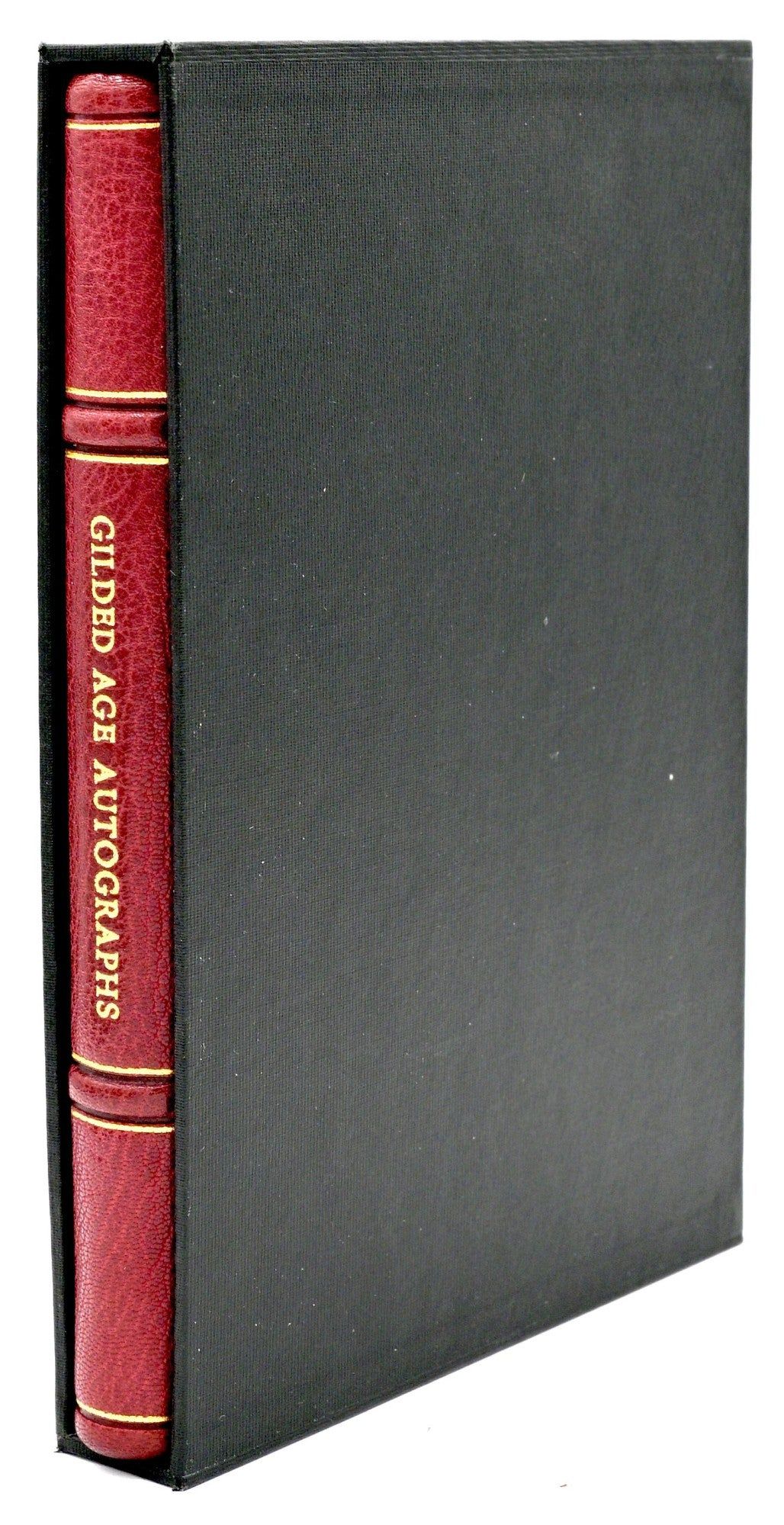 1882. Fine binding. Finely bound autograph books containing nearly 300 signatures of politicians from the year 1882, the early period of the Gilded Age.~~Among these signatures are:~ Benjamin Harrison (President in 1889)~Two cabinet members:~ Frederick Frelinghuysen (Sec. of State); Samuel Kirkwood (Interior)~Eight members of the Supreme Court:~ Morroson R. Waite (Chief Justice) Joseph P. Bradley; Stephen J. Field;Horace Gray; John M. Harlan; Stanley Matthews; Samuel A. Miller; William B. Woods~Nine senators, including~ William B. Allison who was to become one of the powerful “Big Four” in the 1890s; along with David Davis; George Hoar, James Ingalls; George H. Pendleton; Matthew W. Ransom; Leland Stanford; Zebulon Vance; and David Voorhees~Seven members of the House of Representative, including~ Joesph Warren Keifer (Speaker); Thomas B. Reed (later Speaker); Samuel “Sunset” Cox; Joseph Jorgensen; Van H. Manning; John Randolph Tucker (grandson of St. George Tucker); George D. Wise (nephew of Governor Henry A. Wise).~~A panoply of major figures of our nation’s Gilded Age, in a lovely binding of burgundy crushed morocco with raised bands and rules and titling in gilt; housed in a black cloth slipcase. From the library of Civil War historian Gary W. Gallagher.~~. Fine binding.