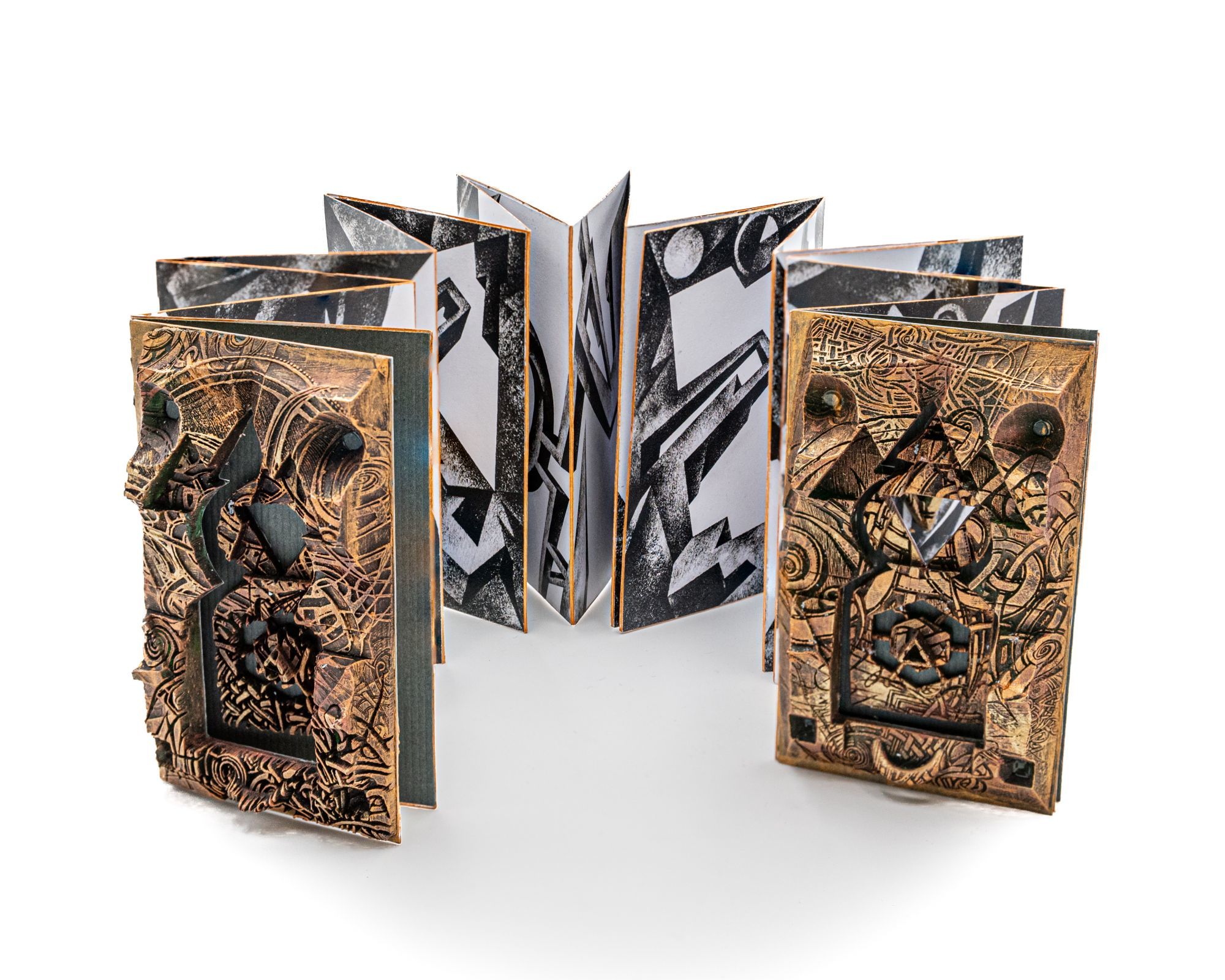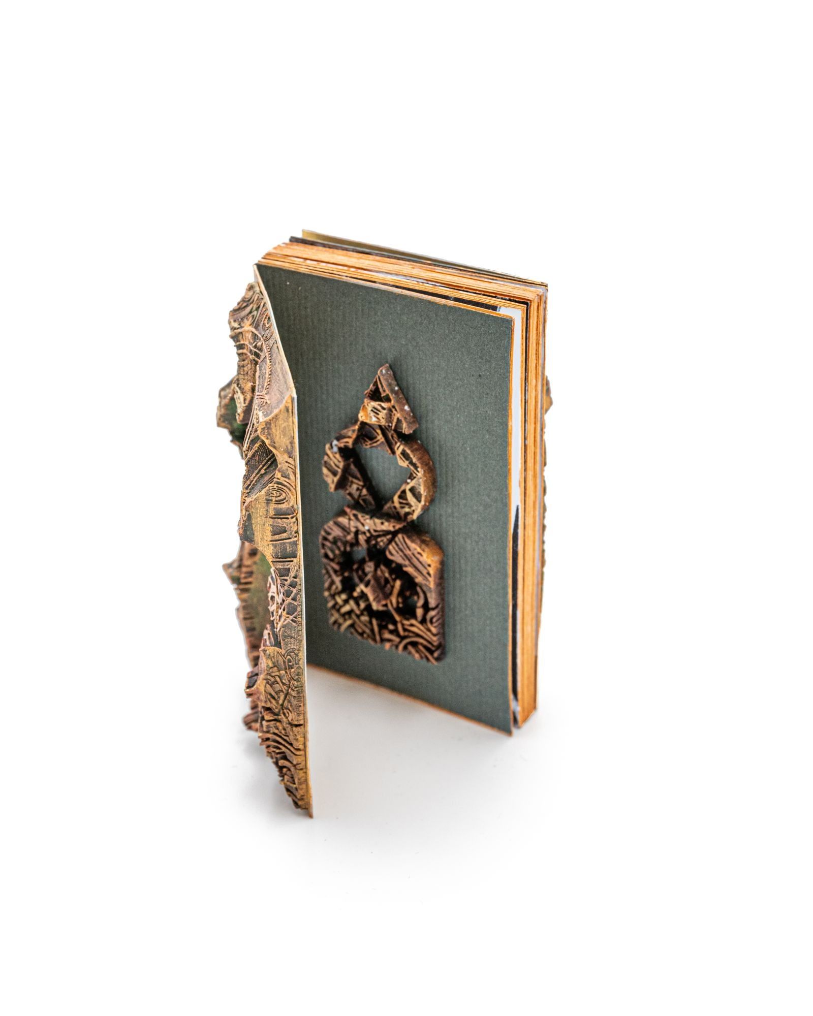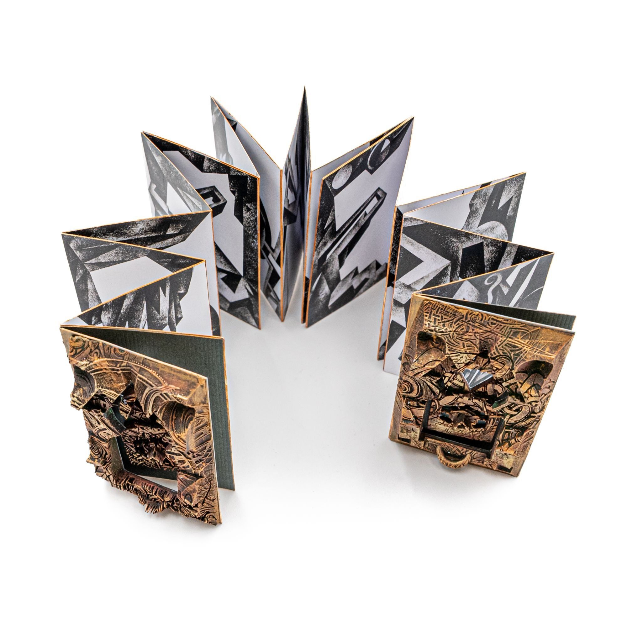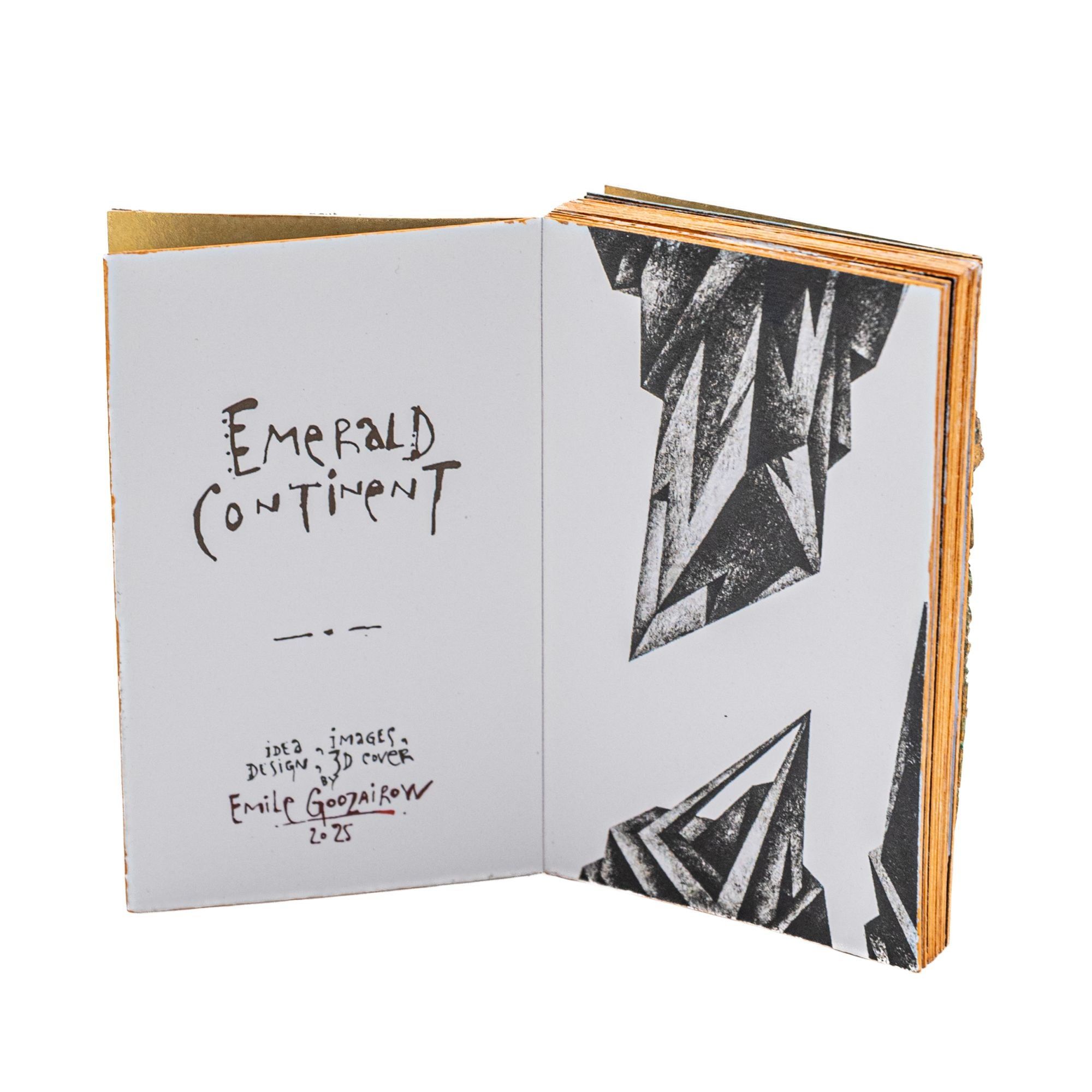 Goozairow's Emerald Continent" is a dramatic and interesting work from this important book artist. The digitally printed book was designed as a mixed-media fine art piece featuring an "Emerald Continent" theme with elaborate 3D-printed covers in a complex design. The book has an accordion structure and is composed of the black and gray architectural letters that make up the elements of this mysterious fantastic continent. The book also includes symbols representing themes of social justice, cultural repatriation, and the history of colonialism. In fine condition. Measures 2.36 x 3.93 inches. ARTB/090225.
