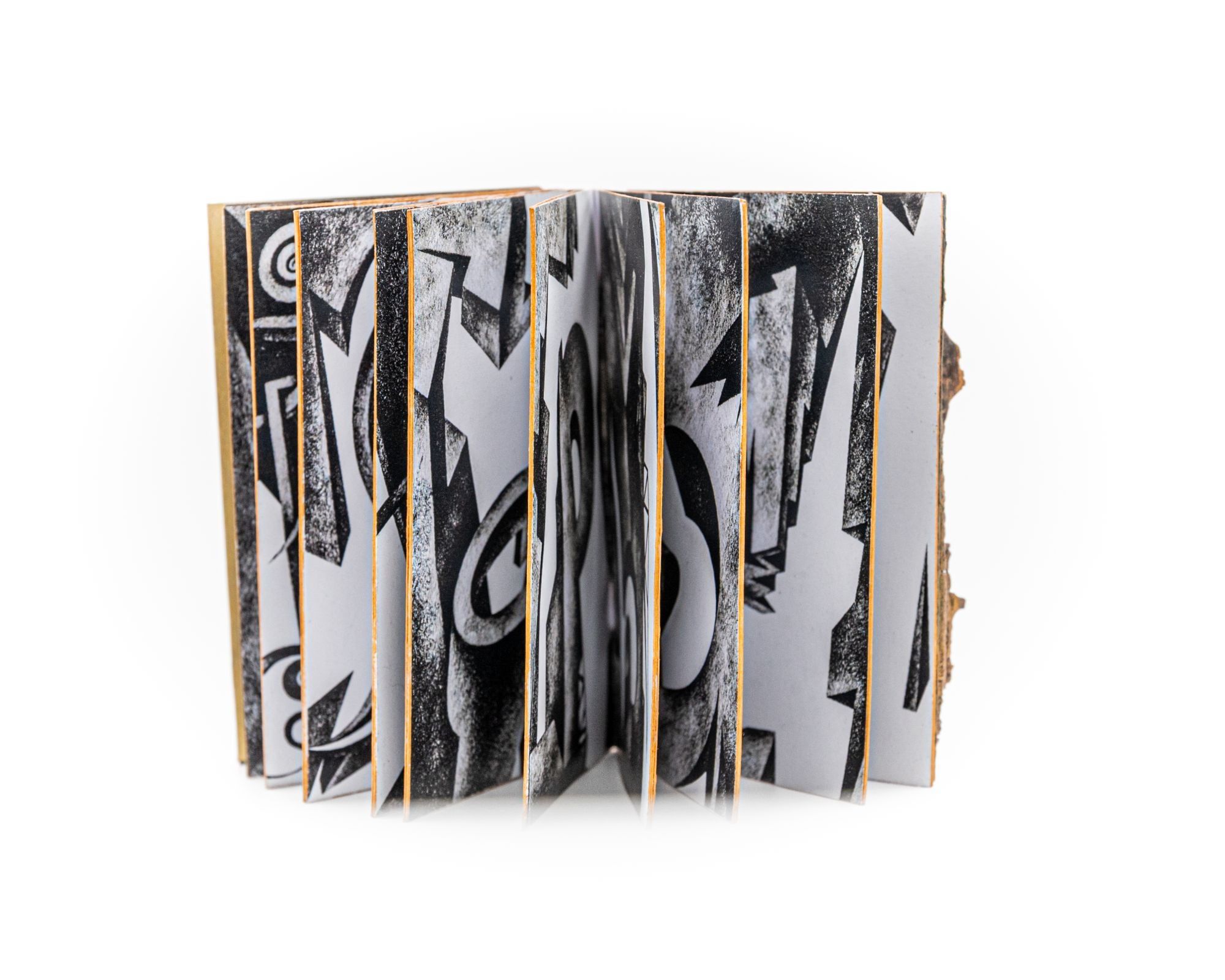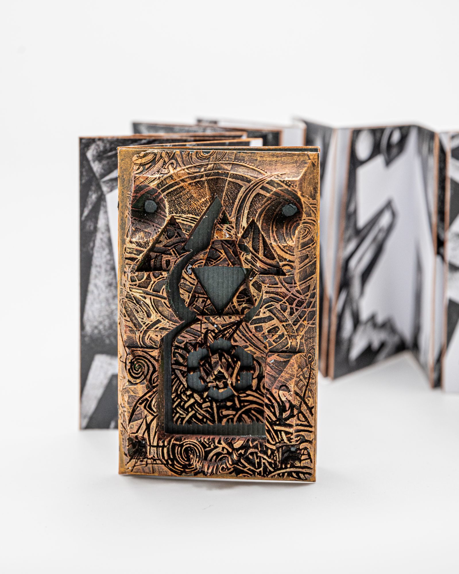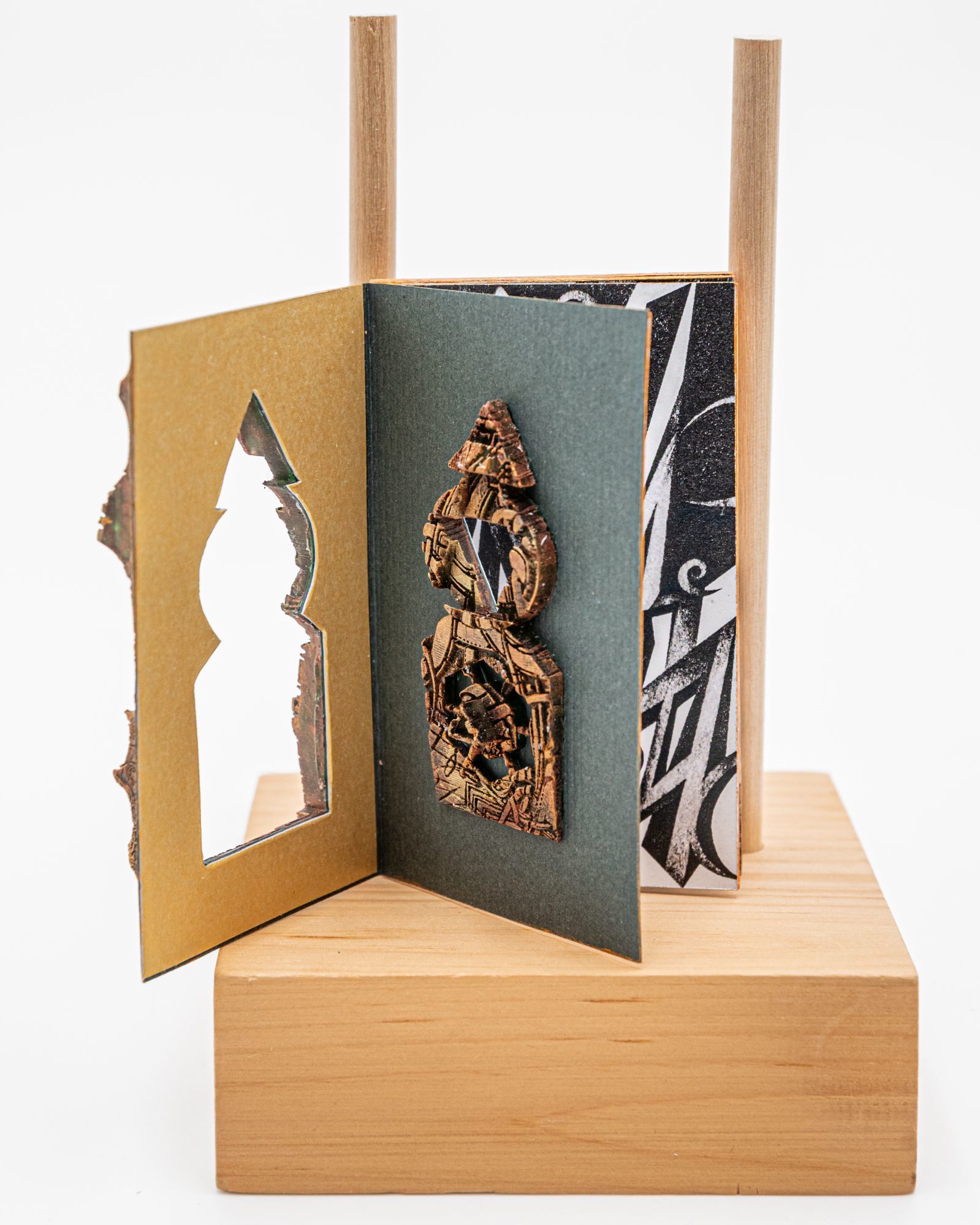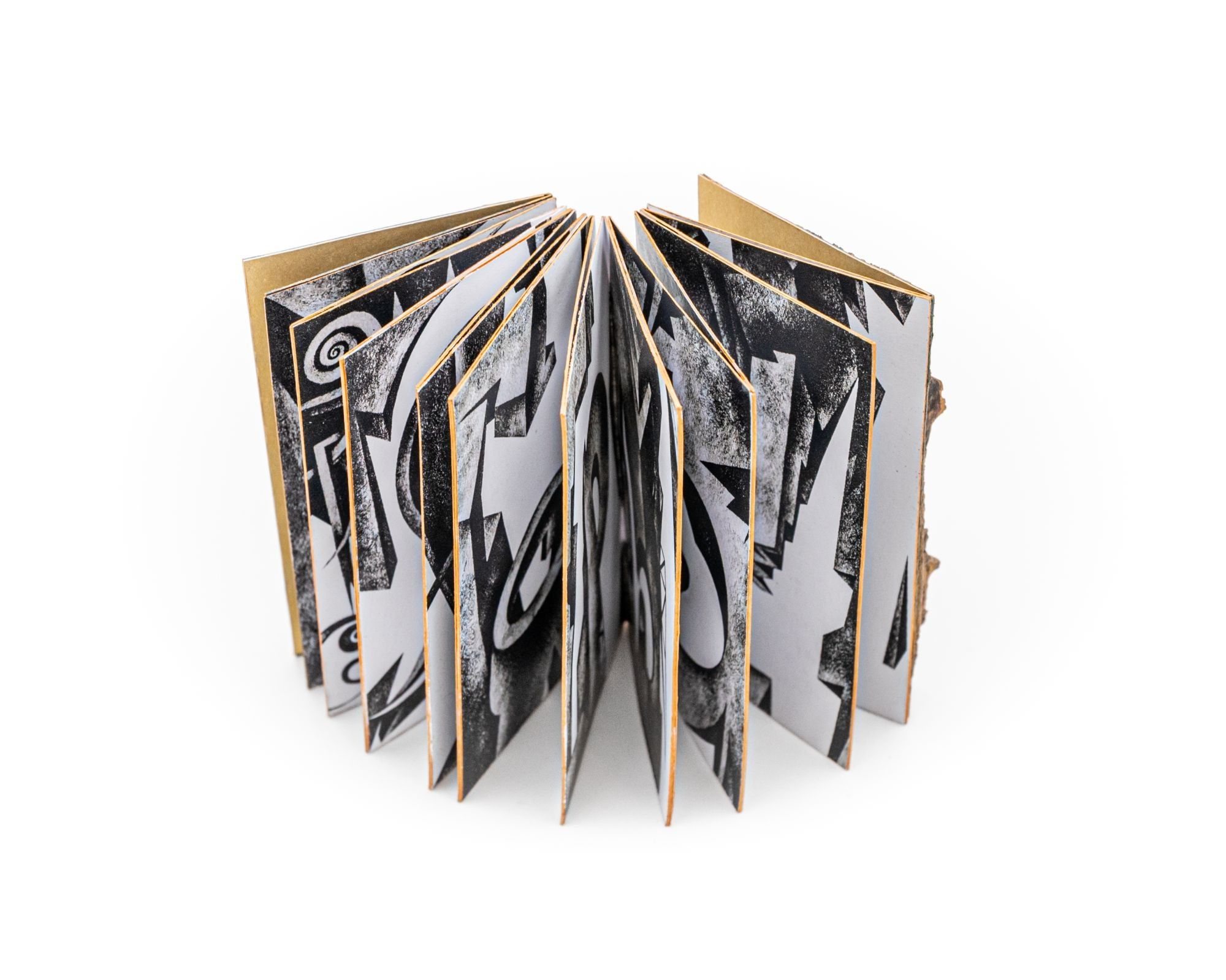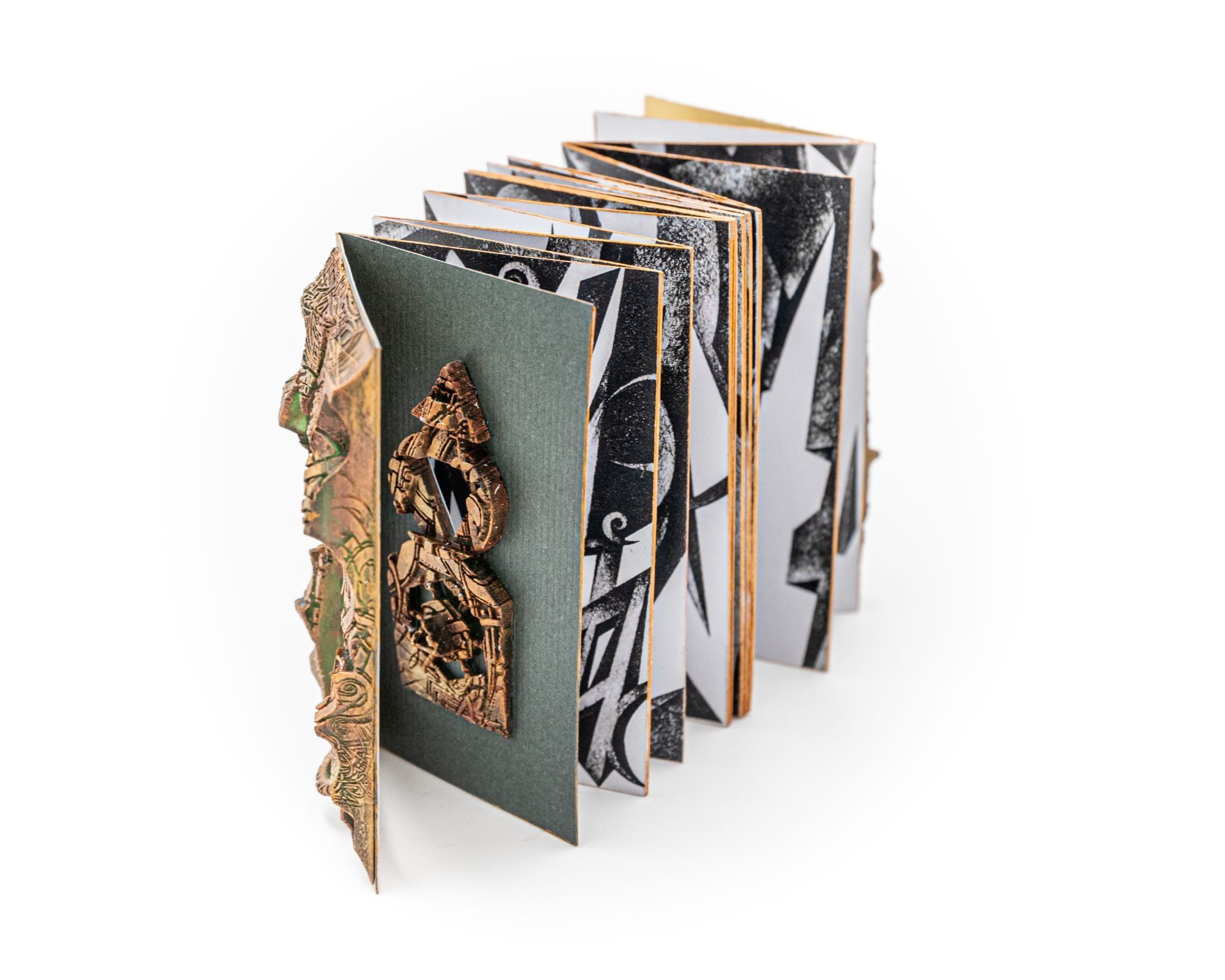 Goozairow's Emerald Continent" is a dramatic and interesting work from this important book artist. The digitally printed book was designed as a mixed-media fine art piece featuring an "Emerald Continent" theme with elaborate 3D-printed covers in a complex design. The book has an accordion structure and is composed of the black and gray architectural letters that make up the elements of this mysterious fantastic continent. The book also includes symbols representing themes of social justice, cultural repatriation, and the history of colonialism. In fine condition. Measures 2.36 x 3.93 inches. ARTB/090225.