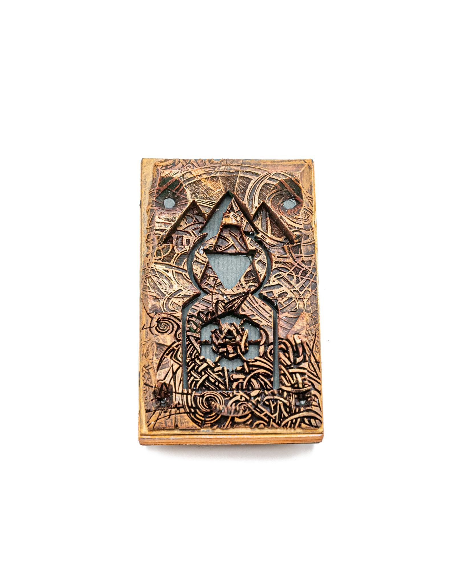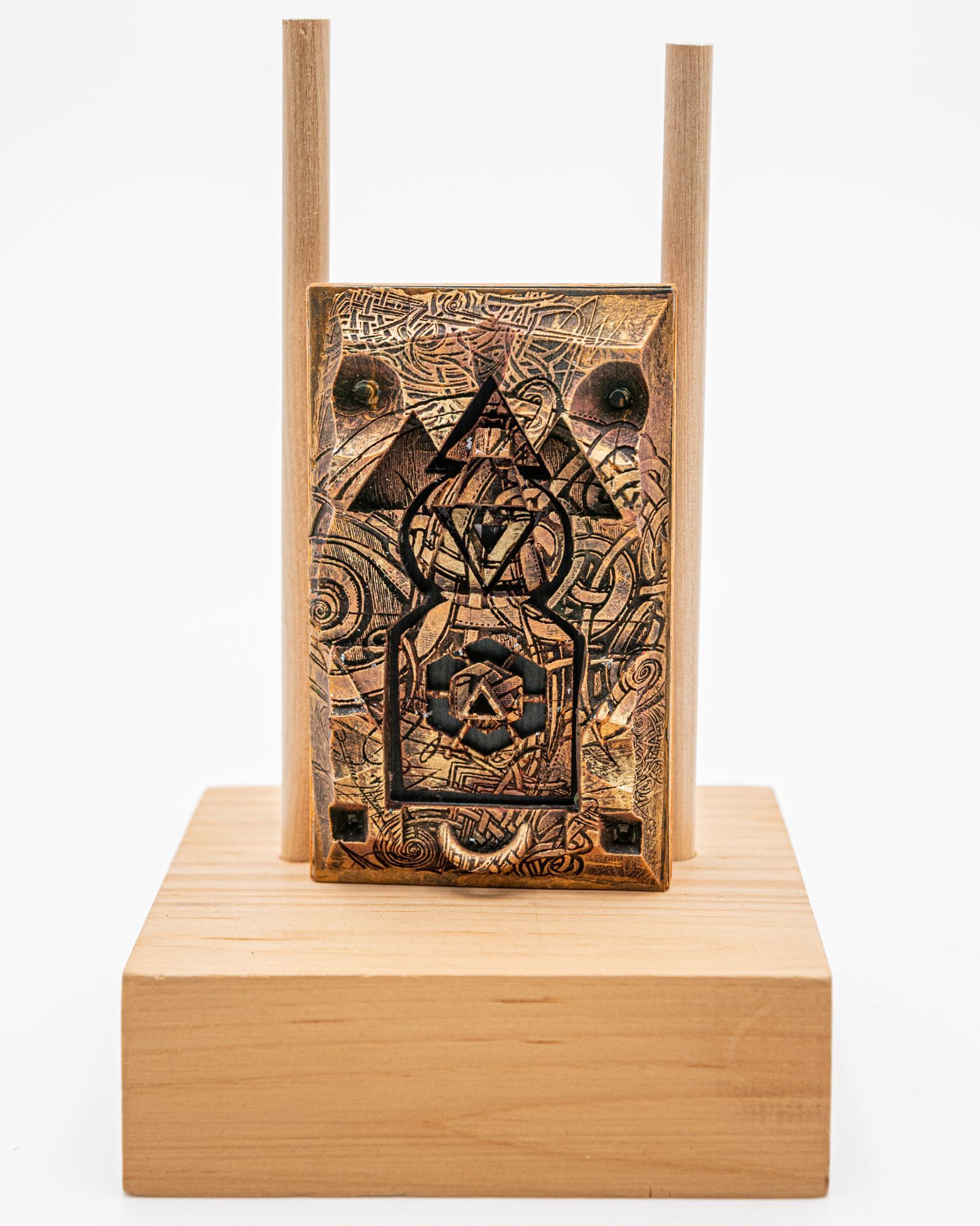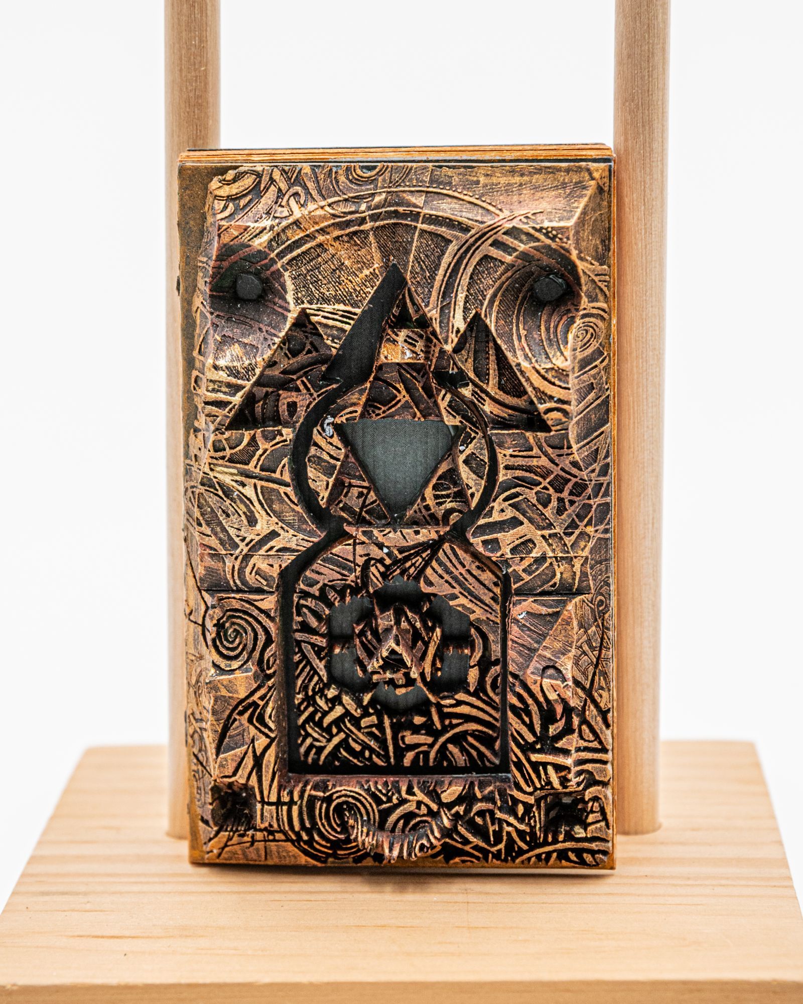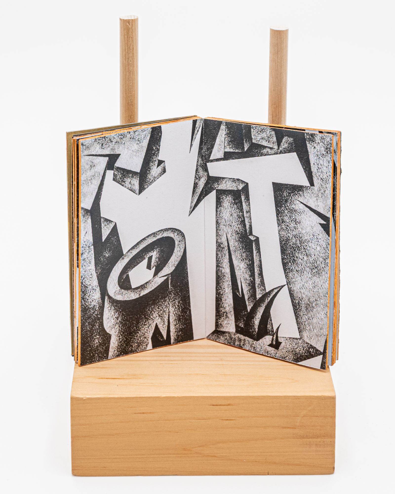 Goozairow's Emerald Continent" is a dramatic and interesting work from this important book artist. The digitally printed book was designed as a mixed-media fine art piece featuring an "Emerald Continent" theme with elaborate 3D-printed covers in a complex design. The book has an accordion structure and is composed of the black and gray architectural letters that make up the elements of this mysterious fantastic continent. The book also includes symbols representing themes of social justice, cultural repatriation, and the history of colonialism. In fine condition. Measures 2.36 x 3.93 inches. ARTB/090225.