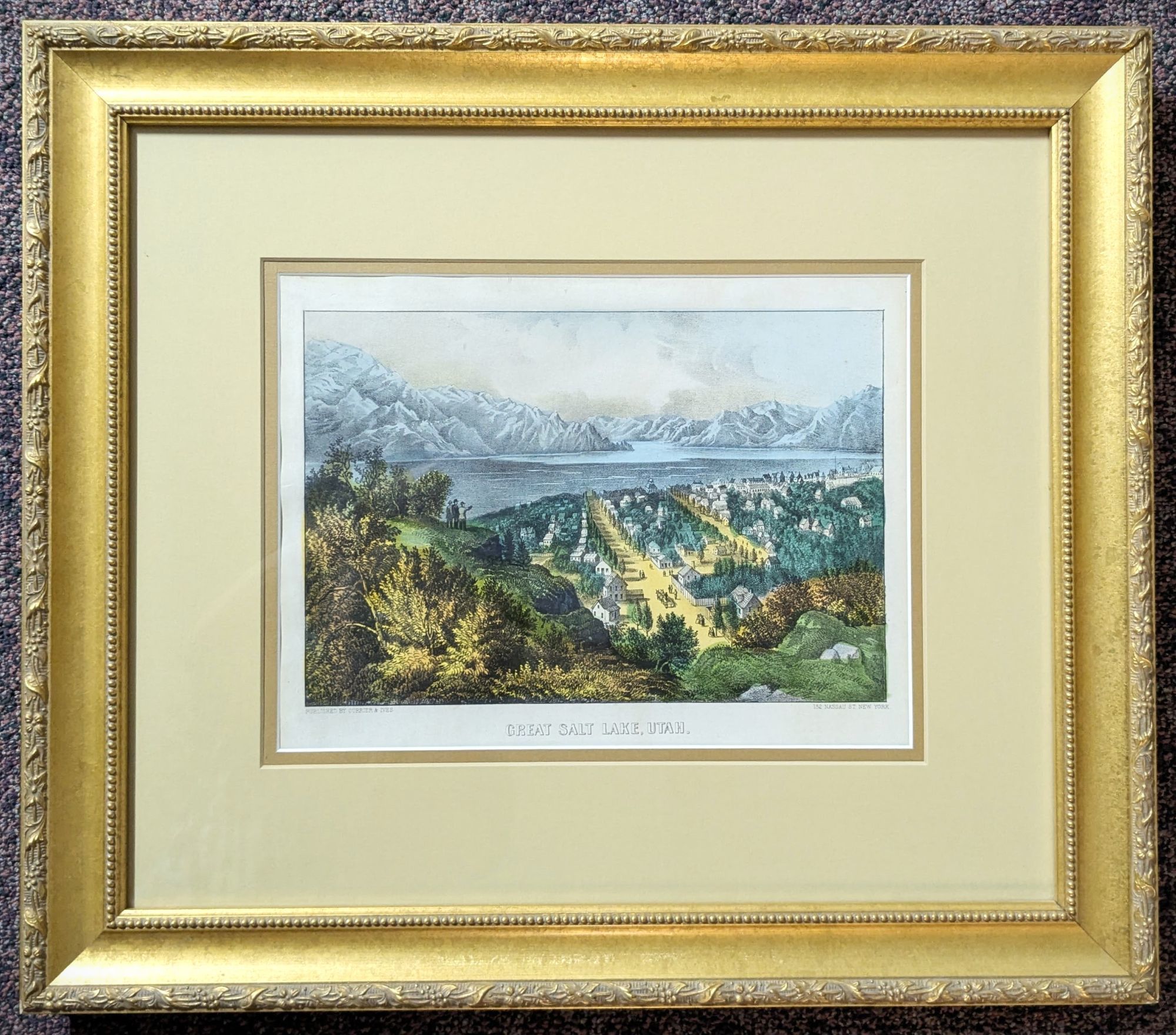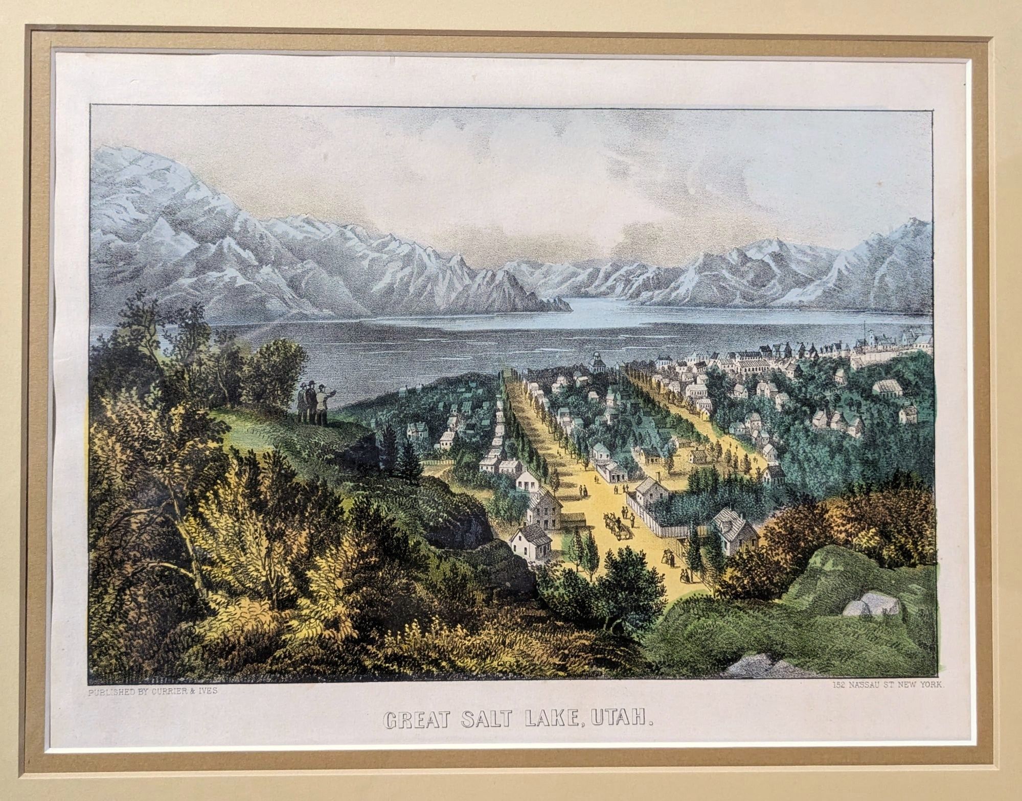 152 Nassau St., New York: Currier & Ives, 1870. Print. Near Fine. Colored lithograph. Print is matted and framed. Printed measures approximately 9" x 12.5". Frame measures 21" x 24". Nice, clean, and bright. A beautiful and colorful, but ultimately absurd view of Salt Lake City showing the city built right up against the shores of the Great Salt Lake. While still lovely to look at and fun to observe, it is clear that the esteemed printmakers at Currier & Ives never set foot in this part of the world.