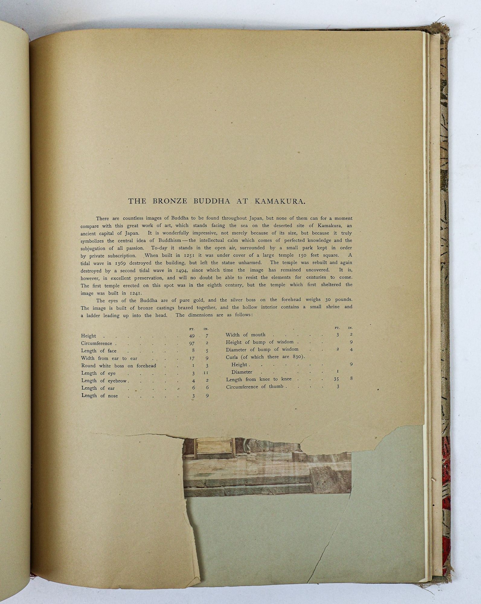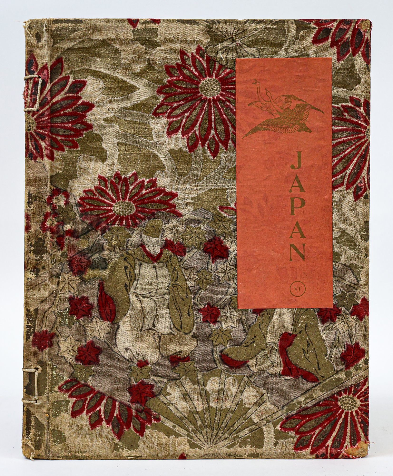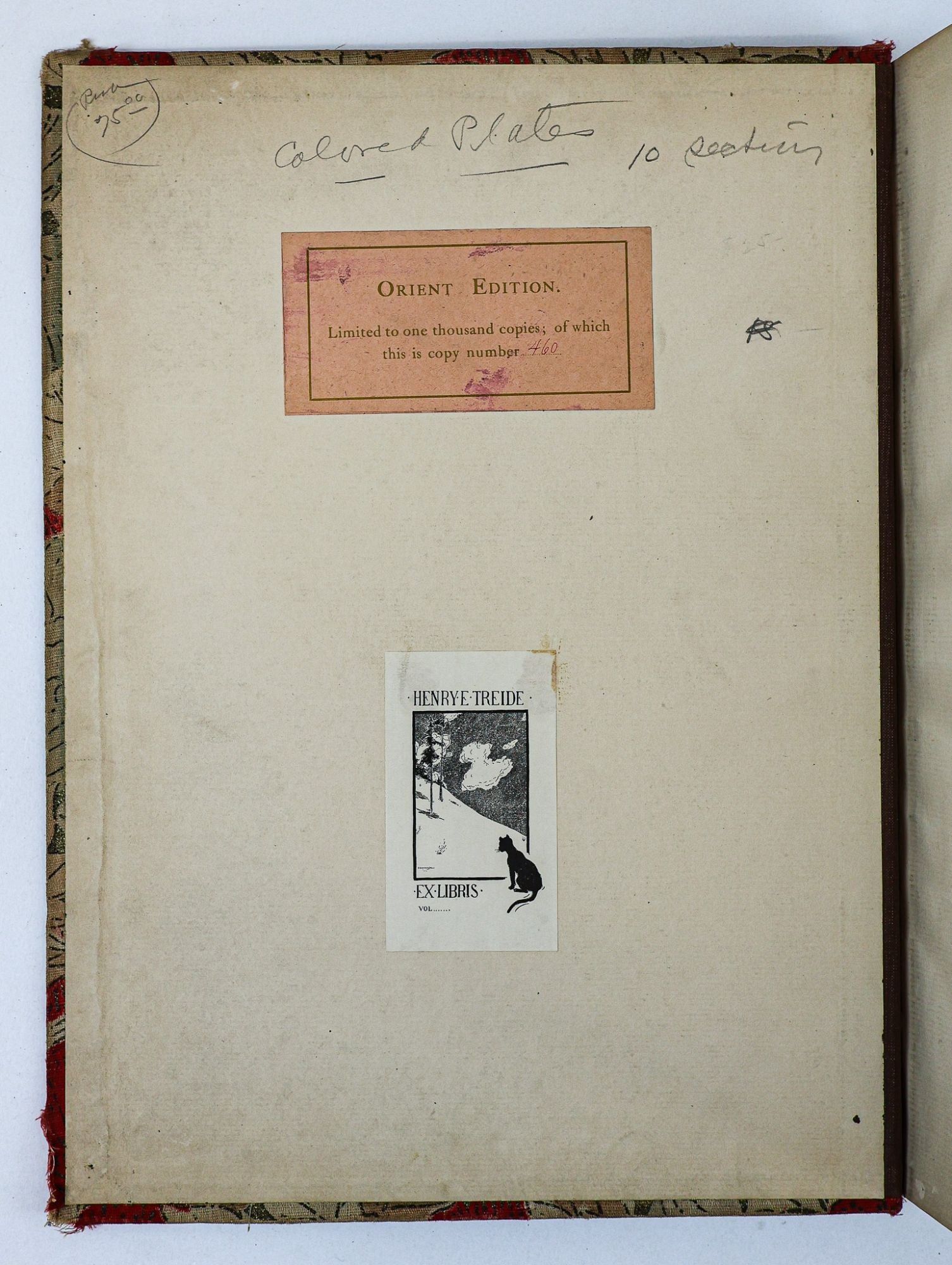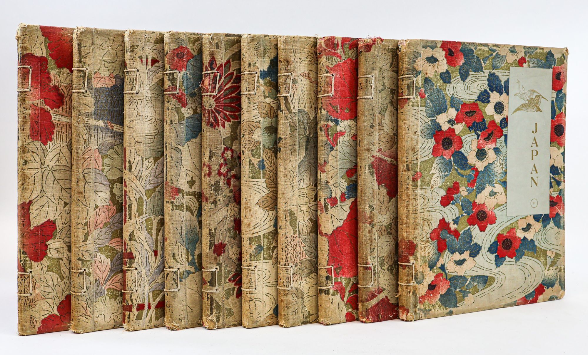 Boston: J. B. Millet Company, 1897. Orient Edition, #460/1000. Hardcover. Folio, ten volumes. In Good condition. Bound in traditional “fukuro-toji” binding (pouch-binding), and covered in full brocaded cloth, each with a unique floral pattern. Front boards have paper labels with gilt lettering. All boards have fraying and tears to extremities, soiling primarily to spines, denting to edges, and fading throughout. These volumes are ex-library books. Some boards have mild adhesive wear along the bottom joint, presumably from old library labels. All textblocks have library stamps and pencil marks to the copyright pages, library cards and pockets adhered to the rear pastedowns, several instances of light off-setting from plates, light age toning, and tears to the edges of some pages (not impacting text). Textblock of volumes 1-4, 6-10 have the bookplate of “Henry E. Treide” to the front pastedowns, and volume 5 has the same bookplate to the rear free end page. Volume 1 textblock has a large open tear to the page titled “Bronze Buddha at Kamakura” (not impacting text). Volume 2 textblock has a hole to the front free end page. Volume 10 has some pages that have been cut, presumably from a previous owner who did not know the folded pages were intentional. Shelved in Room F.