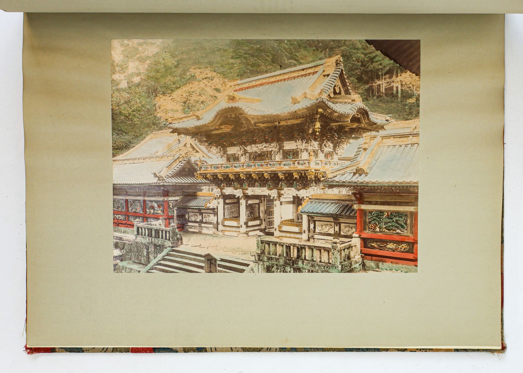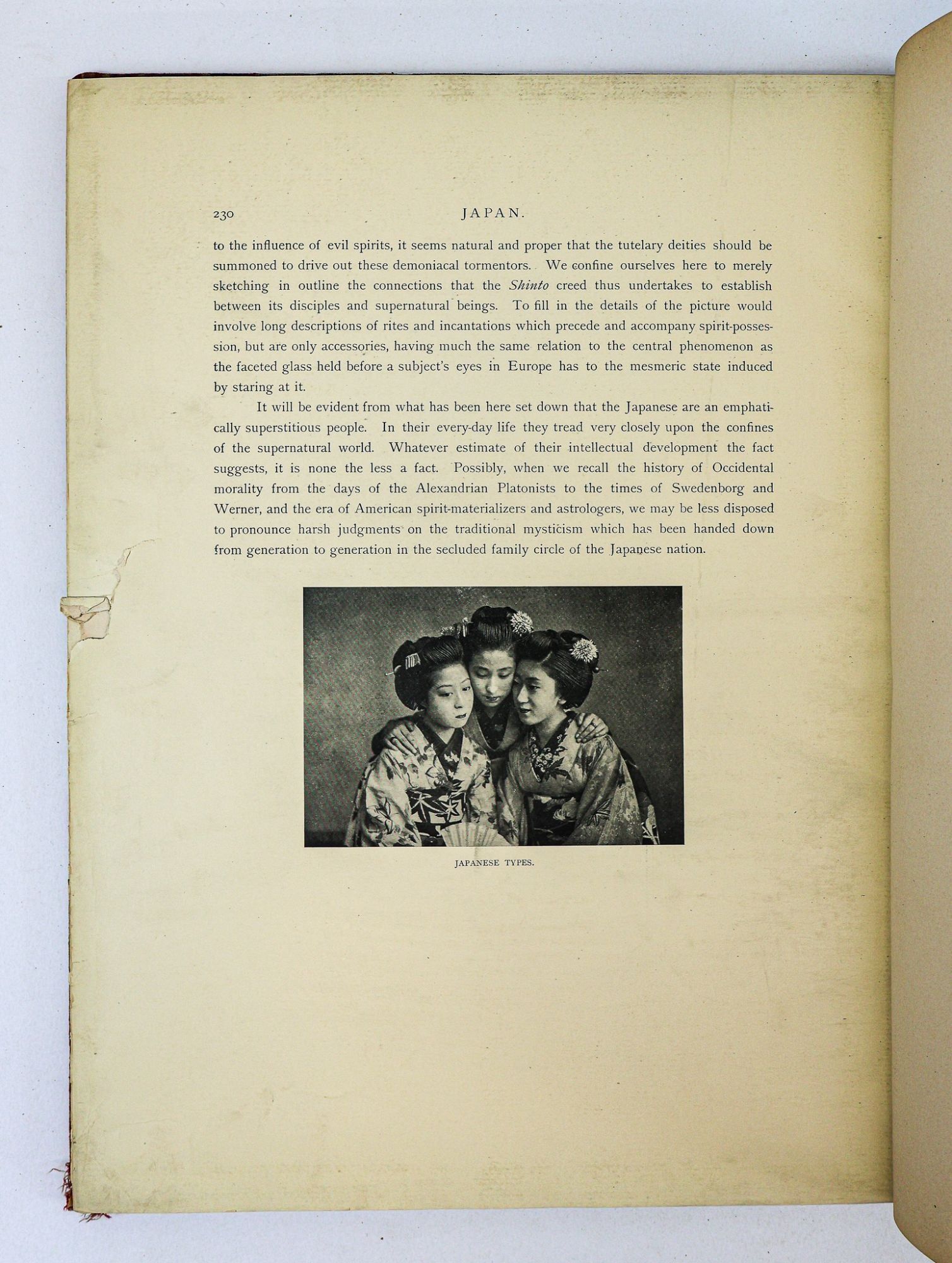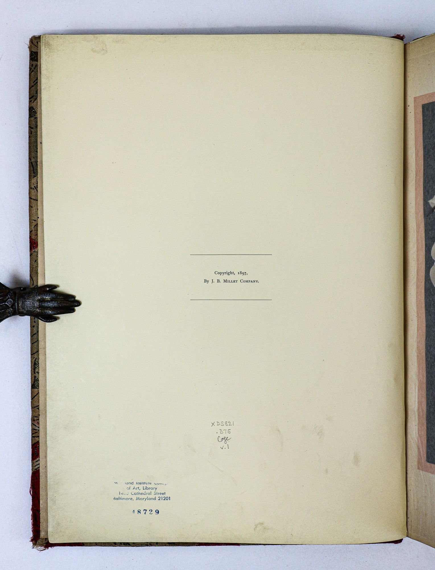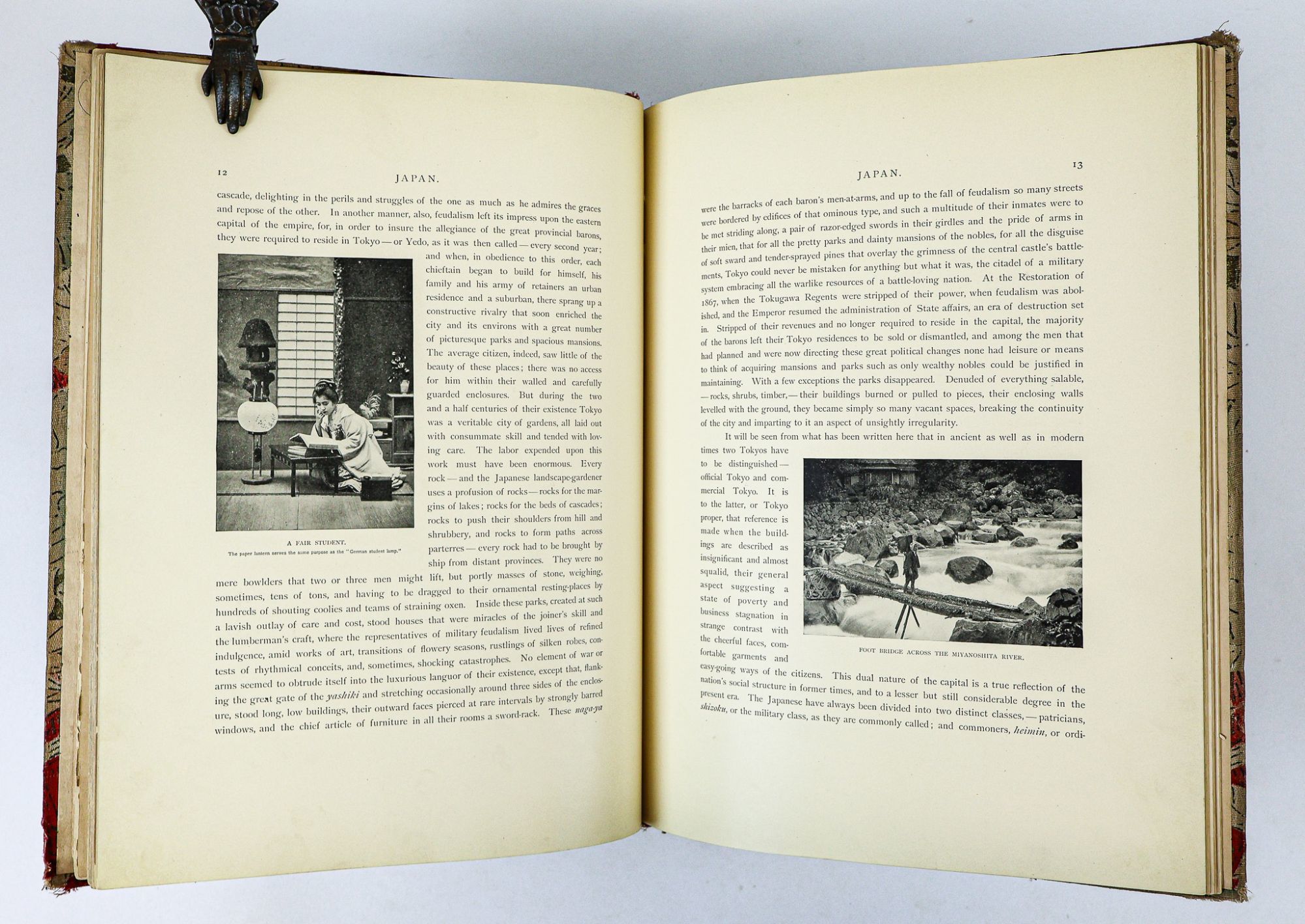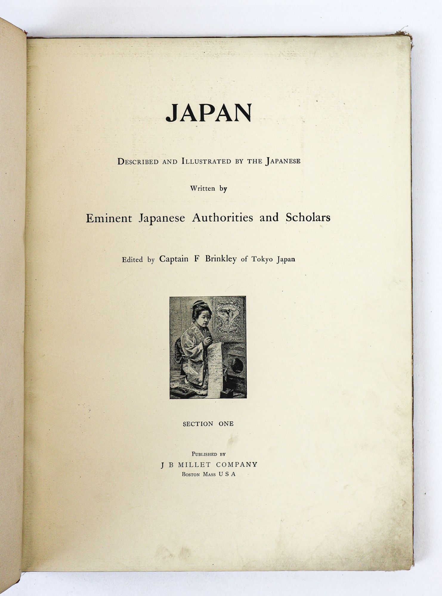 VOL I: (34 pages, plus a frontispiece and 3 plates);-- VOL II: (35-74 pages, plus a frontispiece and 3 plates);-- VOL III: (75-112 pages, plus a frontispiece and 3 plates);-- VOL IV: ( 113-152 pages, plus a frontispiece and 3 plates); VOL V: (153-190 pages, plus a frontispiece and 3 plates);-- VOL VI: (191-230 pages, plus a frontispiece and 3 plates);-- VOL VII: (231-268, plus a frontispiece and 3 plates);-- VOL VIII: (269-308, plus a frontispiece and 3 plates);-- VOL IX: (309-346 pages, plus a frontispiece and 3 plates);-- VOL X: (347-382, plus a frontispiece and 3 plates). Frontispieces are colored collotype prints of flowers. Plates are hand-colored albumen prints. "Japan: Described and Illustrated by the Japanese" was a multi-volume series of books published by the J. B. Millet Company between 1897 and 1898. The project was conceived by publisher Josiah Byram Millet, who secured financial backing from the Japanese government. The series is notable for its use of over a million hand-colored albumen prints, a more expensive and time-consuming process than the photomechanical methods common at the time. Although not credited, the photographs were supplied by the commercial photographer Tamamura Kozaburo, who reportedly hired more than 350 assistants to fulfill the large order. The text contributions from Japanese scholars were organized and translated by Captain Francis Brinkley. There were at least 16 different folio multi-volume editions released. 1403872. Special Collections.