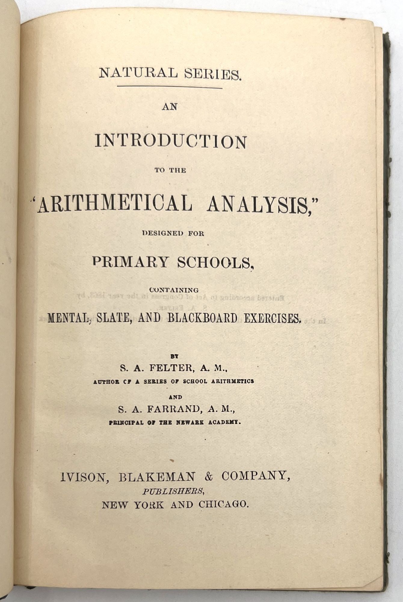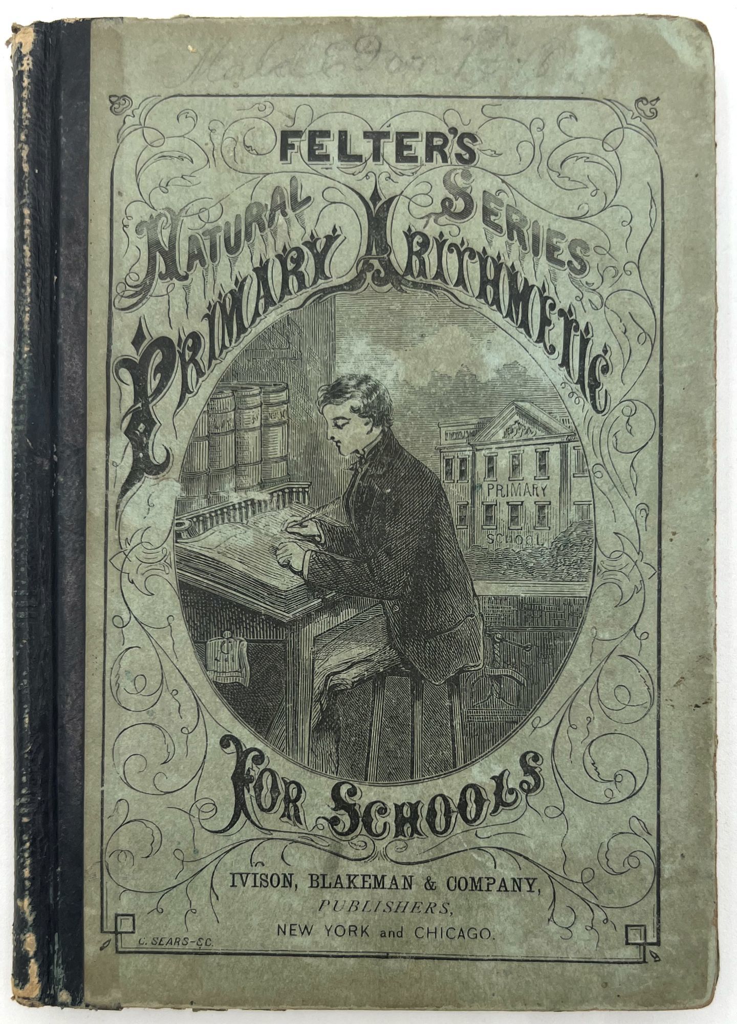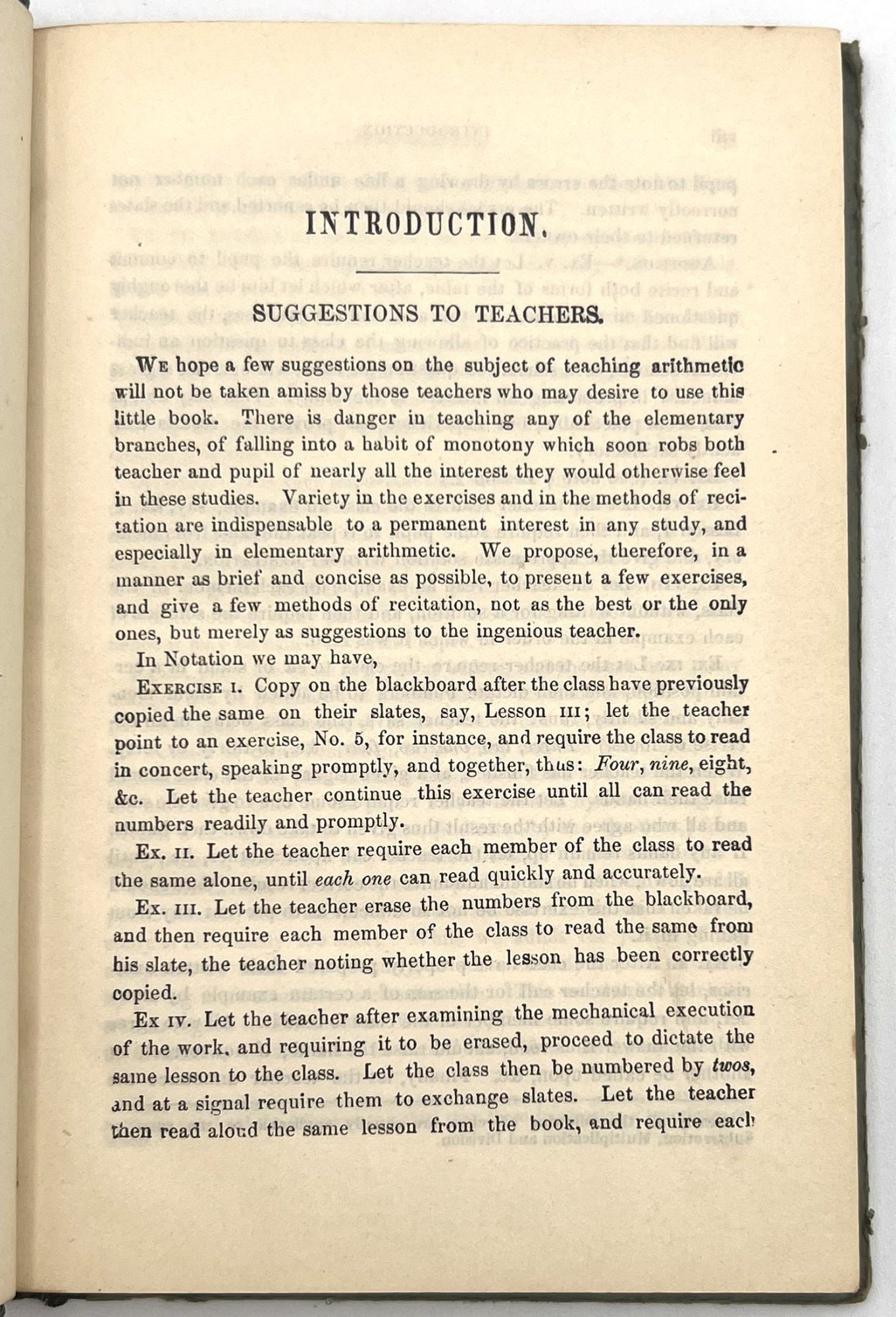 New York and Chicago: Ivison, Blakeman & Company, 1863. Fair to good, internally bright and clean. Extremities rubbed with dust soiling, some points of wear.. An arithmetic book for elementary school students, published in 1863. Includes "mental, slate, and blackboard exercises" for children divided into sections including addition, subtraction, multiplication, and division. Also includes brief sections on currency, linear and cubic measure, and fractions. Single vol. (6.5" by 4.5"), pp. 182, in-text illustrations including topical headpieces, in original illustrated boards backed in leather with image of boy at desk on front and advertisement for Webster's Unabridged Dictionary on the back. Contemporary inscription to front free endpaper ("Mabel Egleston, Croton Landing New York") and pencil inscription to upper board ("Mabel D[?]").