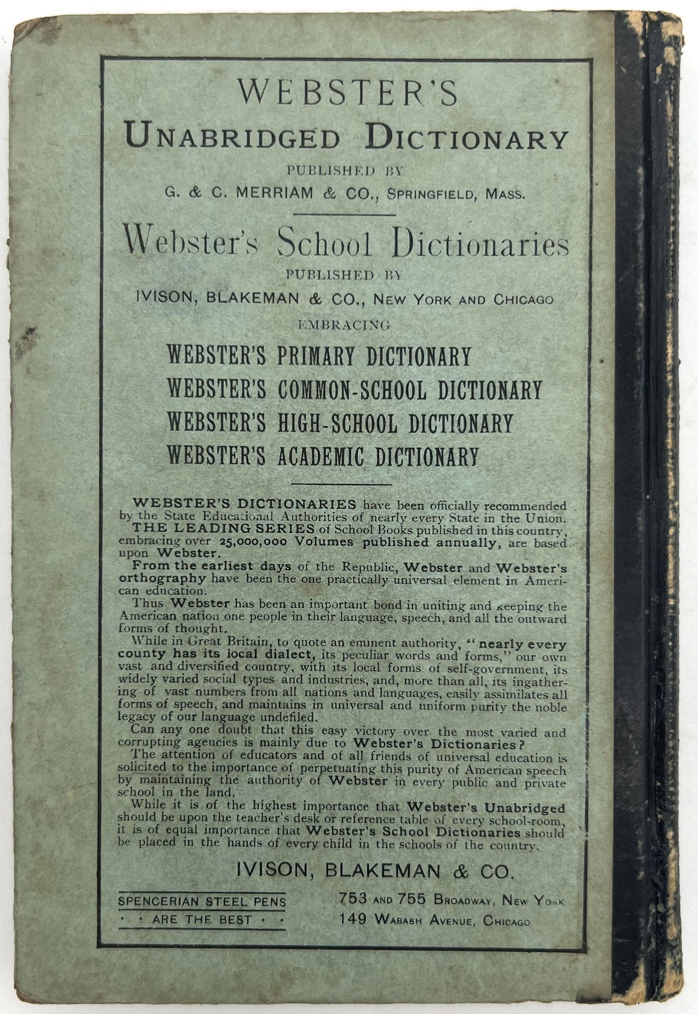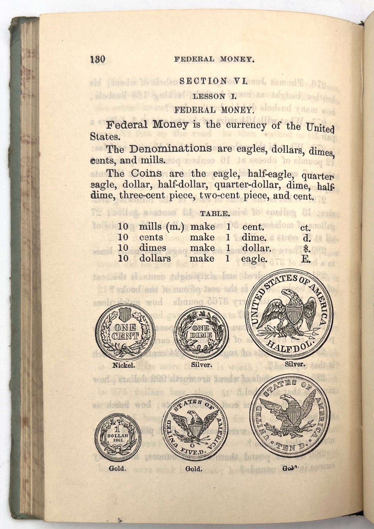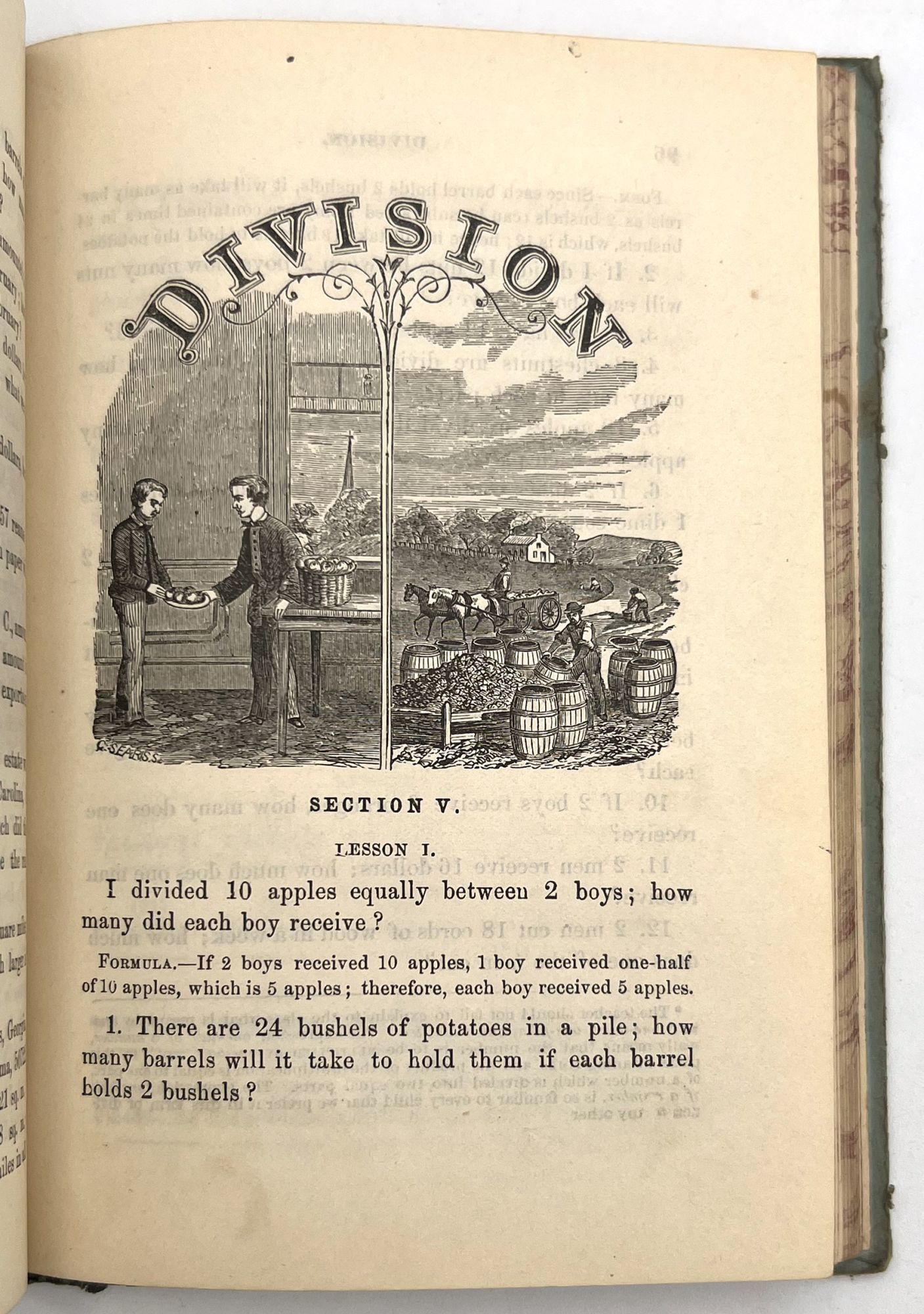 New York and Chicago: Ivison, Blakeman & Company, 1863. Fair to good, internally bright and clean. Extremities rubbed with dust soiling, some points of wear.. An arithmetic book for elementary school students, published in 1863. Includes "mental, slate, and blackboard exercises" for children divided into sections including addition, subtraction, multiplication, and division. Also includes brief sections on currency, linear and cubic measure, and fractions. Single vol. (6.5" by 4.5"), pp. 182, in-text illustrations including topical headpieces, in original illustrated boards backed in leather with image of boy at desk on front and advertisement for Webster's Unabridged Dictionary on the back. Contemporary inscription to front free endpaper ("Mabel Egleston, Croton Landing New York") and pencil inscription to upper board ("Mabel D[?]").