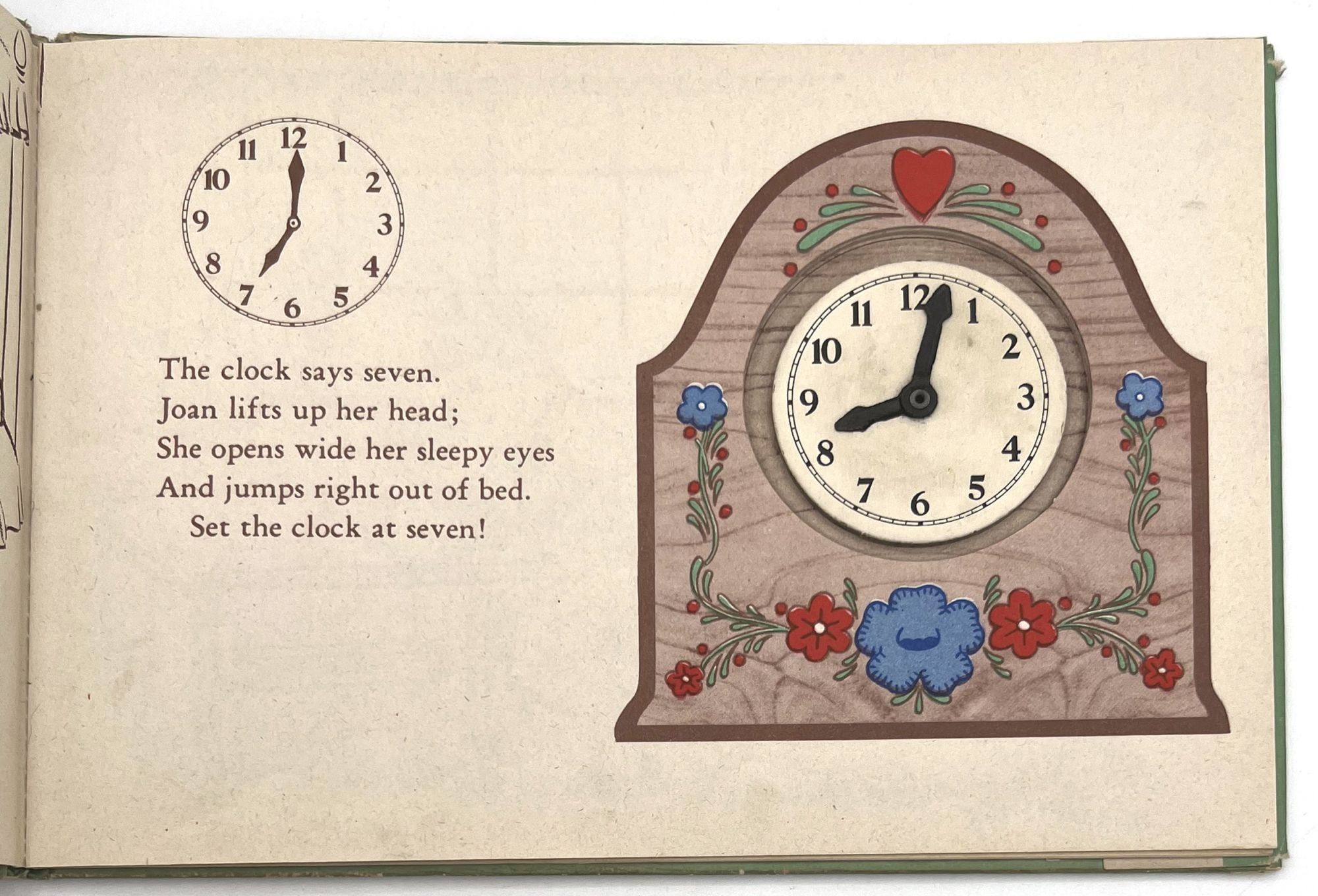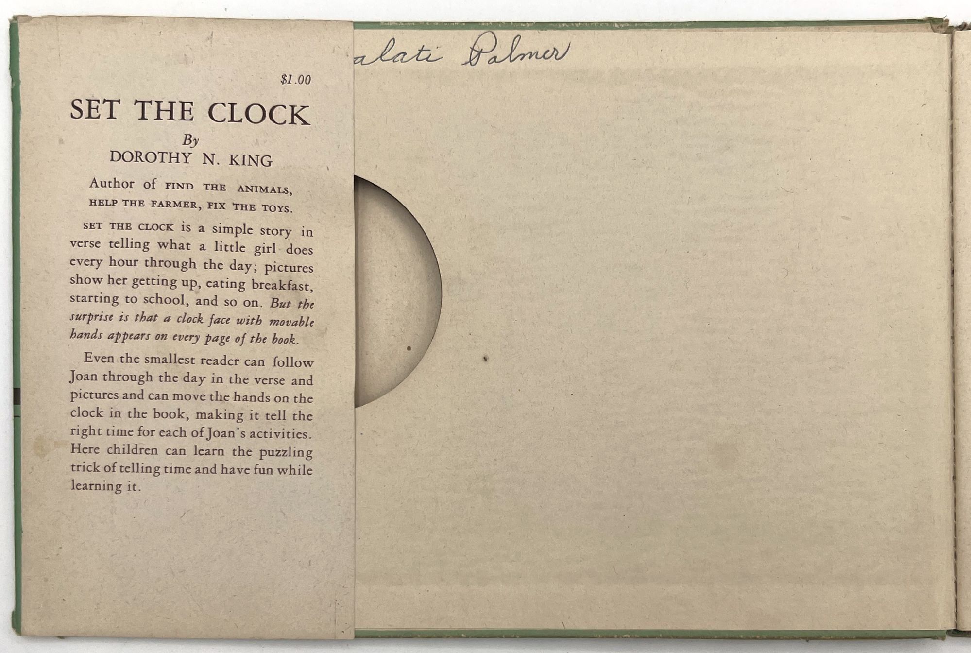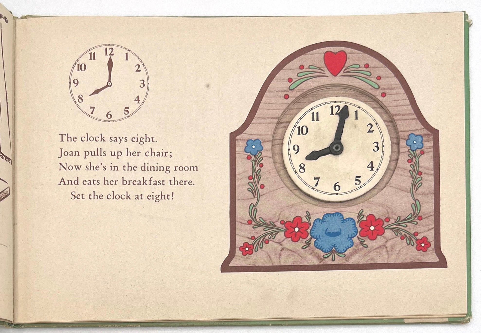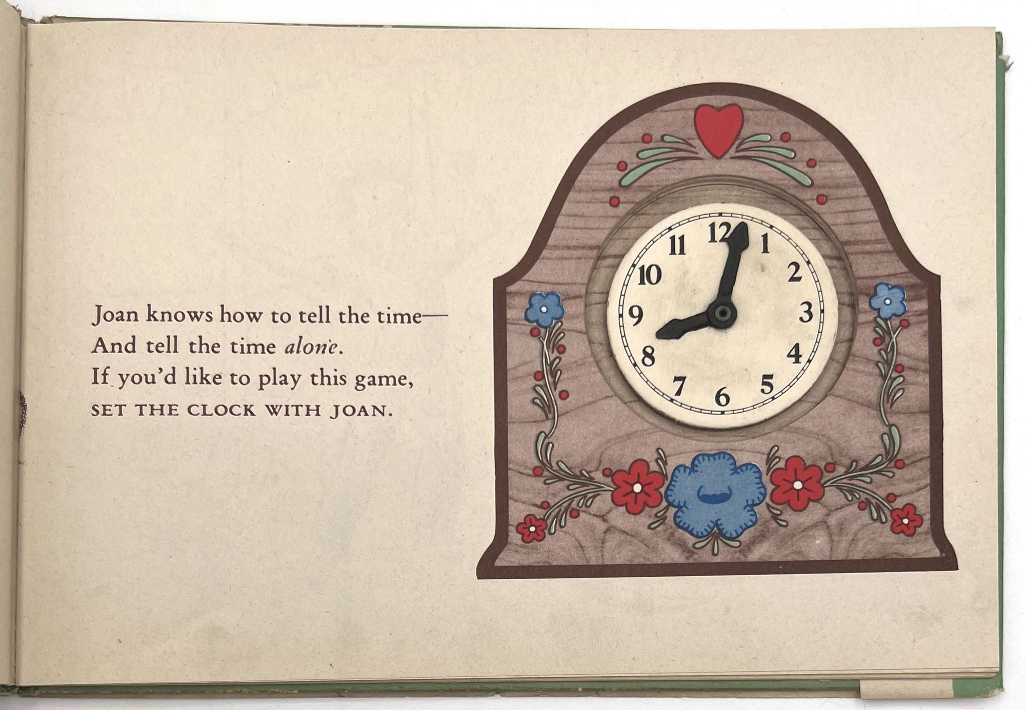 New York, New York: Franklin Watts, Inc, 1942. Good. Light dust soiling, some nicks and short tears to dust jacket.. A very dear picture book for children from the early 1940s, featuring a cardboard clock with moveable hands for learning how to tell the time. Each leaf describes a different time of day in the life of a young girl, Joan, and has a window cut-out to reveal the moveable clock for children to practice. Pencil ownership signature in pencil to dust jacket ("G.G. Palmer"). Pen signature to upper board ("Genevieve Galati Palmer"). Palmer (1924-2016) began teaching in 1946, and most likely used this book in her classroom. Single vol. (6.75" by 9.5"), pp. [32], illus., in original illus. boards with dust jacket.