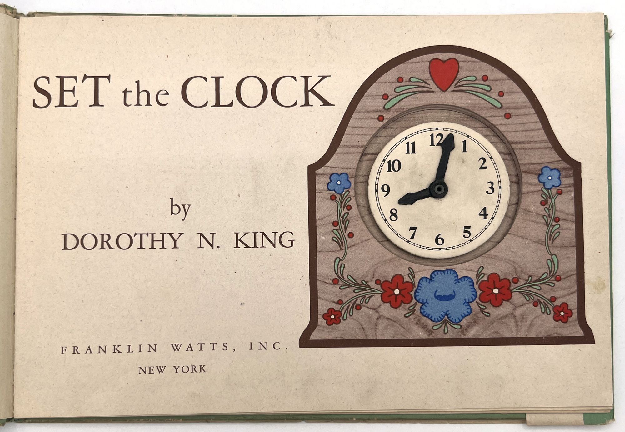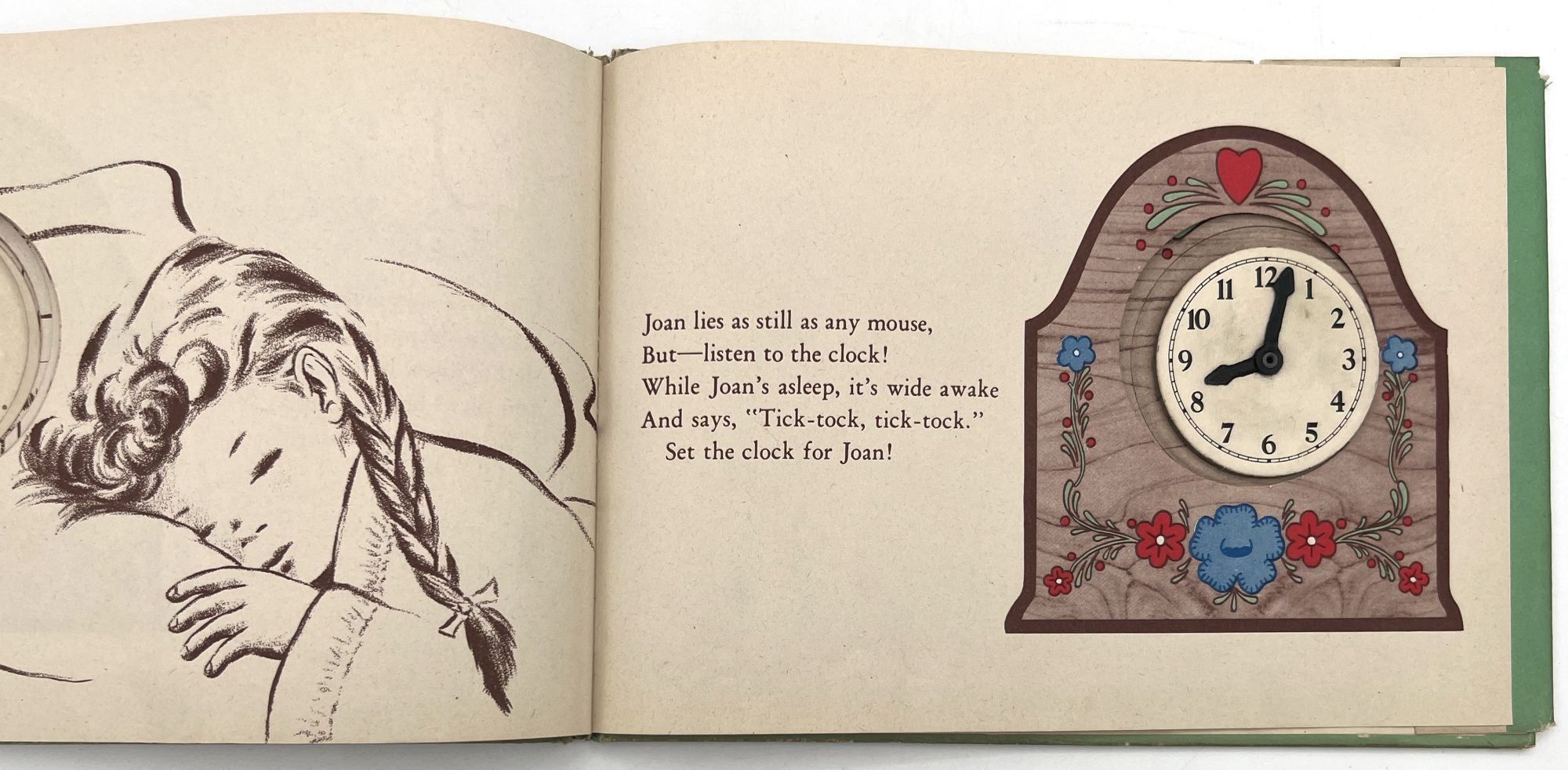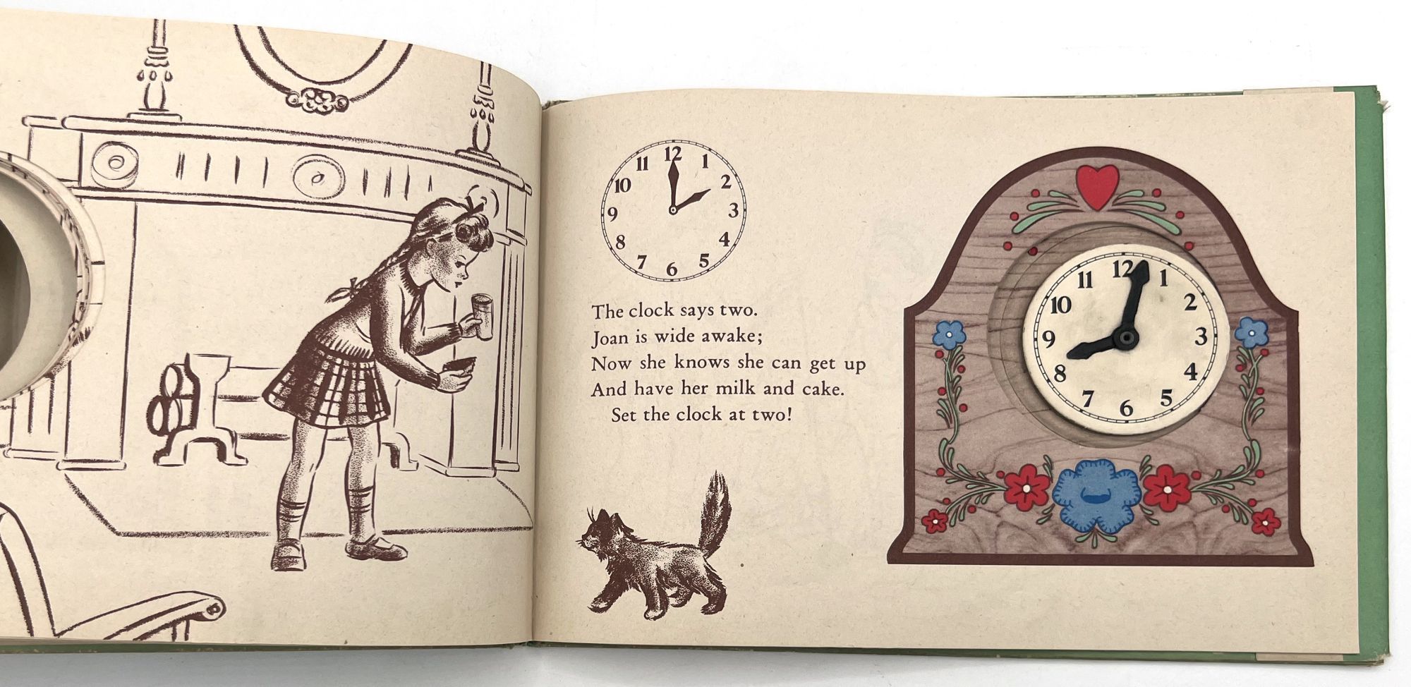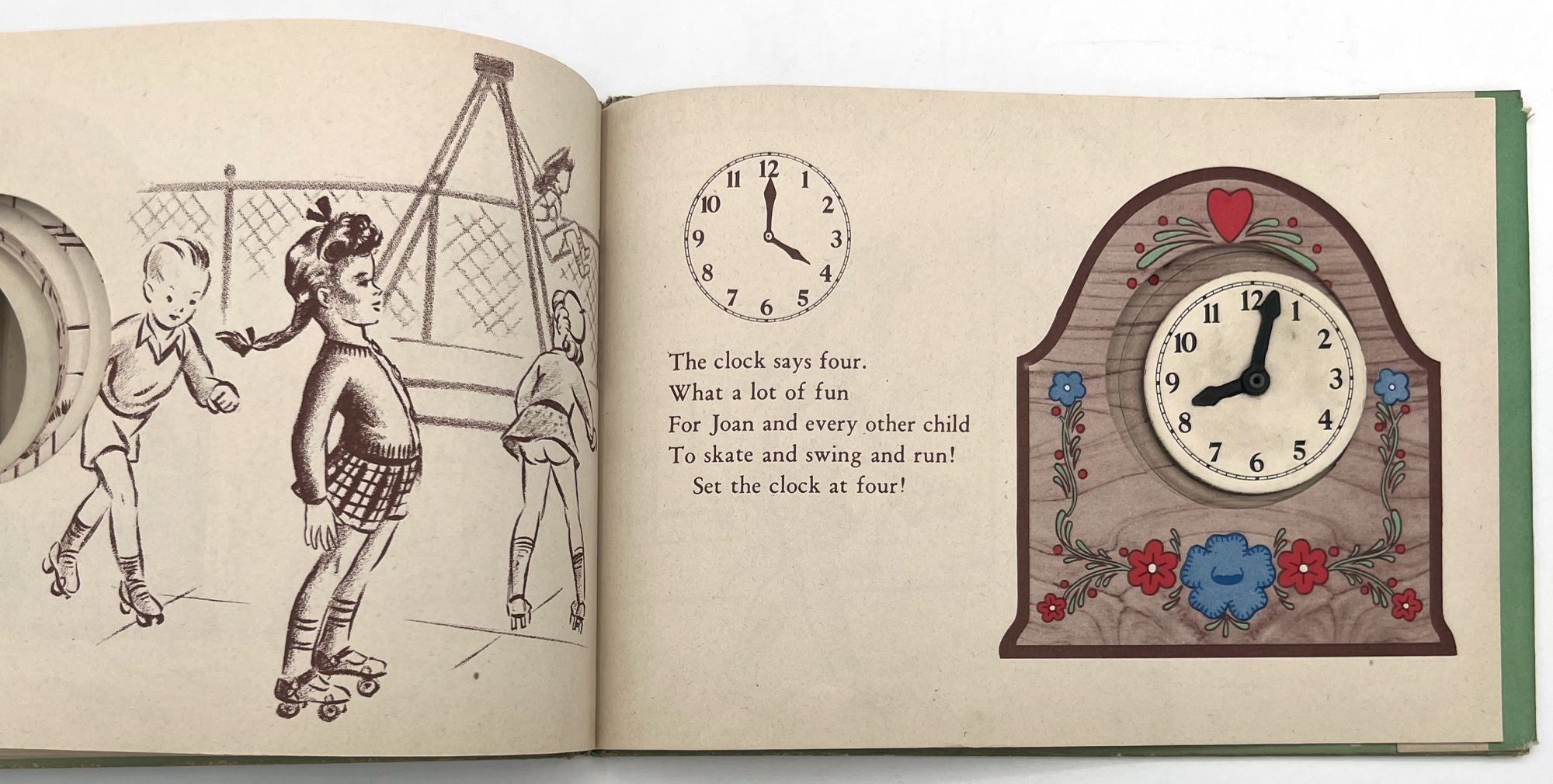 New York, New York: Franklin Watts, Inc, 1942. Good. Light dust soiling, some nicks and short tears to dust jacket.. A very dear picture book for children from the early 1940s, featuring a cardboard clock with moveable hands for learning how to tell the time. Each leaf describes a different time of day in the life of a young girl, Joan, and has a window cut-out to reveal the moveable clock for children to practice. Pencil ownership signature in pencil to dust jacket ("G.G. Palmer"). Pen signature to upper board ("Genevieve Galati Palmer"). Palmer (1924-2016) began teaching in 1946, and most likely used this book in her classroom. Single vol. (6.75" by 9.5"), pp. [32], illus., in original illus. boards with dust jacket.