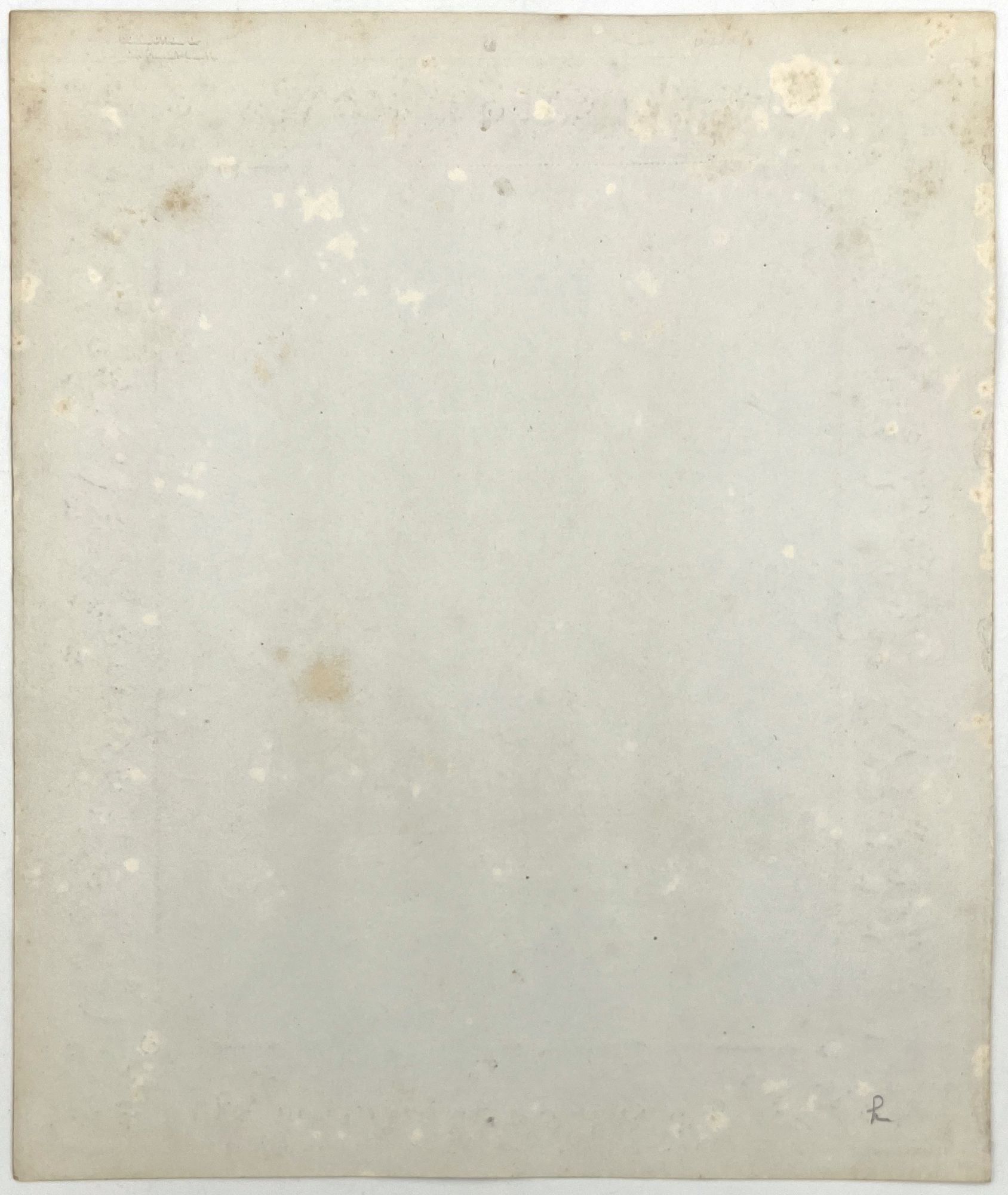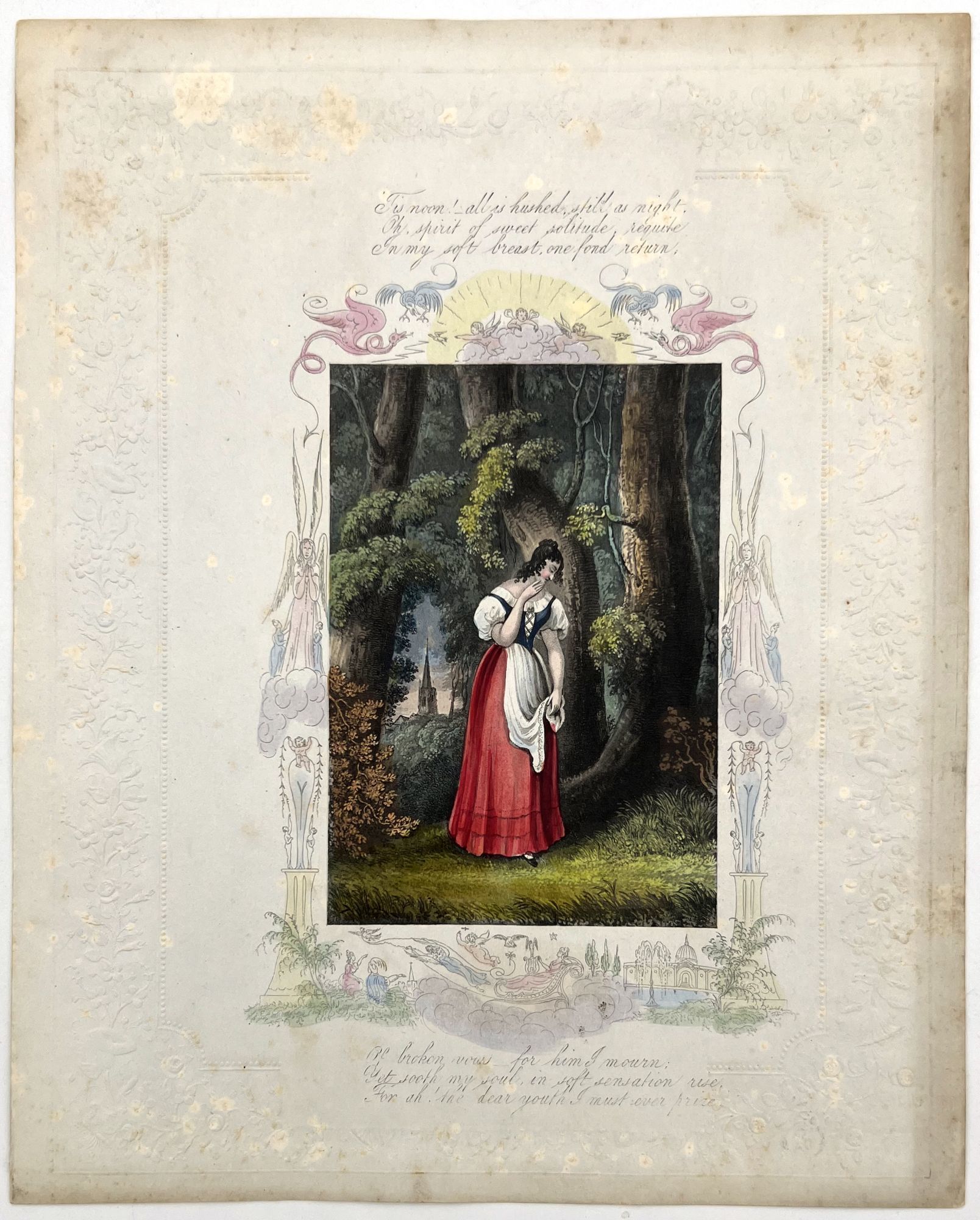 England, 1830. Very good. Light toning/spotting.. A rare example of one of the valentines produced for the so-called "Unrequited Love" or "Despondent Lover" valentine set, a highly sentimental series first produced in the 1830s. Most featured despondent lovers, but some featured happy or joyful scenes of love. This example does not feature the Addenbrooke name or 1828 watermark known in other examples, but appears contemporary. This example depicts a despondent woman in a red dress in the forest, with a church in the far distance. The poem reads, "'Tis noon! all is hushed, still as night. Oh, spirit of sweet solitude, requite In my soft breast, one fond return, Of broken vows, for him I mourn; Yet sooth, my soul in soft sensation rise, For ah! She dear youth I must ever prize." Wove paper bifolium with embossed decorative border (10" by 8"), with hand colored aquatint in center.