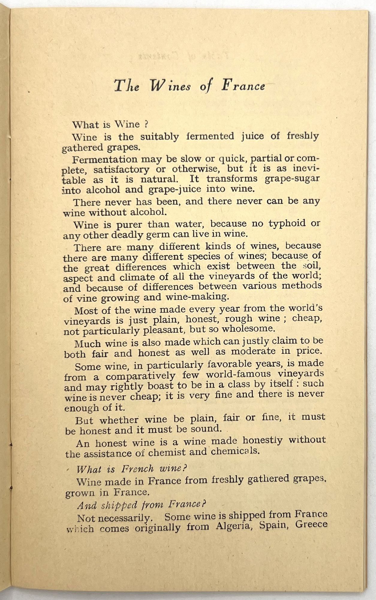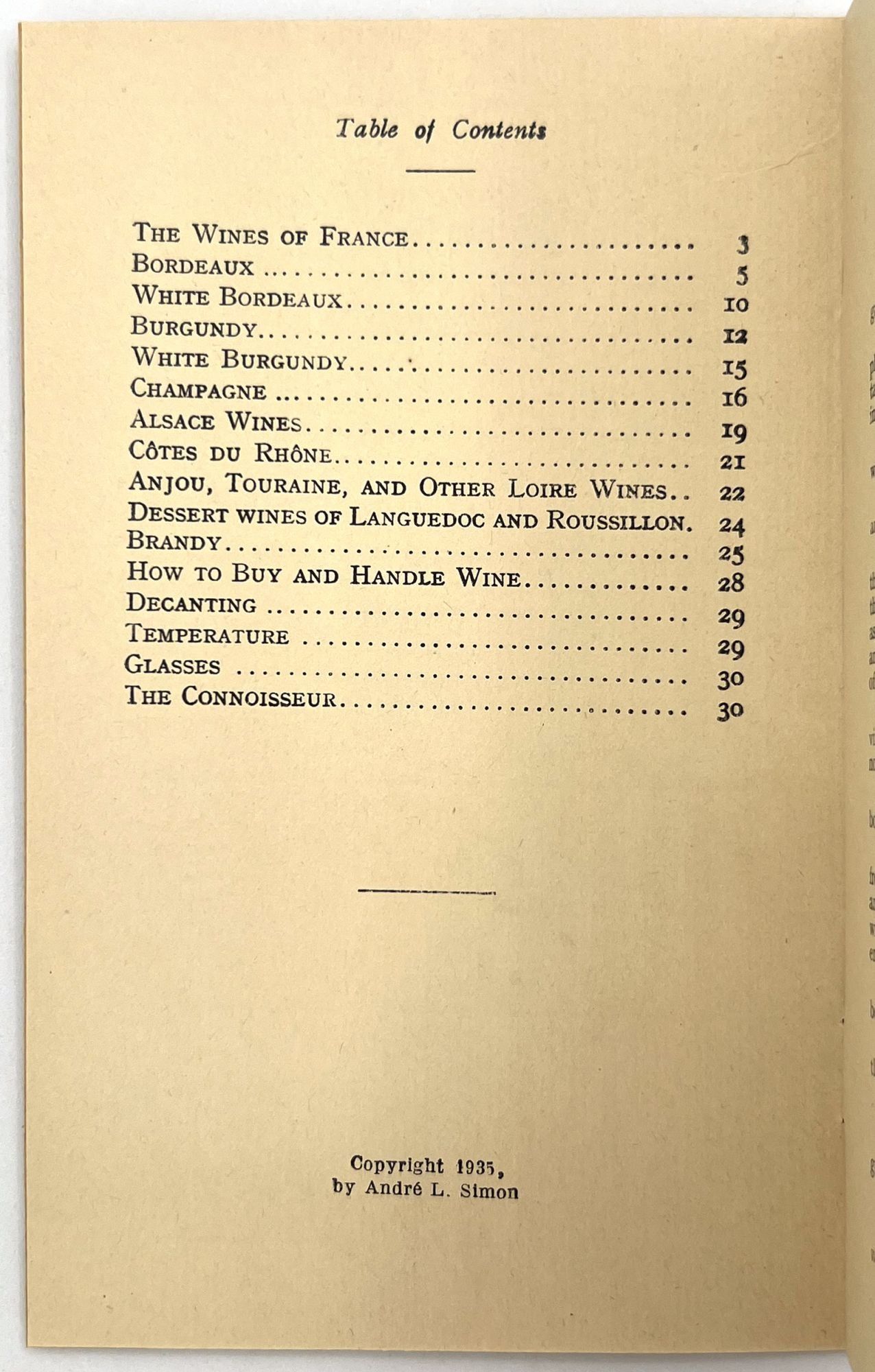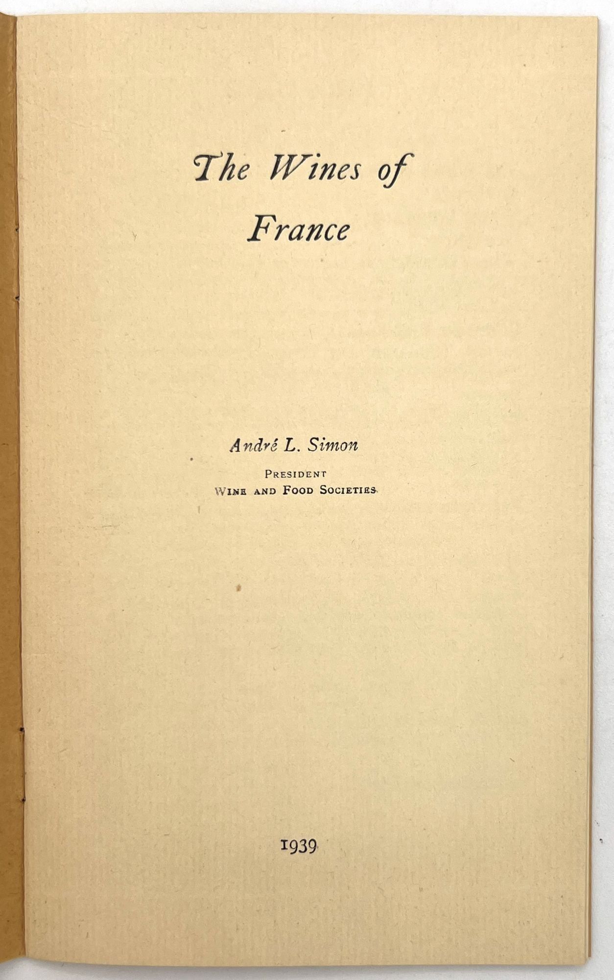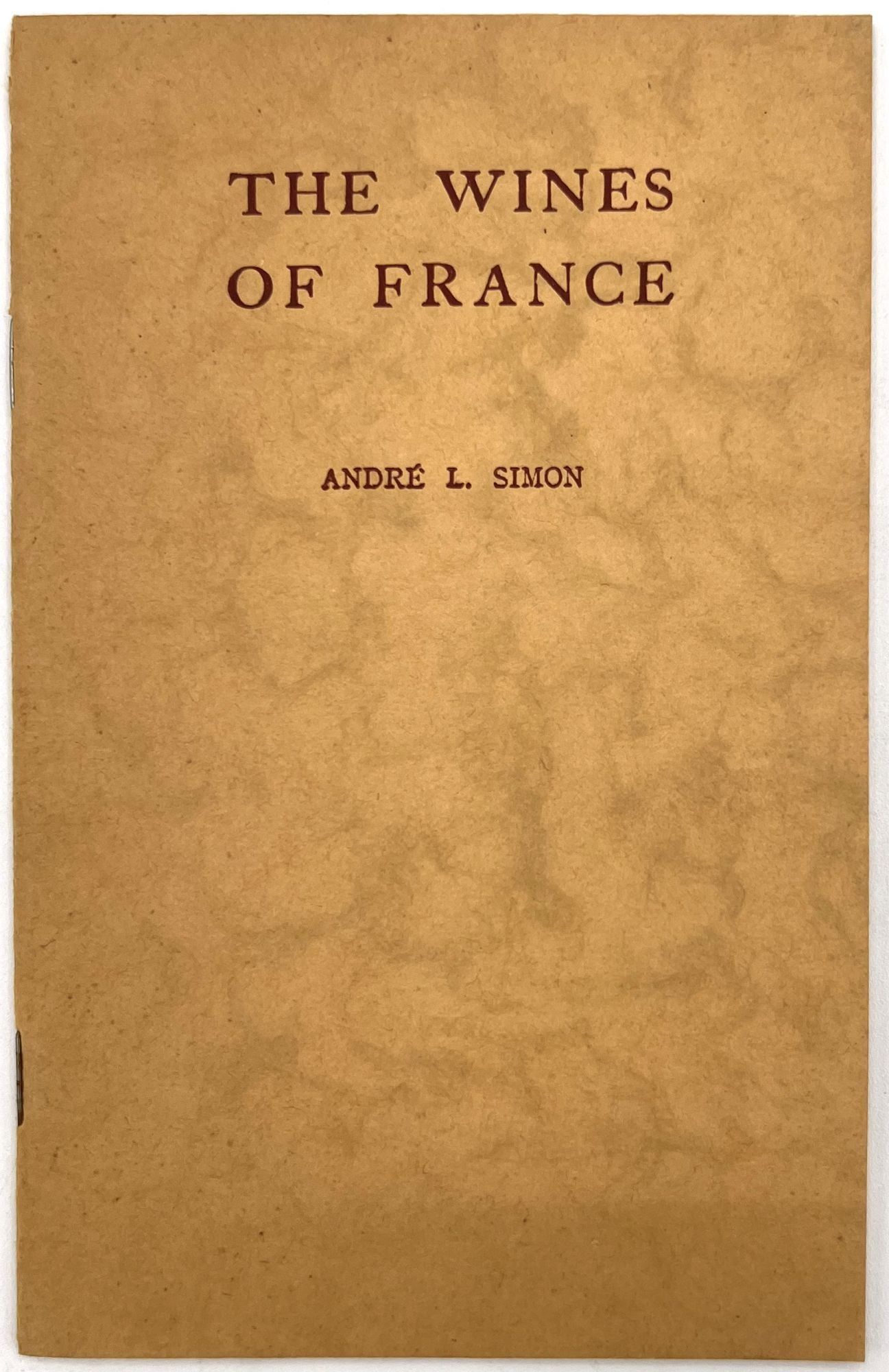 Corbeil, France: Imp. Crete, 1939. Very good. Light toning.. A pocket guide to French wine, "Printed in France, and published by the French Government", presumably for the American tourist trade in France. Provides basic information on how wine is made, an overview of different kinds and regions (e.g. Bordeaux, Champagne), how to boy and handle wine, decanting, glasses, and how to become an effective connoisseur. Single vol. (6.75" by 4"), pp. 32, in original printed wrps, together with brief illustrated leaflet "enjoy life through French wines" (6.75" by 4.75"). Andre L. Simon (1877-1970) was a prominent 10th century French wine merchant and connoisseur.