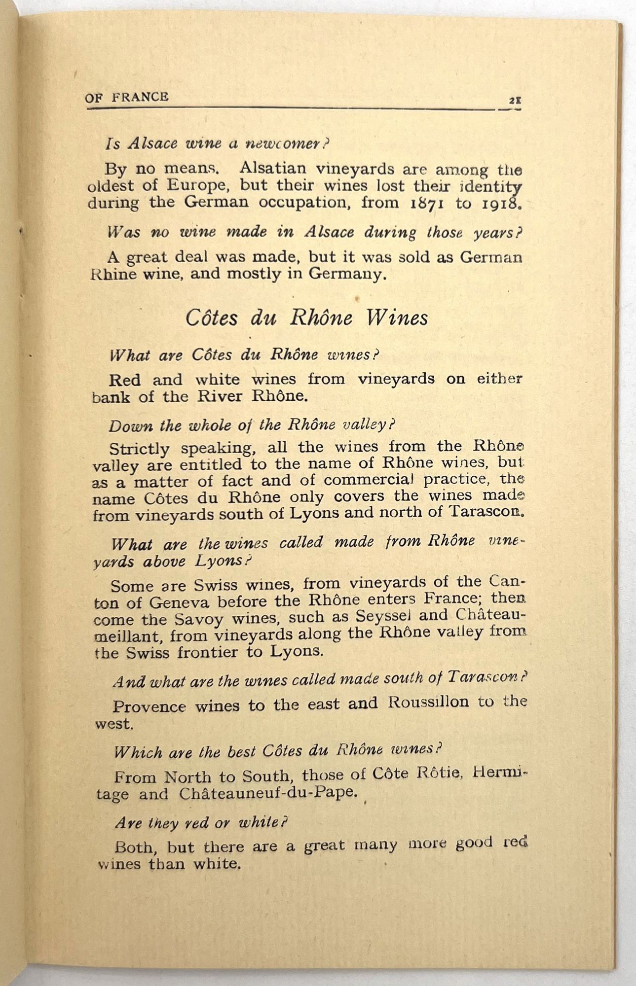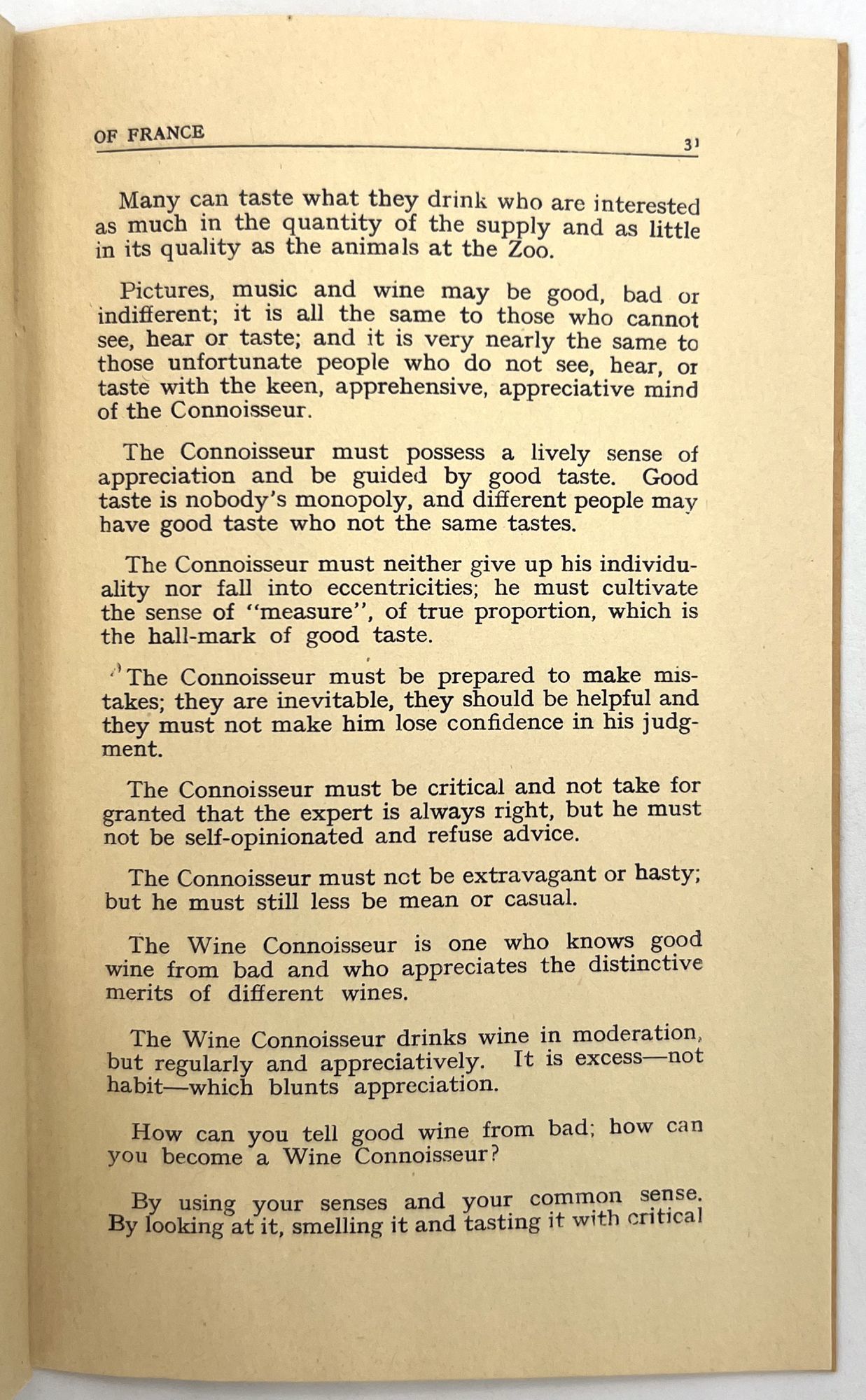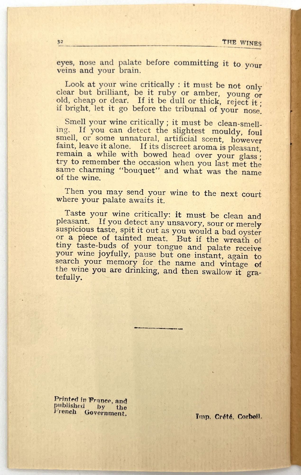 Corbeil, France: Imp. Crete, 1939. Very good. Light toning.. A pocket guide to French wine, "Printed in France, and published by the French Government", presumably for the American tourist trade in France. Provides basic information on how wine is made, an overview of different kinds and regions (e.g. Bordeaux, Champagne), how to boy and handle wine, decanting, glasses, and how to become an effective connoisseur. Single vol. (6.75" by 4"), pp. 32, in original printed wrps, together with brief illustrated leaflet "enjoy life through French wines" (6.75" by 4.75"). Andre L. Simon (1877-1970) was a prominent 10th century French wine merchant and connoisseur.