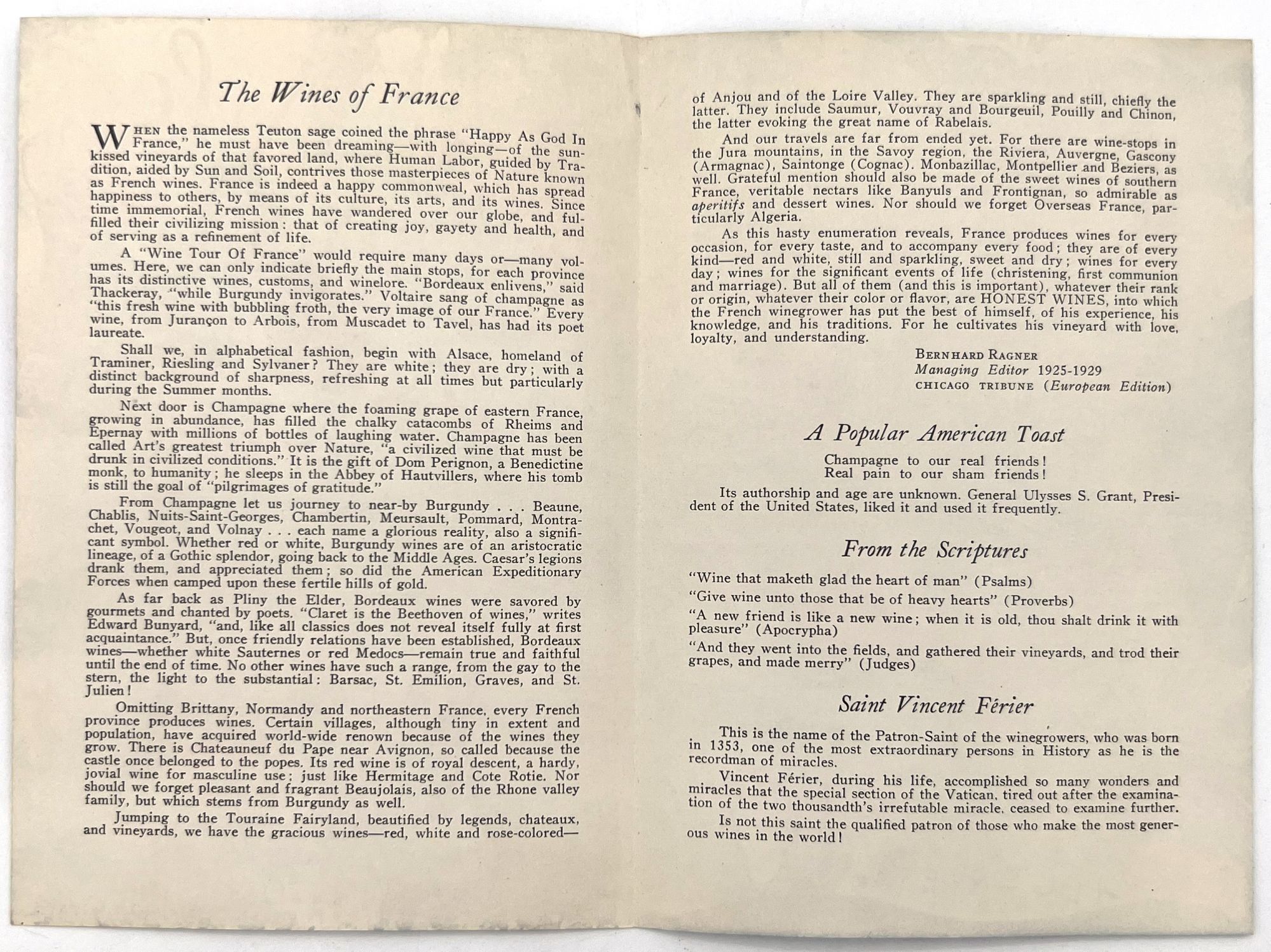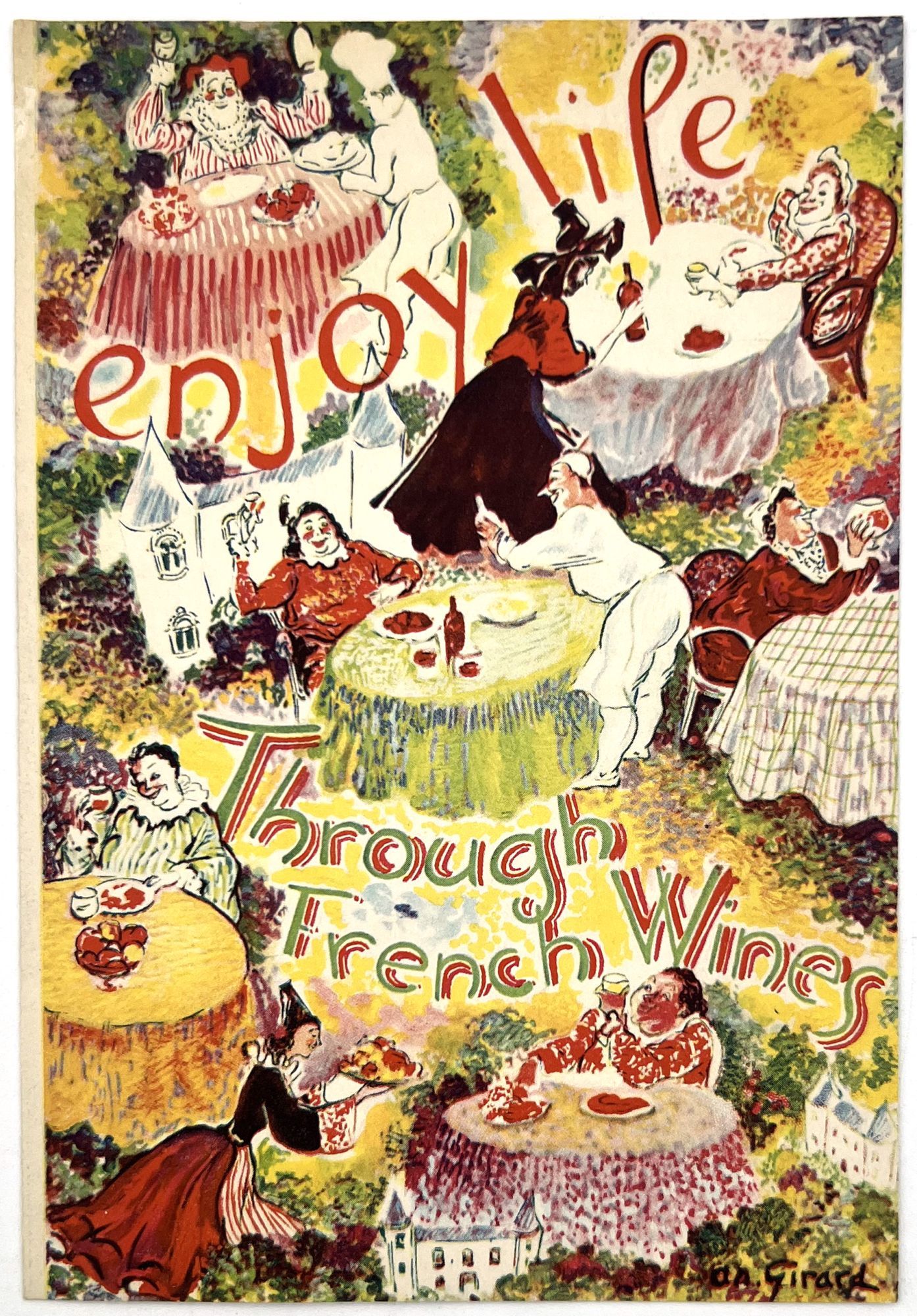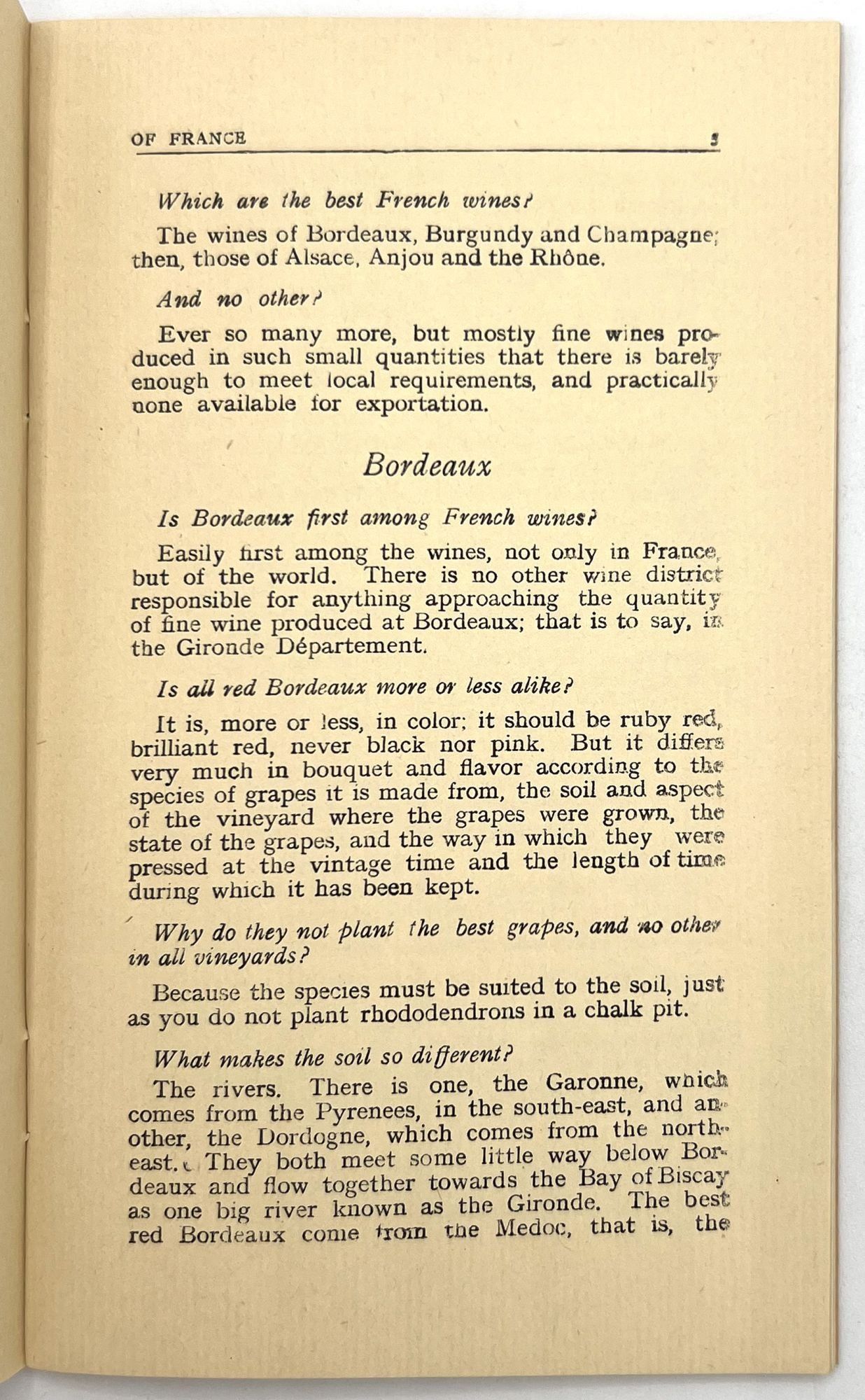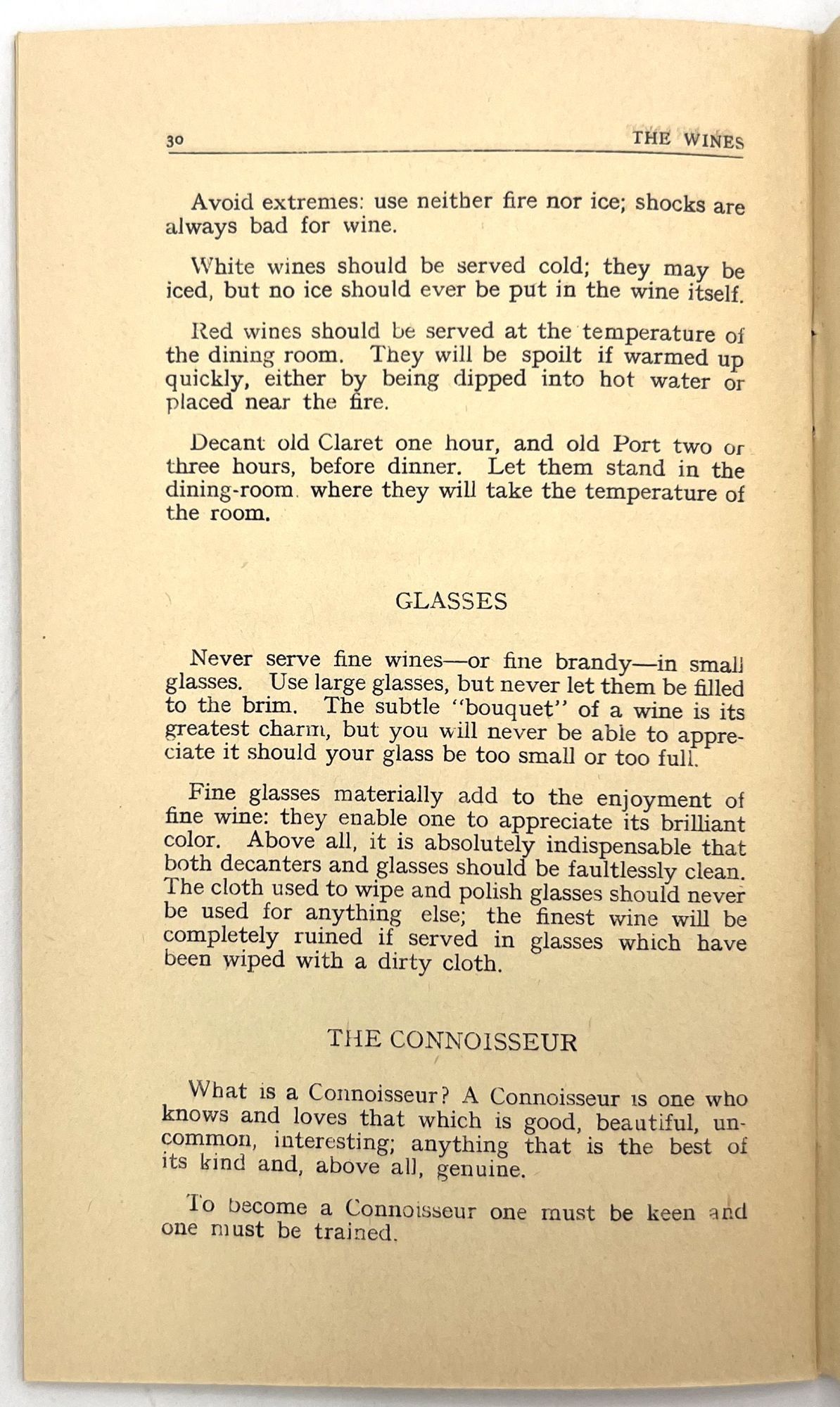Corbeil, France: Imp. Crete, 1939. Very good. Light toning.. A pocket guide to French wine, "Printed in France, and published by the French Government", presumably for the American tourist trade in France. Provides basic information on how wine is made, an overview of different kinds and regions (e.g. Bordeaux, Champagne), how to boy and handle wine, decanting, glasses, and how to become an effective connoisseur. Single vol. (6.75" by 4"), pp. 32, in original printed wrps, together with brief illustrated leaflet "enjoy life through French wines" (6.75" by 4.75"). Andre L. Simon (1877-1970) was a prominent 10th century French wine merchant and connoisseur.