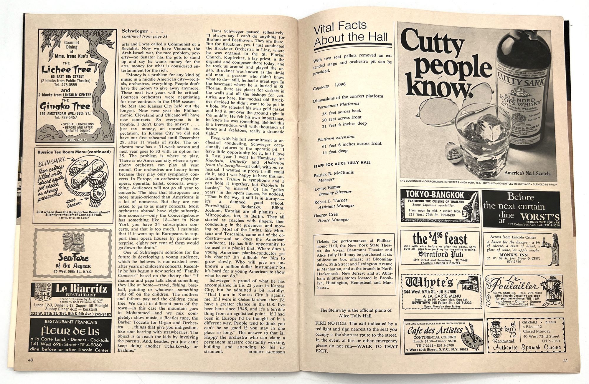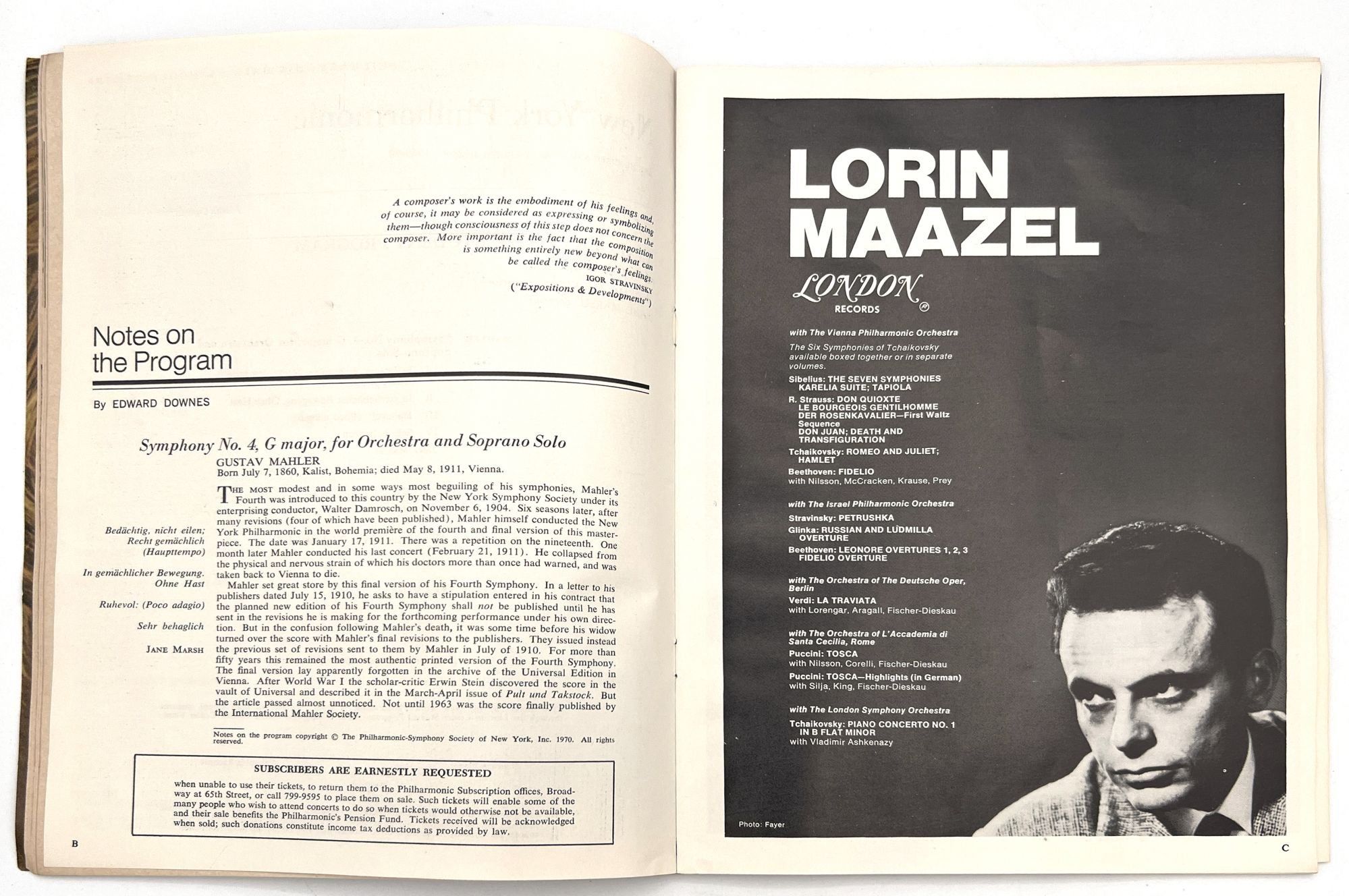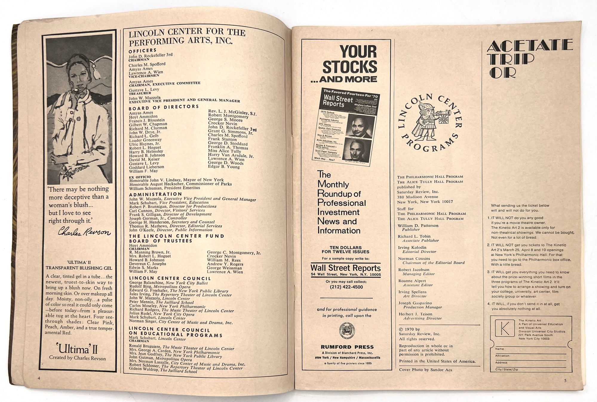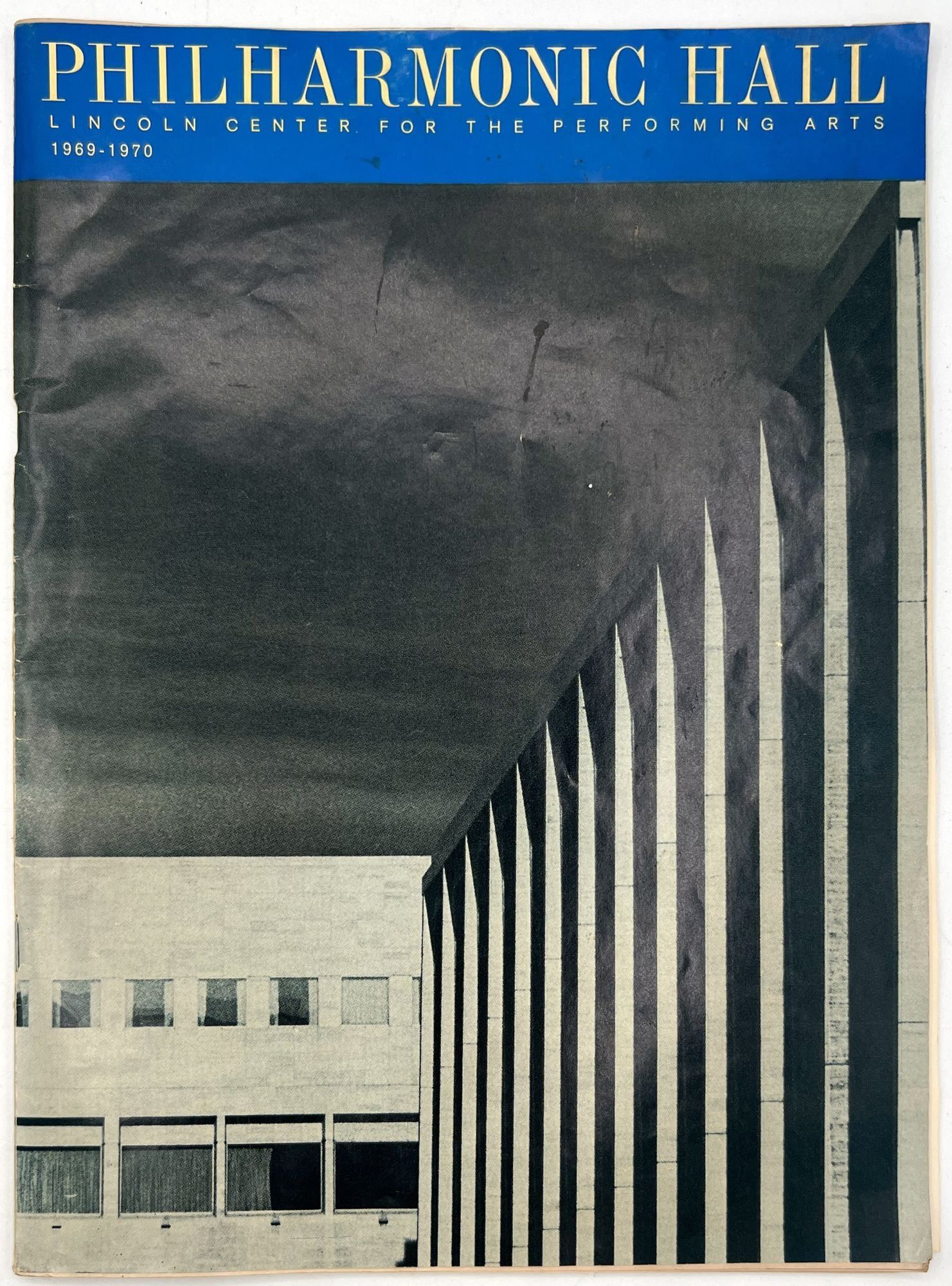 New York, New York: Lincoln Center for the Performing Arts, 1971. Very good. Toned with a couple leaves/a gathering loose.. Two (2) issues of Philharmonic Hall, a printed program promoting arts events at Lincoln Center. These cover the years 1969-1970, and 1970-1971. Note the heavy hitters listed in the Lincoln Center Council (Balanchine, Bing, Rodgers), and under the New York Phil musicians (Julius Baker, David Nadien), as well as many others important to 20th century arts and culture. Includes features on the music performed, the maestro Leopold Stokowski, lists of donors and patrons, a local restaurant guide, and more. Both measure approx. 11" by 8.25", approx. 44 pp., illus., in original illus. wrps.