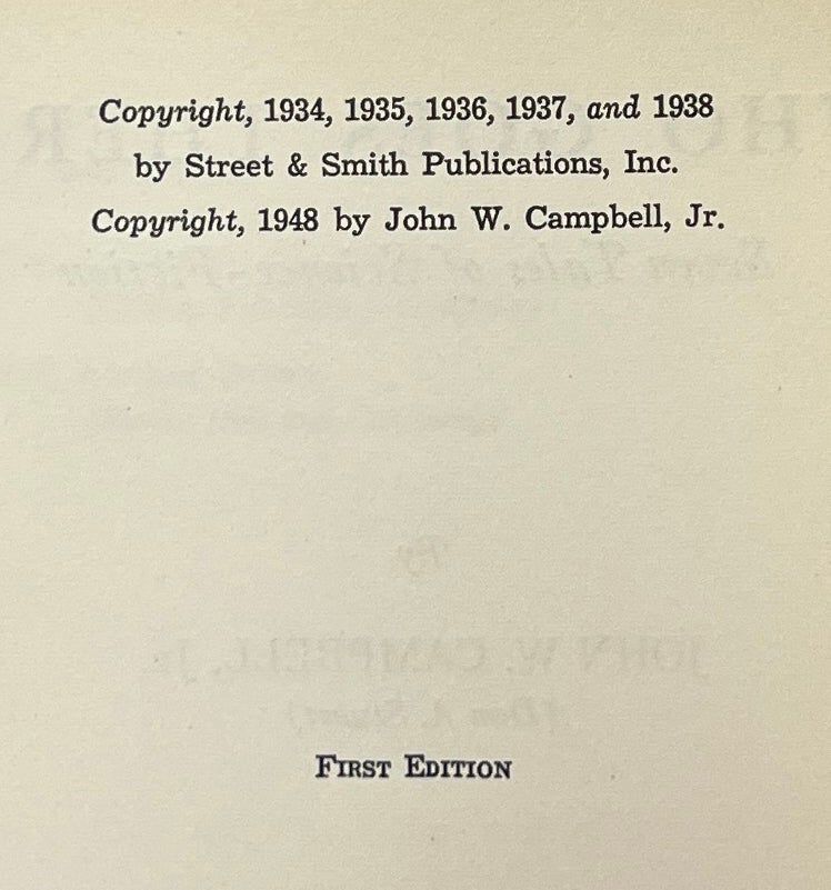 Chicago: Shasta Publishers, 1948. First Edition. Hardcover. Near Fine/Fine. Near Fine in an about Fine jacket, unclipped ($3.00), toned throughout. Blue cloth, some soiling near the edges of the boards, with gilt lettering on the spine. Square and firmly bound, former owner's stamps inside the front board and on the front endpaper, clean otherwise. A collection of seven science fiction short stories by the editor of Astounding Science Fiction, including the source material for the film The Thing.