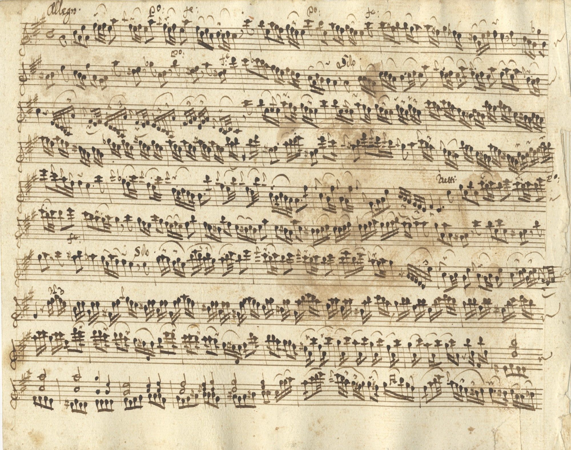 [?]Italy or France, 1770. Oblong folio. Unbound. Violino principale part 221 x 283 mm, all other parts 229 x 314 mm. Notated in ink on 10-stave rastrum-ruled paper, with single smaller oblong octavo leaf 113 x 212 mm notated on 7-stave rastrum-ruled paper tipped-in to violino principale part. Watermark of 3 half-moons and the letter "A," similar to Duckles WM 16.