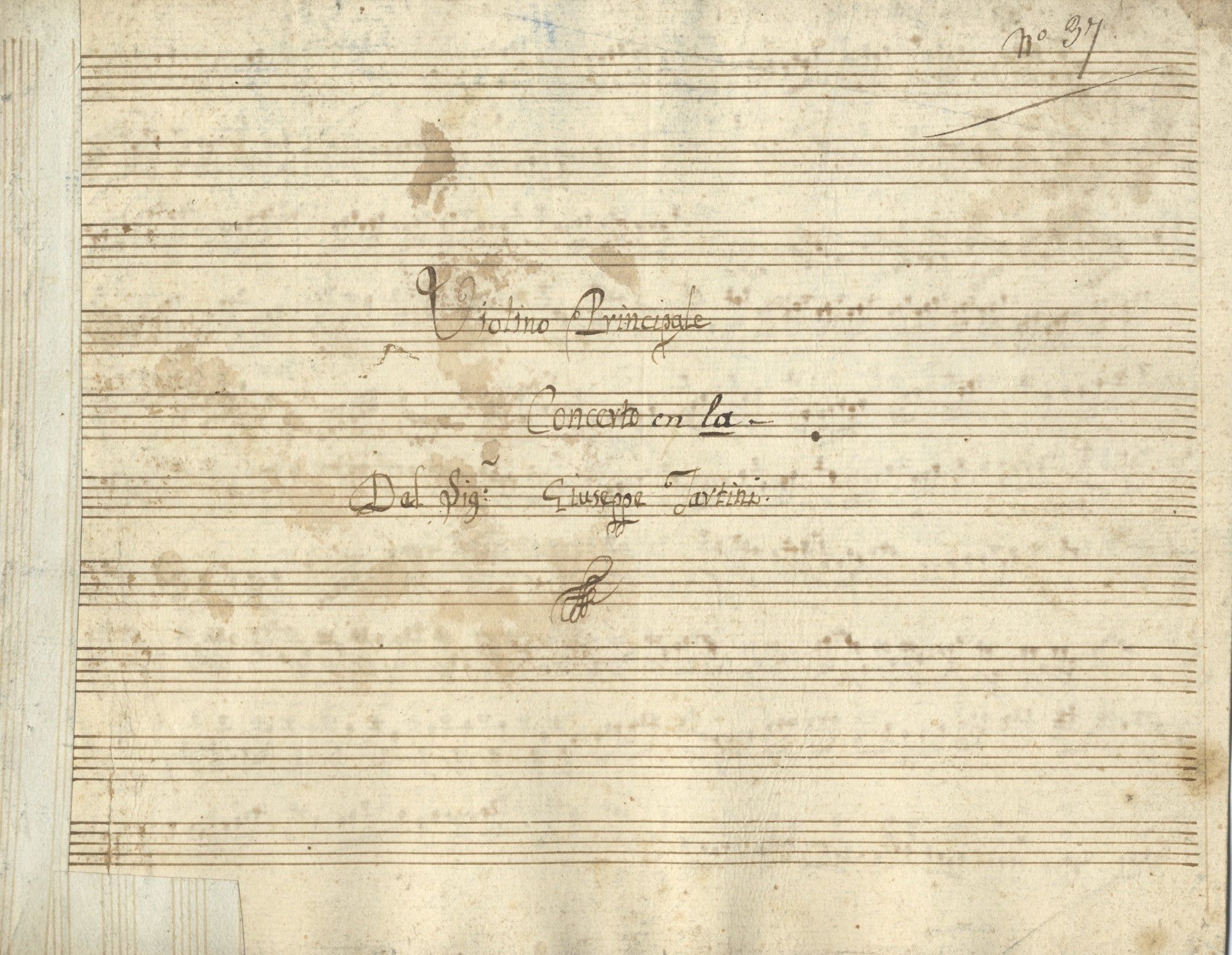 Spines of violino principale and violoncello obligato parts and upper outer corner of final leaf of violino principale part reinforced with contemporary rastrum-ruled music manuscript paper. Slightly worn; occasional stains, soiling, and dampstaining; edges slightly frayed. Catalogo tematico della composizioni di Giuseppe Tartini online, GT1.A16. Dounias p. 286, 103. Duckles p. 350, no. 87.