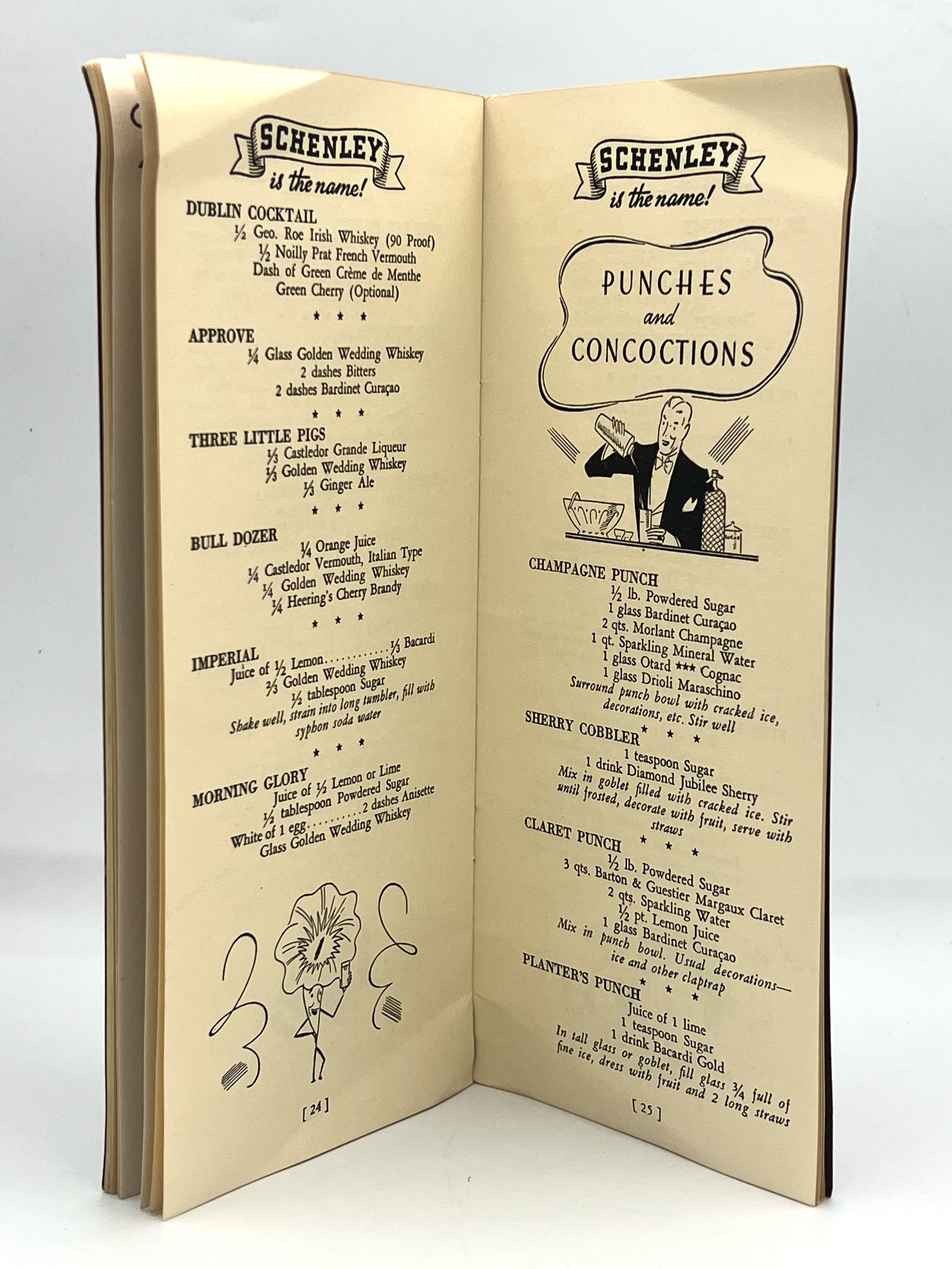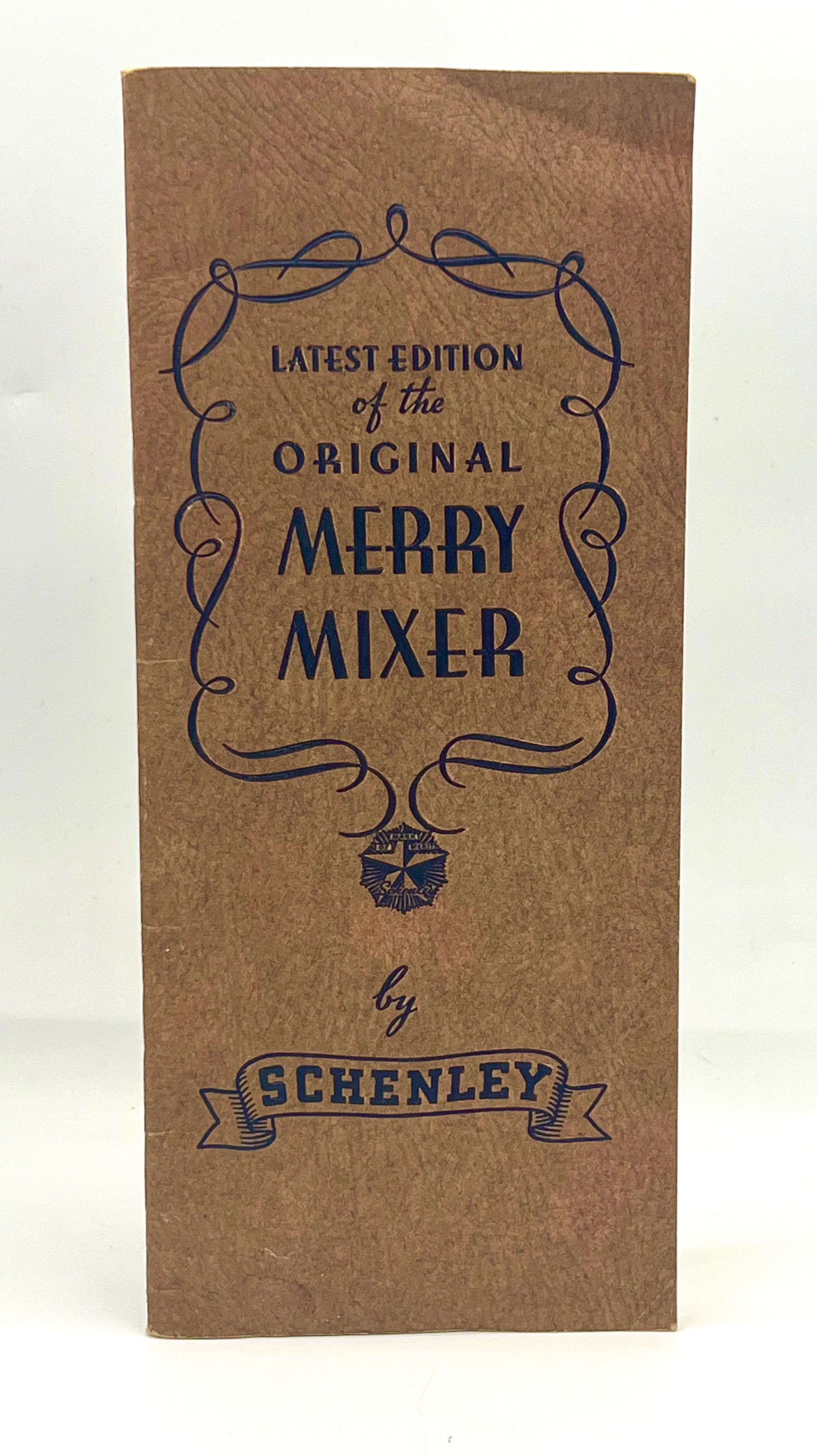 New York: Schenley Products Company, 1936. Staplebound. Brown illustrated textured wraps. Very good. 34 pages. 22 .5 x 10 cm. The House of Schenley - Silver Wedding London Dry Gin, Golden Wedding Straight Whiskies (Rye or Bourbon), Ancient Age Straight Whiskey, Old Schenley Straight Rye Whiskey, and many more. Schenley, organzied in 1920s gained a license to produce medicinal whiskey during Prohibition when only a few companies where authorized to produce such spirits. Includes suggestions for The Pantry, Cocktails, Punches, and Fizzes. Illustrated throughout. Interior clean and crisp, wraps lightly creased.