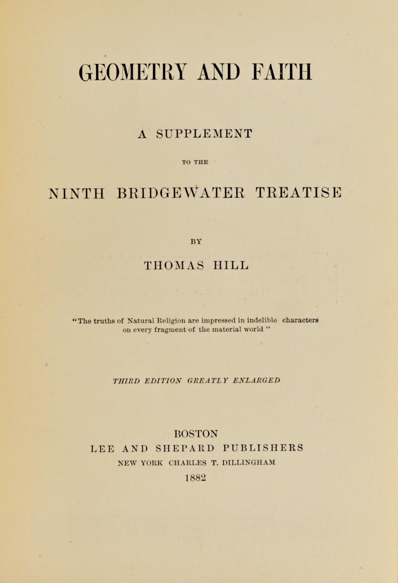 New York: Lee Shepard Publishers, 1882. Third Greatly Enlarged Edition. Very Good binding. religion. Small Octavo; in the publisher’s brown cloth binding; 109 pages; lacking the front end paper; boards a bit scuffed; a faint cullaccino (circular water mark) on the upper board.~~An exploration of mathematics and religion, their intersection and enhancement of one another. ~~. Very Good binding.