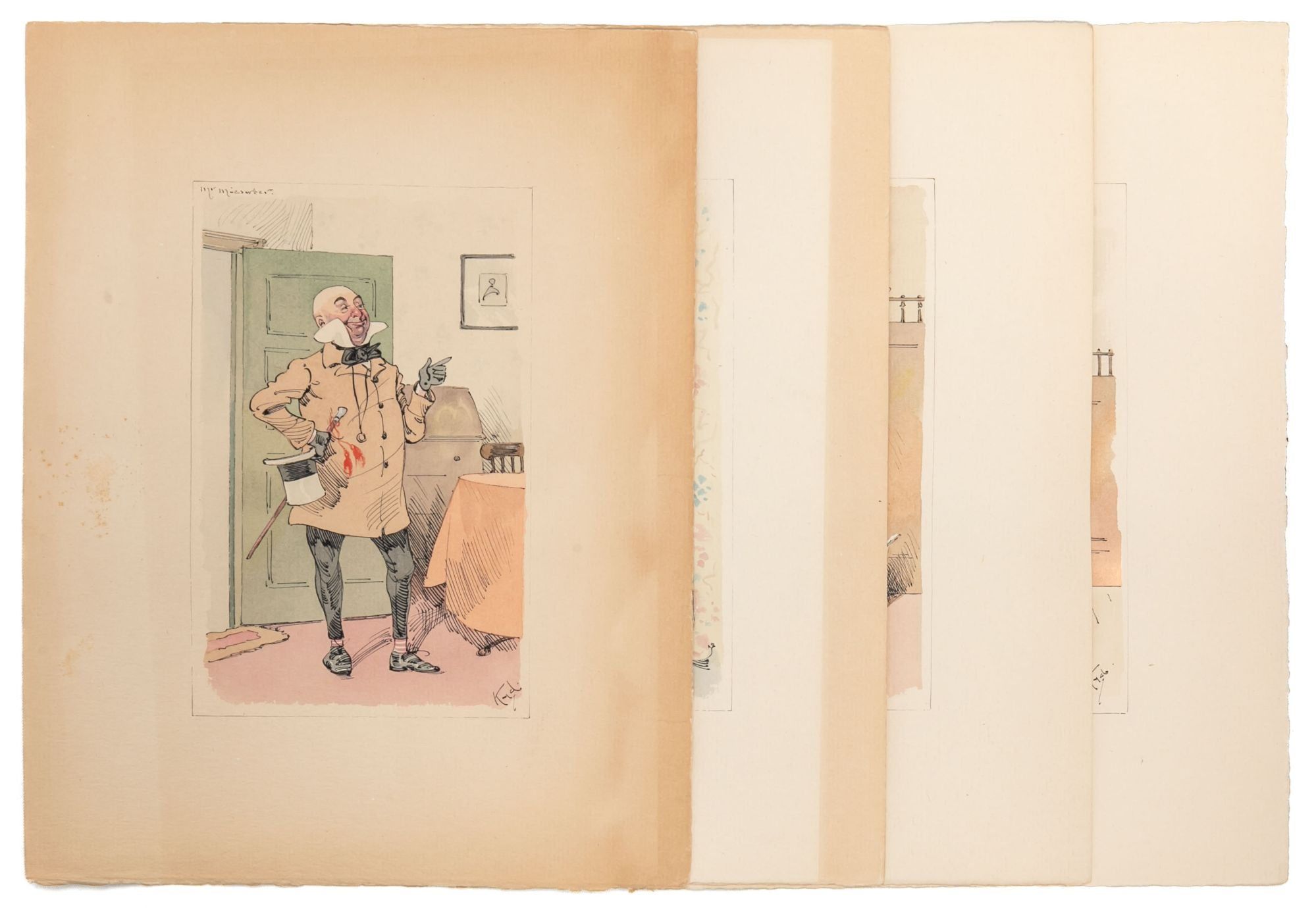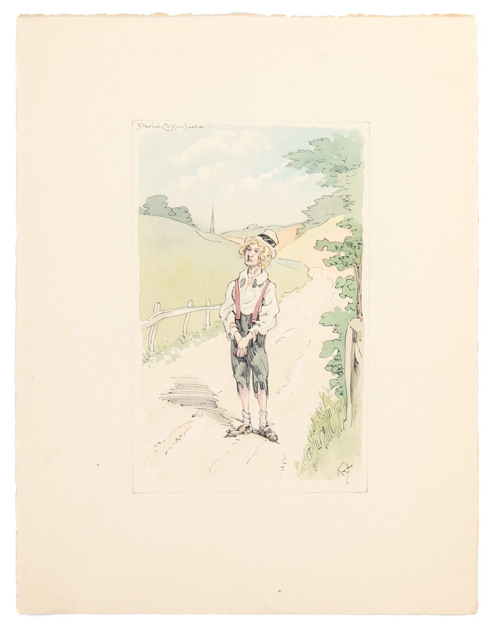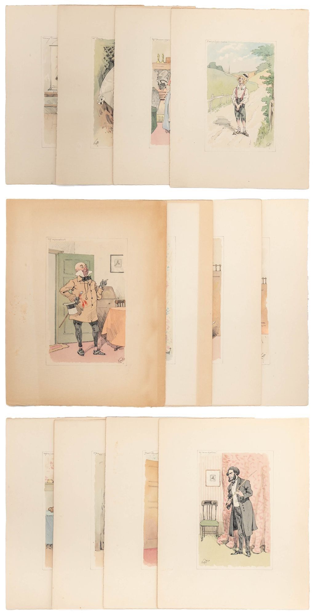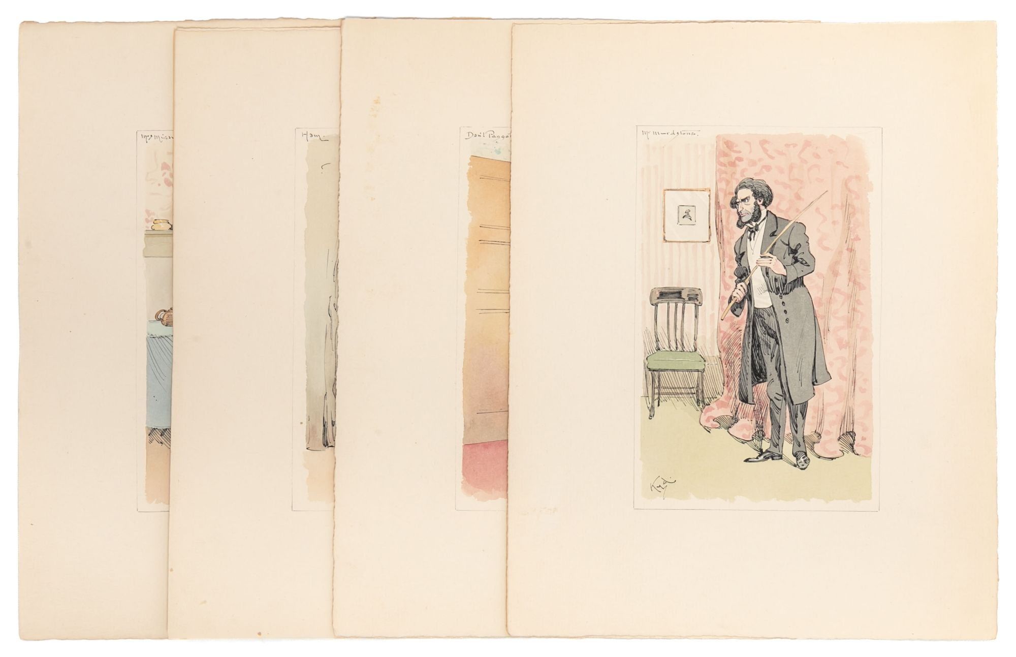 [n.p., London], 1893. Original artwork. Near Fine. Twelve fine original pen-and-ink and watercolor drawings illustrating David Copperfield, signed by the artist. Quarto (11 1/4 x 8 7/8 inches; 286 x 225 mm). Done on fine laid paper. Original blue wrappers with "12 Original Character Studies from 'David Copperfield' Drawn in colors by 'Kyd'" in ink manuscript on front wrapper. Wrappers expertly repaired. Housed in a green cloth portfolio. Near Fine.