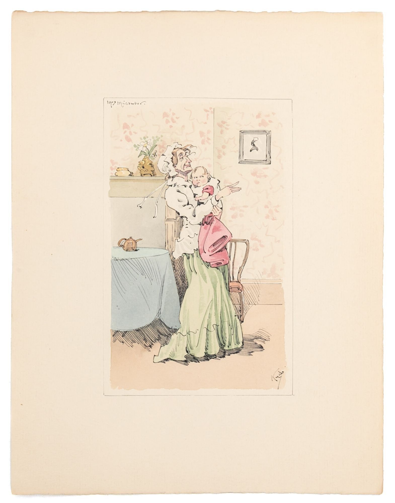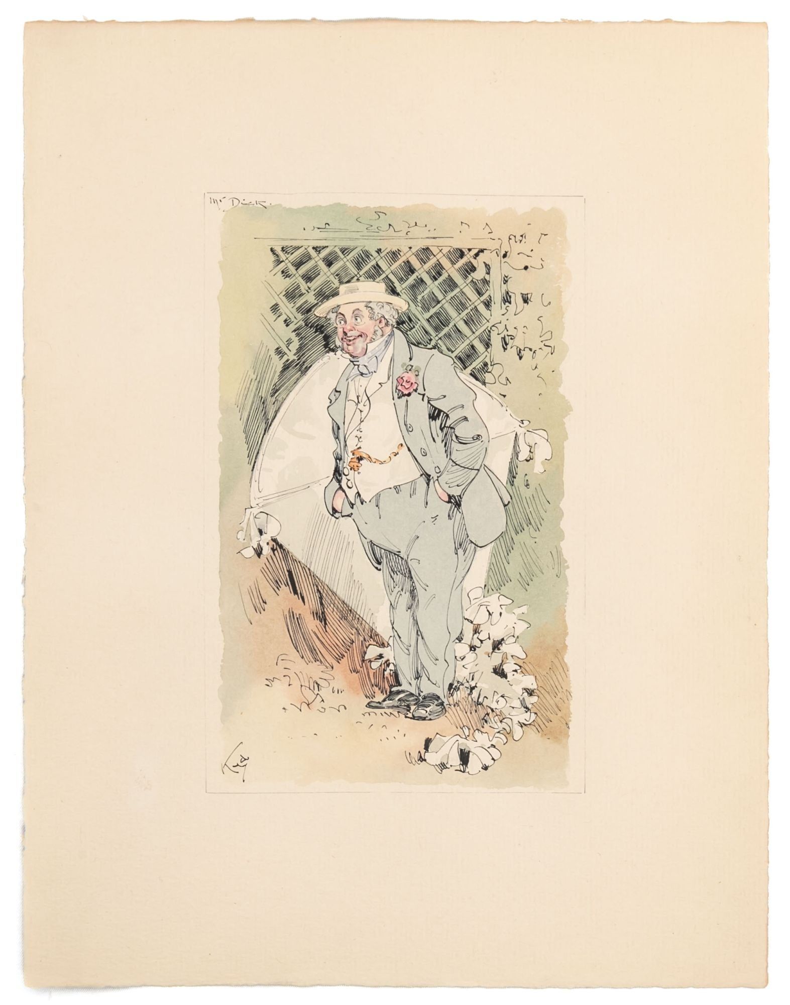 Joseph Clayton Clark aka "Kyd" (1856 - 1937) worked as a freelance artist with a particular affection for Dickens, his Dickens illustrations first appearing in 1887 in Fleet Street Magazine, with two collections soon to follow: The Characters of Charles Dickens (1889) and Some Well Known Characters from the Works of Charles Dickens (1892). In the first decade of the twentieth century, five sets of postcards based on his Dickens drawings were published, and seven sets of non-Dickensian comic cards by him were issued. Beginning in the 1920s, he earned his living from watercolor sketches, mainly of Dickens' characters, which he sold to and through the London book trade. Frederic G. Kitton gives him early notice in his classic text, Dickens and His Illustrators (1890); Kyd's watercolors were at that date already being avidly bought by major Dickens collectors (Kitton, p. 233), the Cosens sale in 1890 successfully selling a collection of 241 of Kyd's Dickens watercolors, and Mr. Tom Wilson, at the time the foremost collector of Dickens, possessing 331 of Kyd's drawings.