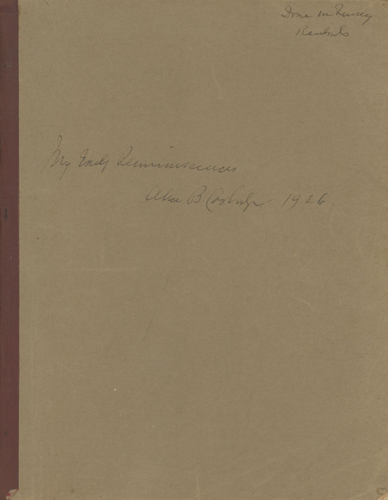 Quincy, Massachusetts: unpublished, 1926. 201 pp, cardstock wraps. Normal wear to wraps; overall Near Fine.. Alice Brackett (White) Coolidge (1864–1927) was a Boston socialite of the prominent Richardson family; her grandfather was merchant and Massachusetts State Legislator Jeffrey Richardson. Coolidge was also the author of three children’s books: The Bunnies of Evergreen Village (1917), The Refugees in Evergreen Village (1918), and Evergreen Village to the Rescue (1922). Offered here is Coolidge’s unpublished memoir of her early life written in 1926, titled My Early Reminiscences.