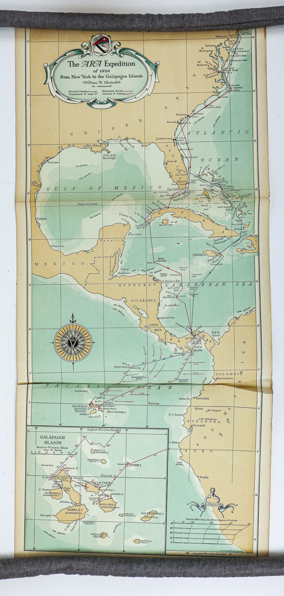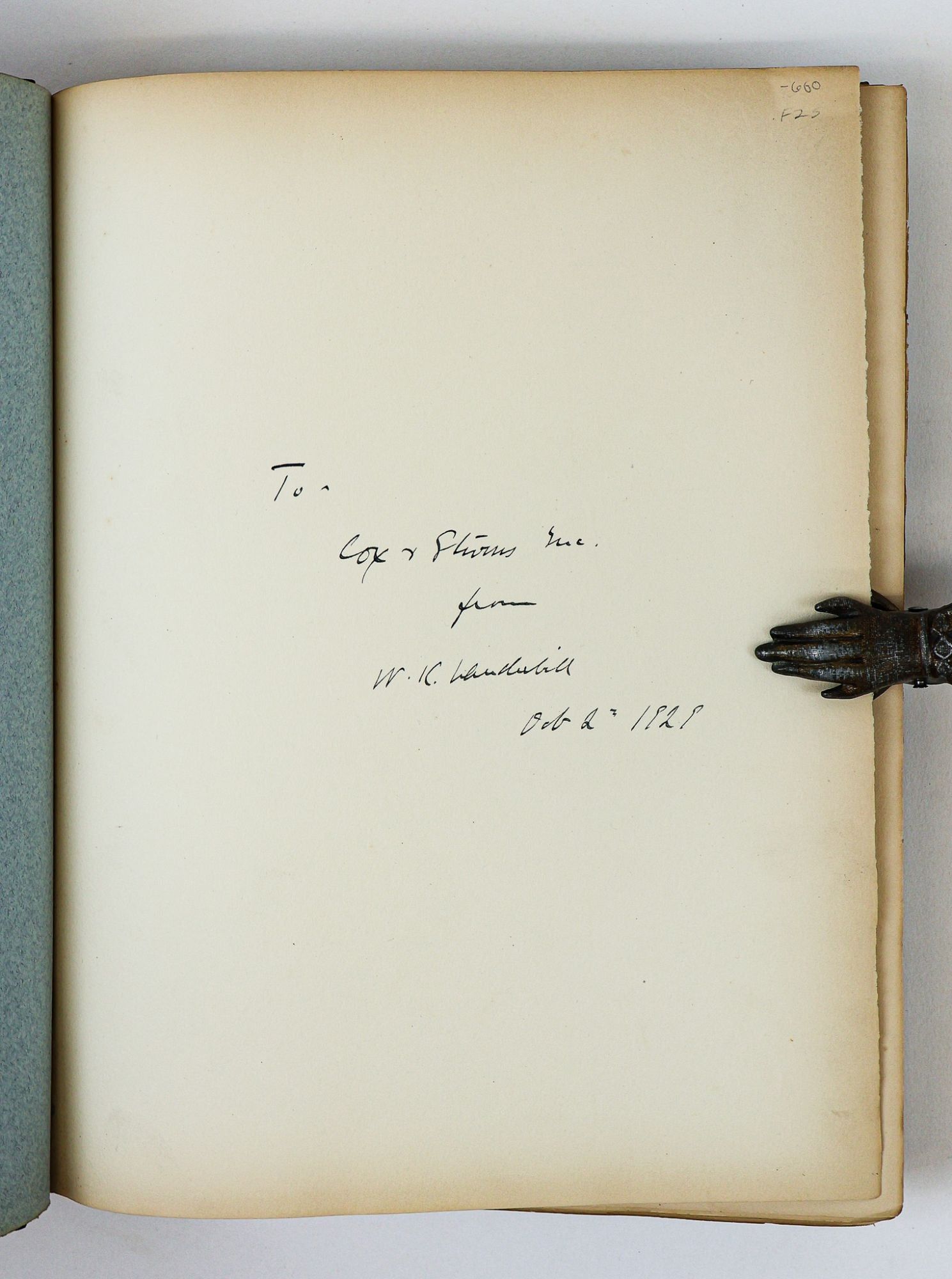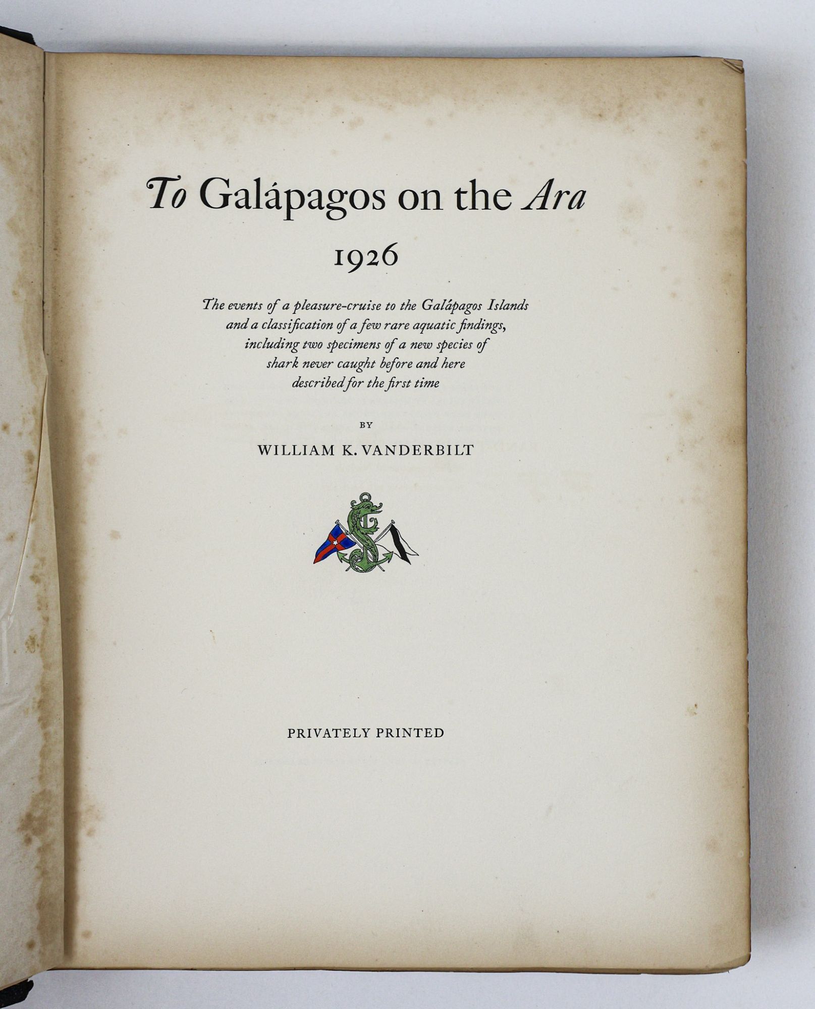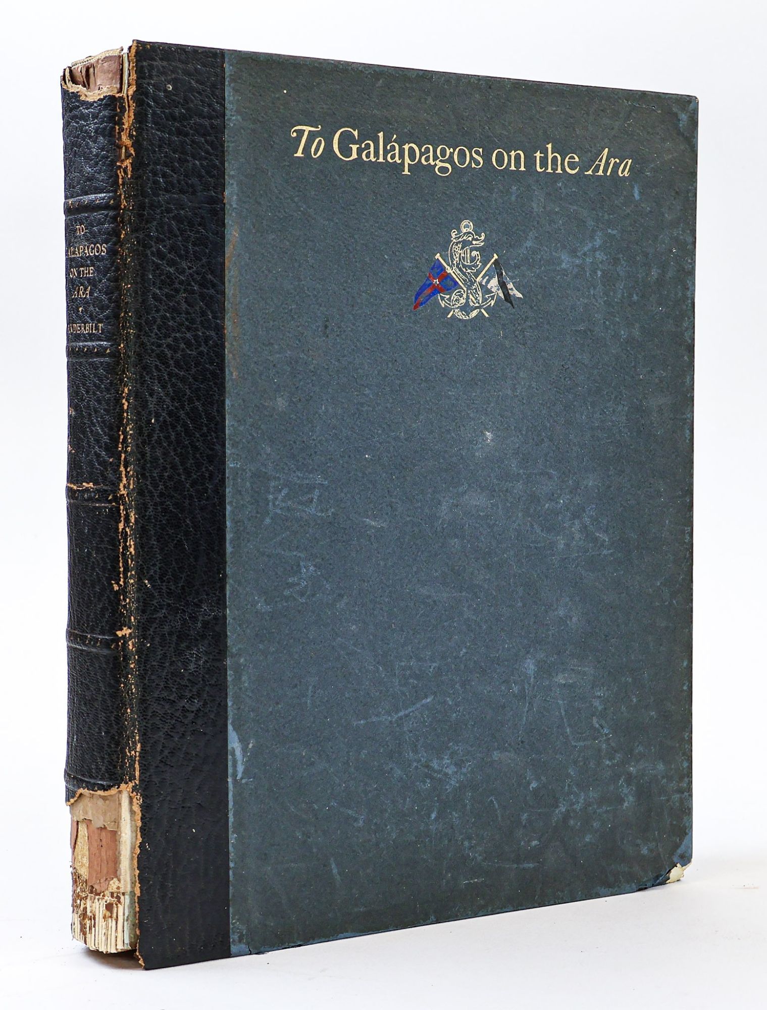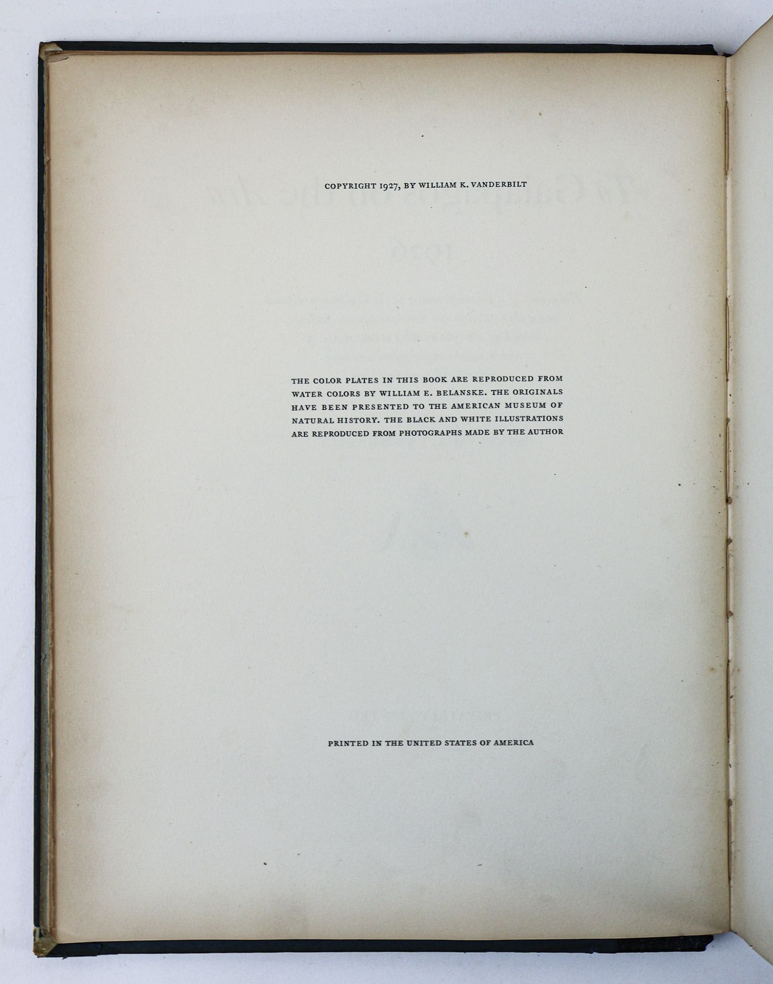 Privately Printed, 1927. Hardcover. Quarto, xv, 161 pages, plus 30 illustrated plates, intext photographs, and a foldout map. In Good minus condition. Quarter bound in black leather with blue paper boards. Spine has gilt lettering with a significant loss of leather to the spine head/tail, resulting in exposed quires. Boards are slightly cocked, have chipping to extremities, age toning, and moderate rubbing wear throughout. Textblock has moderate age toning to edges, moderate foxing to some pages throughout, light offsetting to some pages opposite plates, and stains scattered to some pages throughout. Foldout map is partially detached from textblock. Inscribed "To Cox [illegible] from" and signed by William Vanderbilt and dated "Oct. 2 1929" on the front free end page. Shelved in Room F. 1404152. Special Collections.