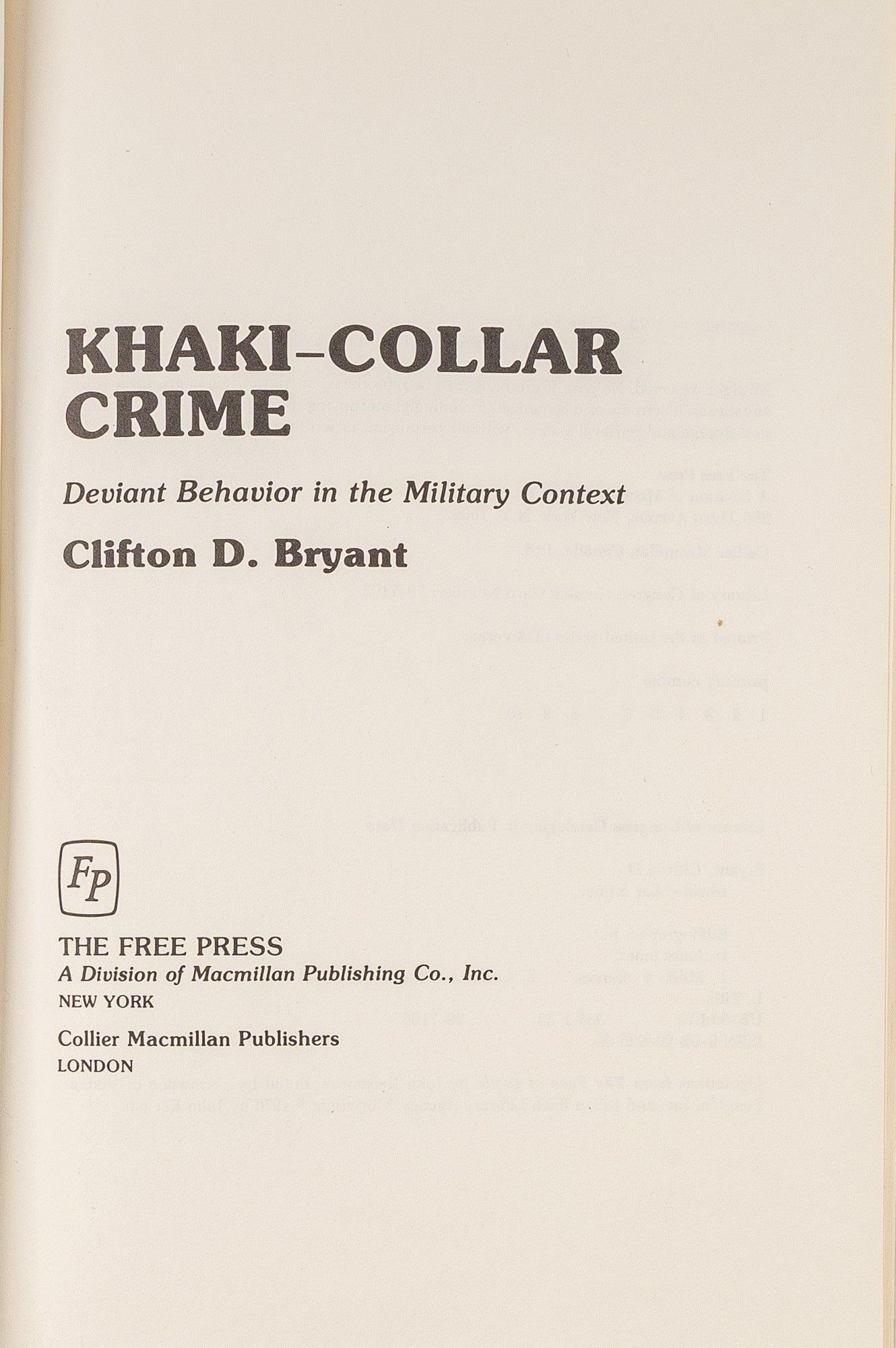 1979. Bryant, Clifton D. Khaki-collar Crime: Deviant Behavior in the Military Context. New York: Free Press, [1979]. xii, 388 pp. Cloth fine in near fine dust jacket. Internally clean. A near fine copy. $20. * Contents: Military Crime and Punishment; Crime, Deviancy, and Social Control in the Military; The Facilitation of Khaki-collar Crime; Intra-occupational Crime; Crimes Against Property; Crimes Against Person; Crimes Against Performance; Crimes Against Performance: Alcohol and Narcotic Addiction; Extra-occupational Crime; Crimes Against Civilians; Inter-occupational Crime; Crimes Against Property; Crimes Against Person; Crimes Against Performance; Epilogue.