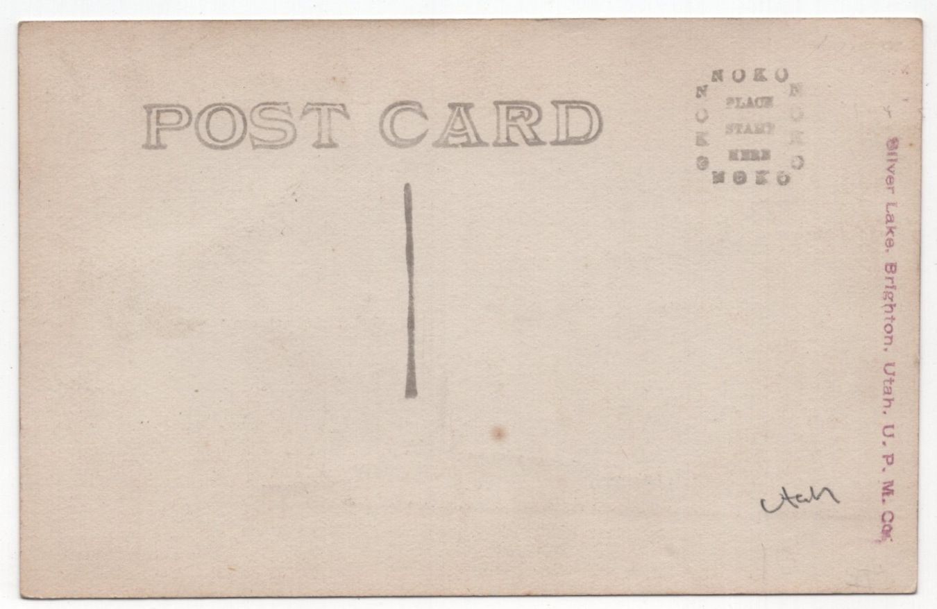 U. P. M. Co. [Utah Photo & Music Company], 1929. Postcard. Near Fine. Real photo postcard [3.5 x 5.5 inches] with divided back. Postally unused. NOKO stamp box. A few hints of age toning. Beautiful image looking down on the majestic Silver Lake at Brighton, UT.