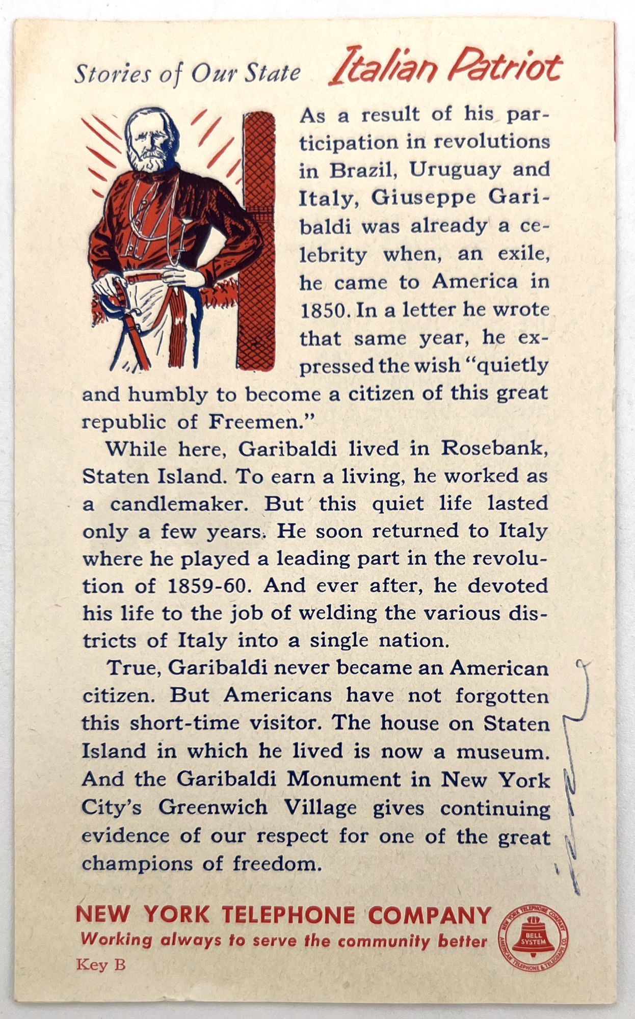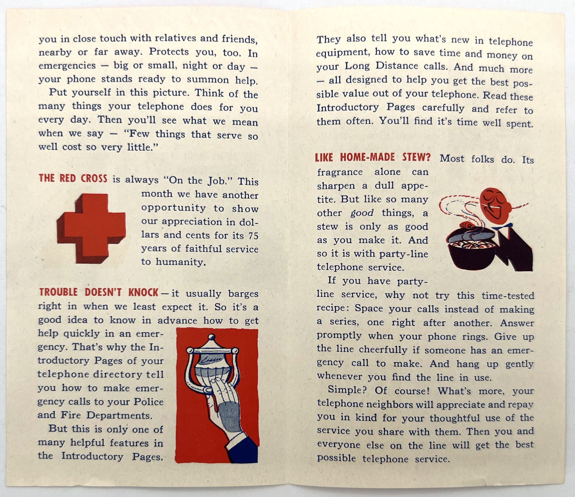 New York, New York: New York Telephone Company, 1950. Very good to near-fine.. Another phone call by a busy homemaker. She could be asking a neighbor to send Johnny home for supper or calling the butcher for a roast or a plumber to fix the leaky faucet. For the telephone has become an indispensable aid in the important job of running a home." An illustrated leaflet promoting the New York Telephone Company (i.e. Bell) to busy housewives in the 1950s. Includes a photo of a smiling housewife on the phone, with perfectly coifed hair and neat apron. Promotes party-line telephone service, and ends with (for some unknown reason) a brief description of the Italian revolutionary Giuseppe Garibaldi's visit to Staten Island in the 1850s. Printed in red and blue, measures approx. 5.5" by 3.25
