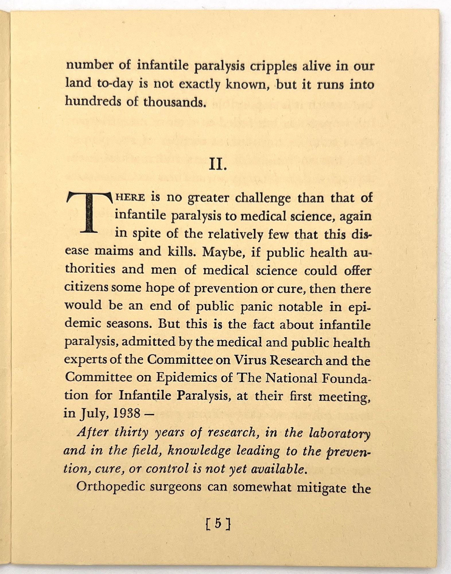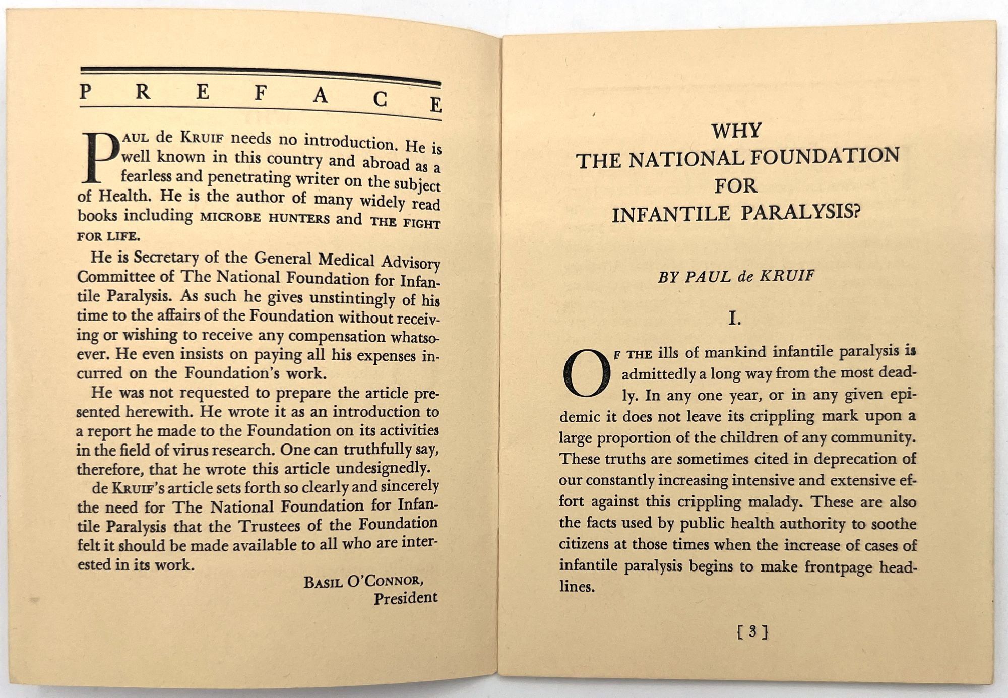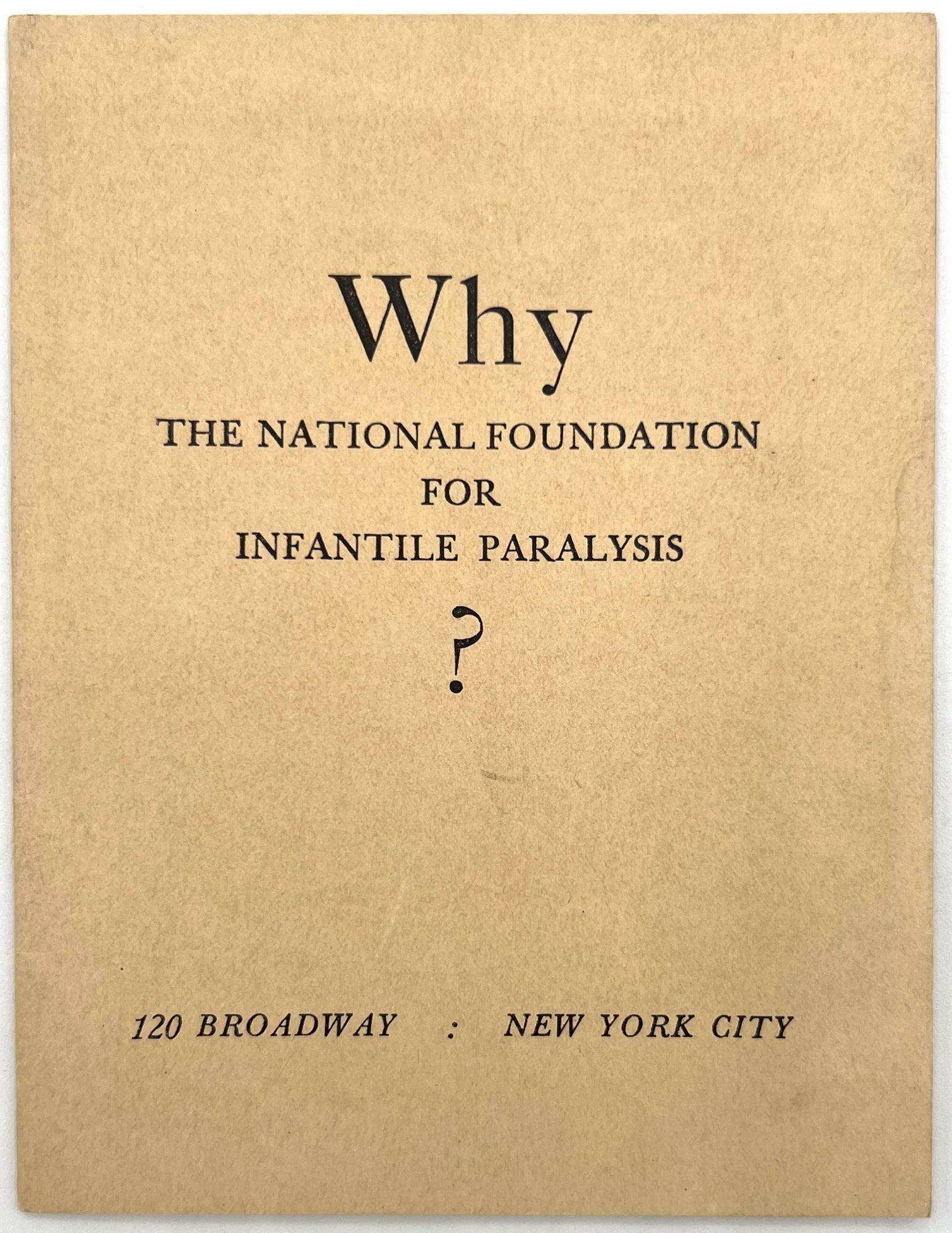 New York, New York: National Foundation for Infantile Paralysis, 1939. Very good. Toned.. An informational booklet on the National Foundation for Infantile Paralysis, including a brief overview of the organization's mission and a full listing of trustees and committee members. Founded in 1938 by Franklin D. Roosevelt and Basil O'Connor, it eventually became the well-known organization "March of Dimes". This booklet offers good insight into the terror that gripped many parents, even at this early stage of the disease's history: "The most skillful propaganda has failed to remove infantile paralysis from its top rank as terrifier of the people. The human insight of fathers and mothers looks through the reassuringly low sickness and death rates displayed to them by our public healthmen" (p. 4). Notably, this was published before the polio vaccine was developed. Single vol. (6" by 4.5"), pp. 16, in original printed self wrps.