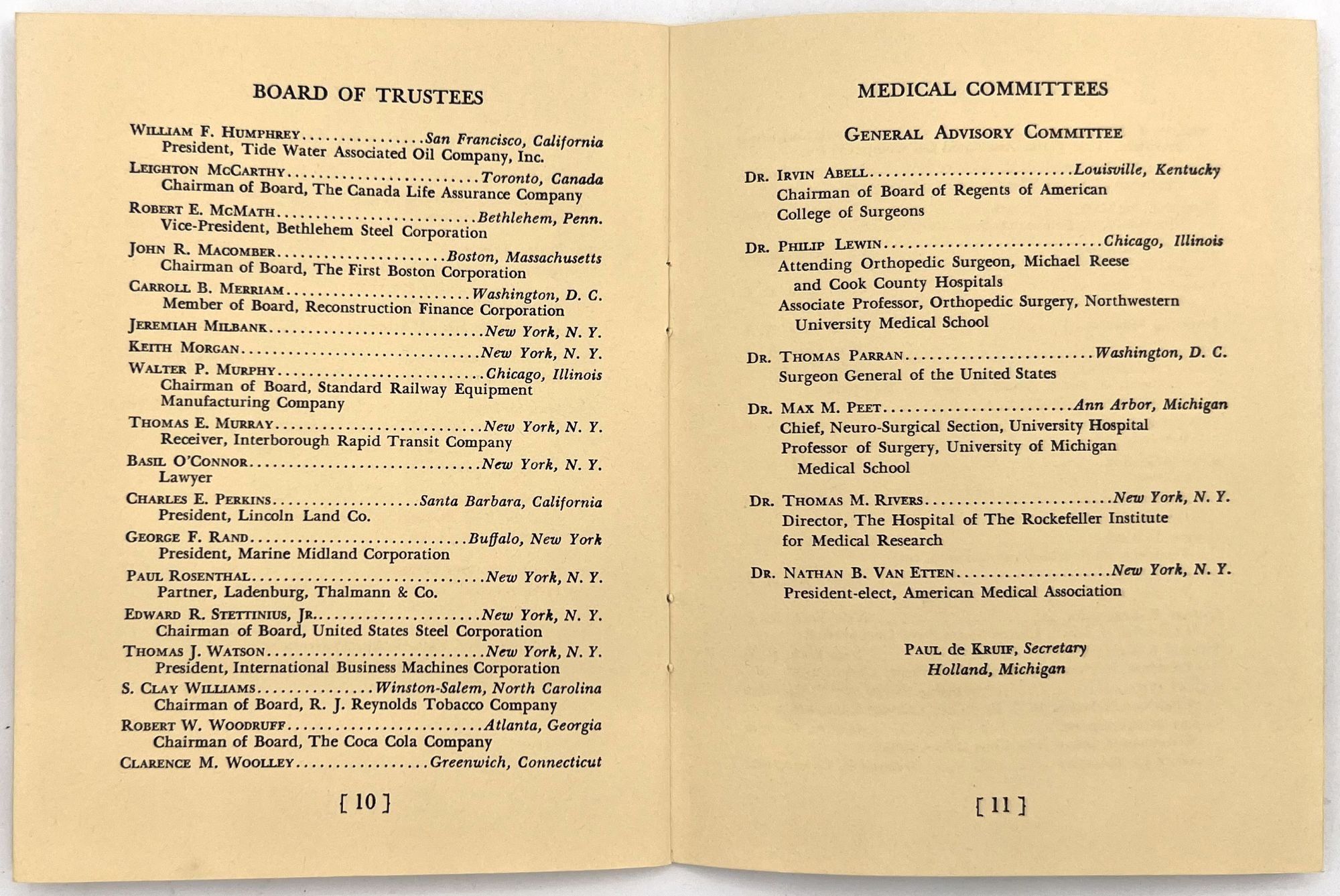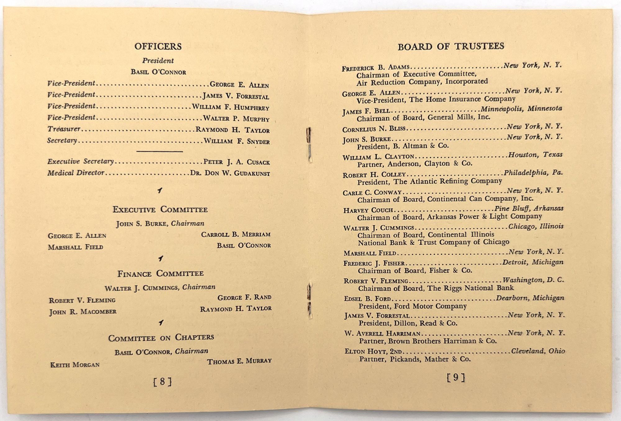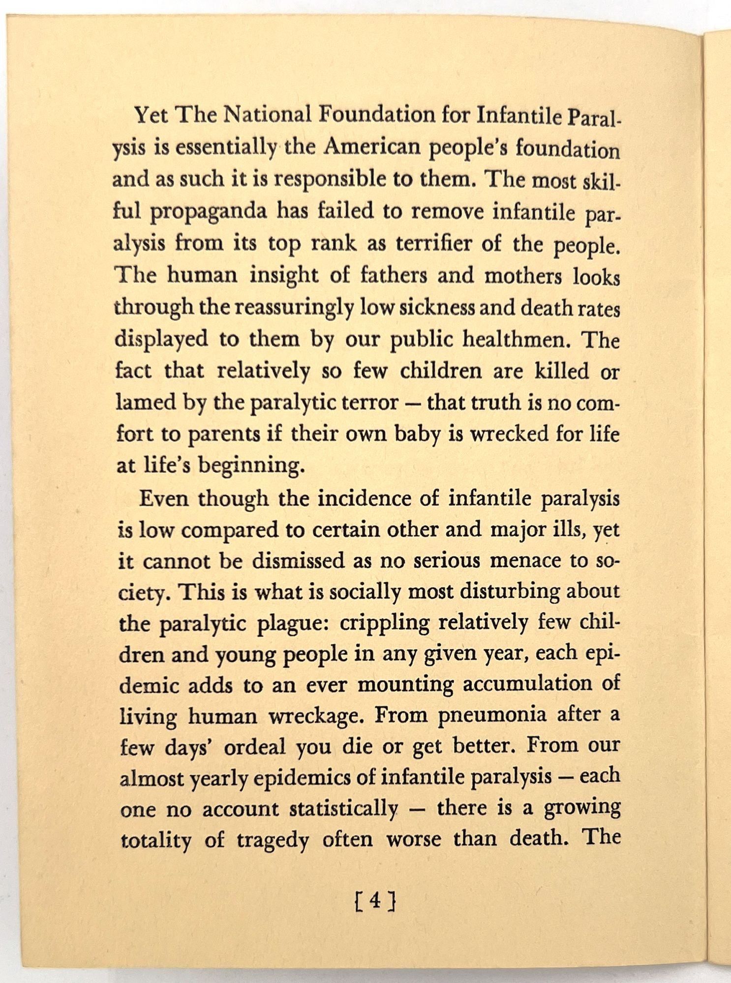 New York, New York: National Foundation for Infantile Paralysis, 1939. Very good. Toned.. An informational booklet on the National Foundation for Infantile Paralysis, including a brief overview of the organization's mission and a full listing of trustees and committee members. Founded in 1938 by Franklin D. Roosevelt and Basil O'Connor, it eventually became the well-known organization "March of Dimes". This booklet offers good insight into the terror that gripped many parents, even at this early stage of the disease's history: "The most skillful propaganda has failed to remove infantile paralysis from its top rank as terrifier of the people. The human insight of fathers and mothers looks through the reassuringly low sickness and death rates displayed to them by our public healthmen" (p. 4). Notably, this was published before the polio vaccine was developed. Single vol. (6" by 4.5"), pp. 16, in original printed self wrps.