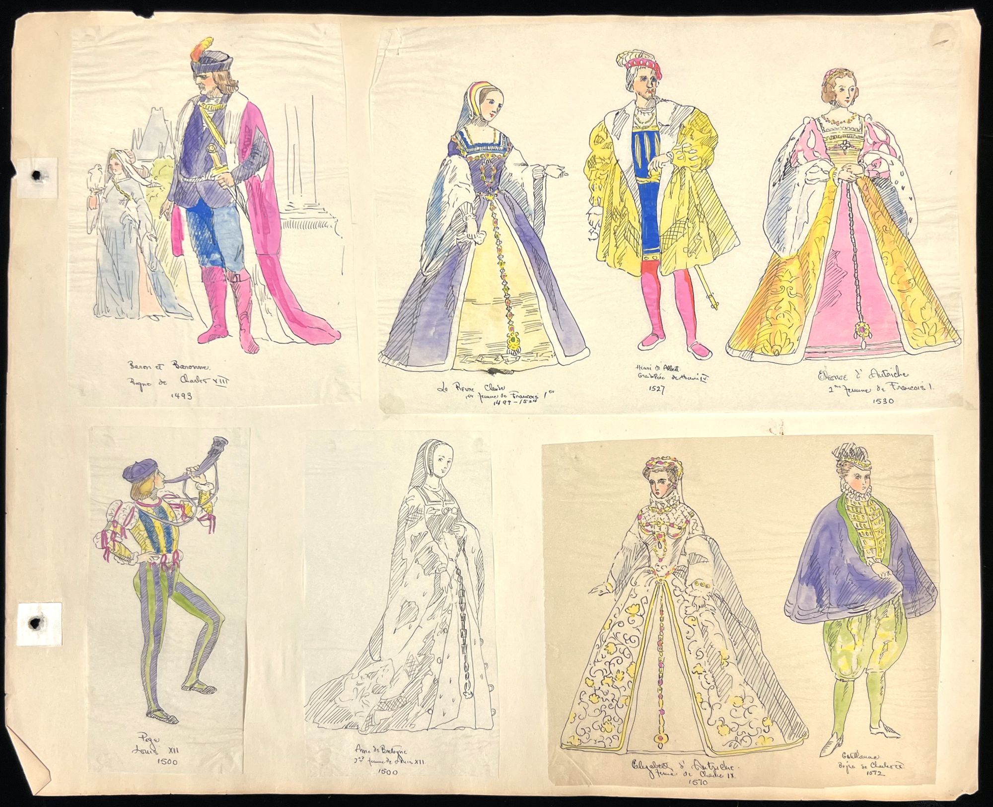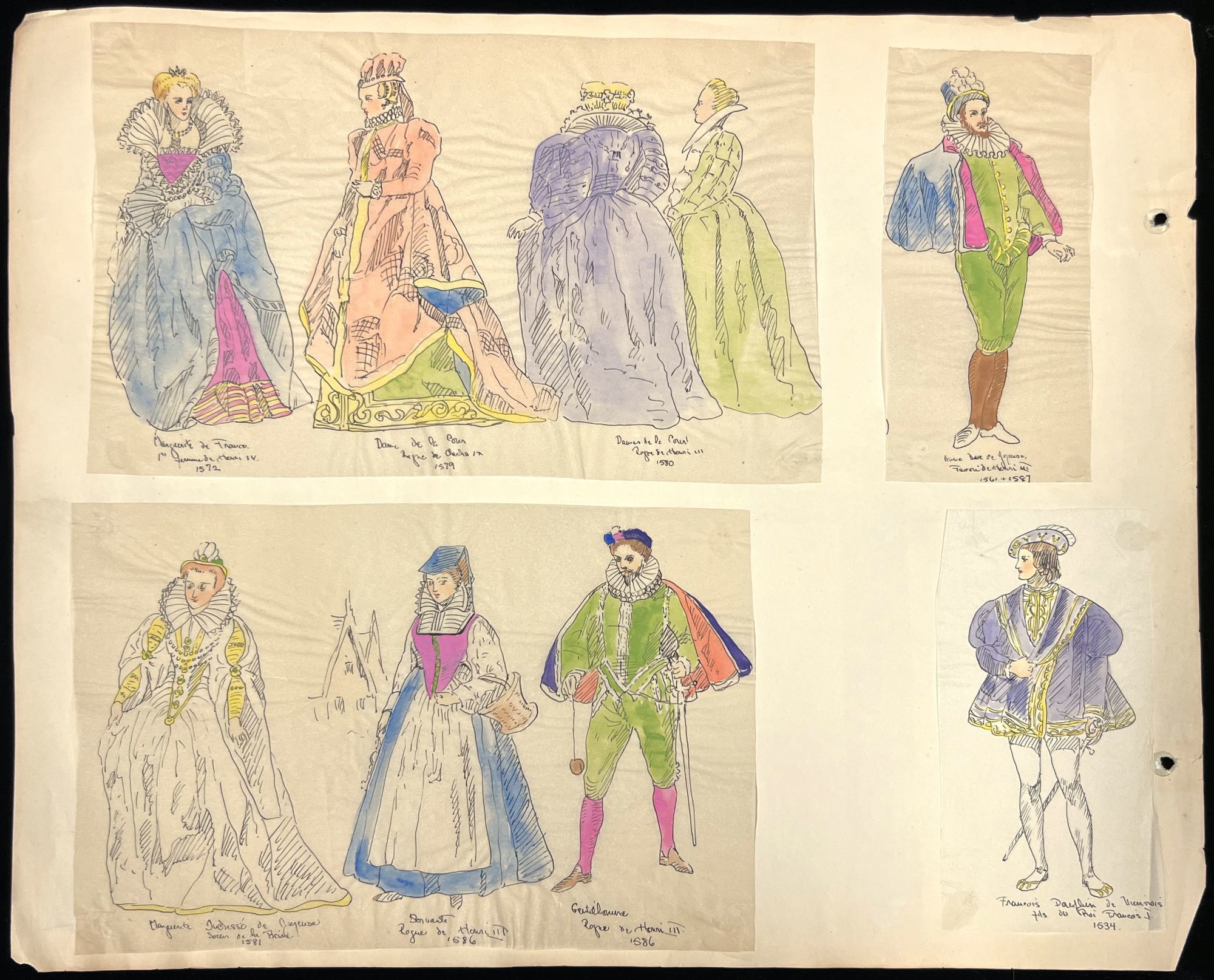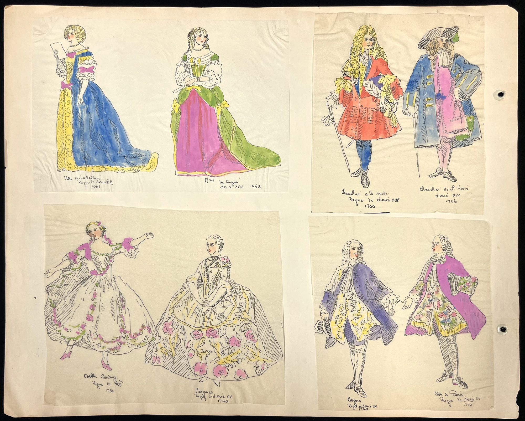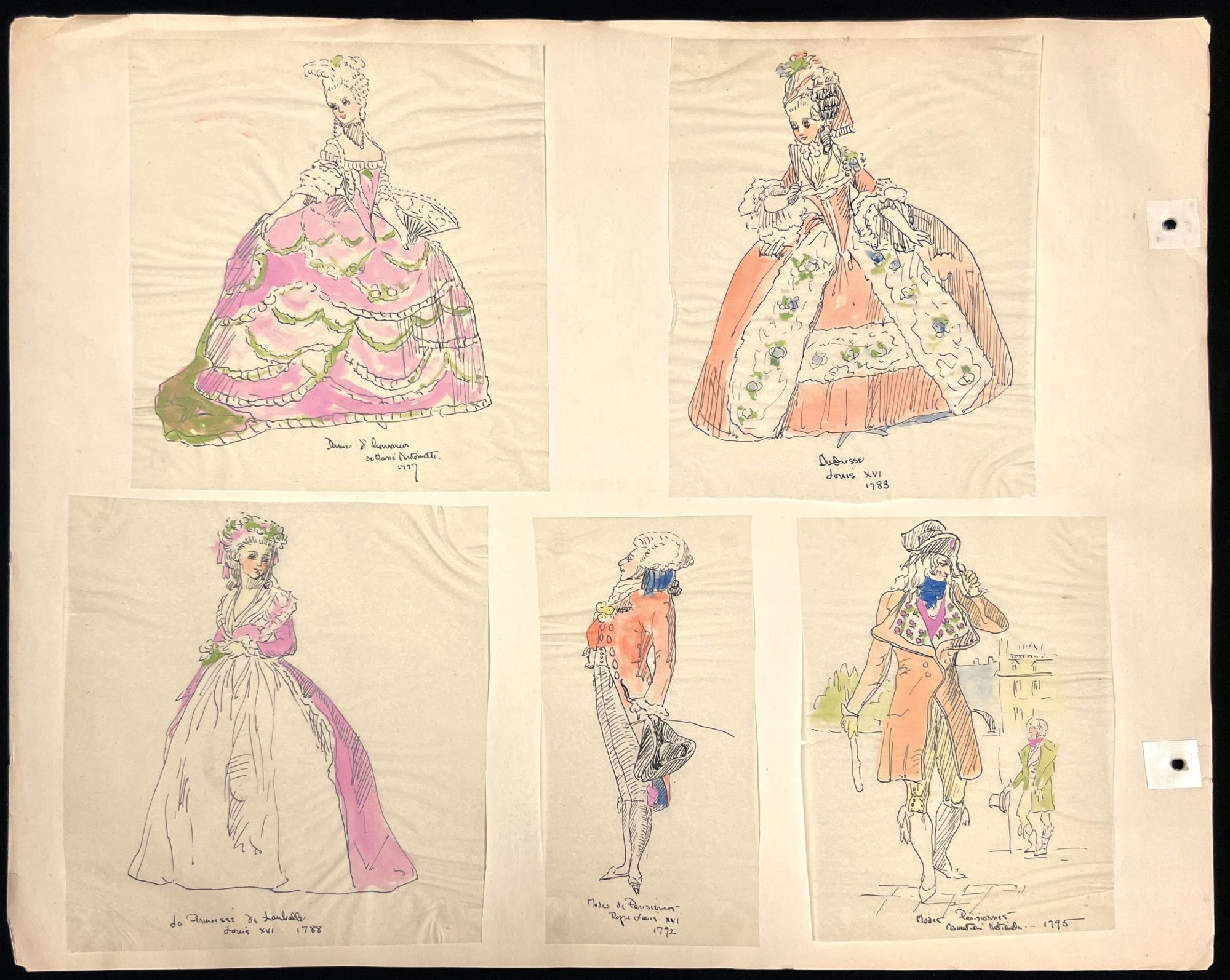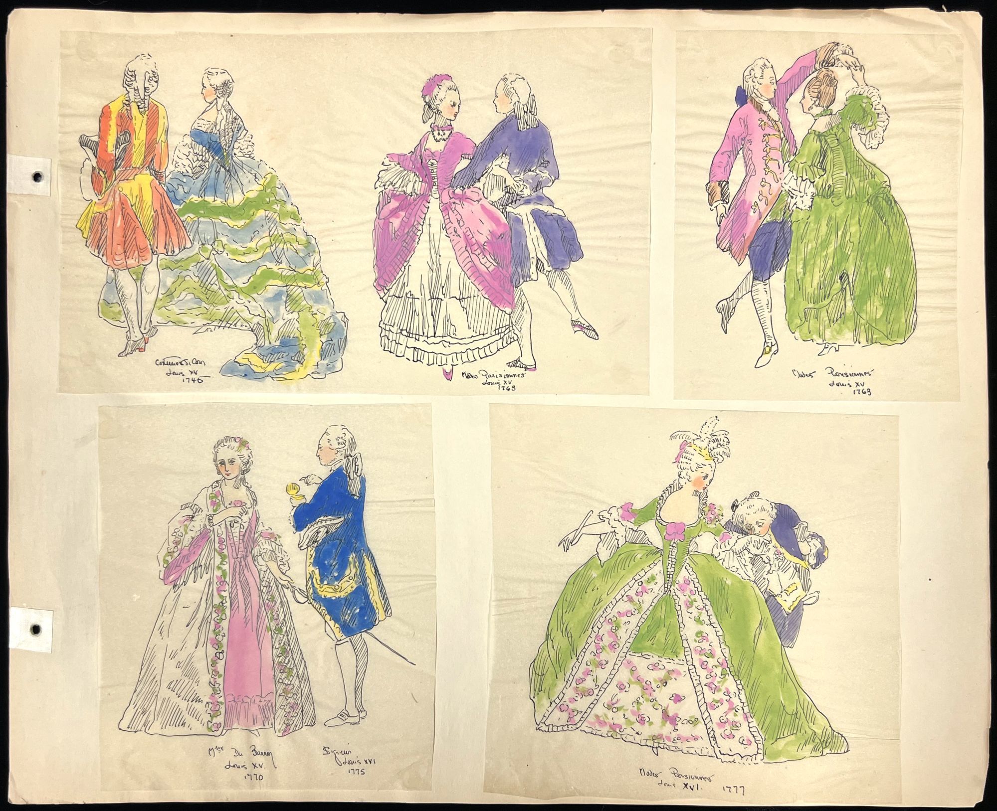 N.pl. (France?), 1920. Very good. Light toning, short tears, some warping from adhesive used on tissue.. Original costume designs, rendered in pen and ink with watercolor, depicting fifty-nine (59) different historical figures, fashions, and styles from between 493 and 1807. Dated 1920, the designs are inscribed on the cover leaf in contemporary ink: "Presented to Mary Black Diller By Helen H. Holbrook January 1920". The designs are labeled in ink in a separate hand, with sadly no indication of who the original artist was. Each design is on its own small leaf of tissue paper pasted onto larger sheets, each measuring approx. 14" by 17". There are five leaves, with an additional cover leaf. Sometime disbound from original binding or portfolio. Fifty-nine (59) total designs (some sharing same tissue paper leaf).