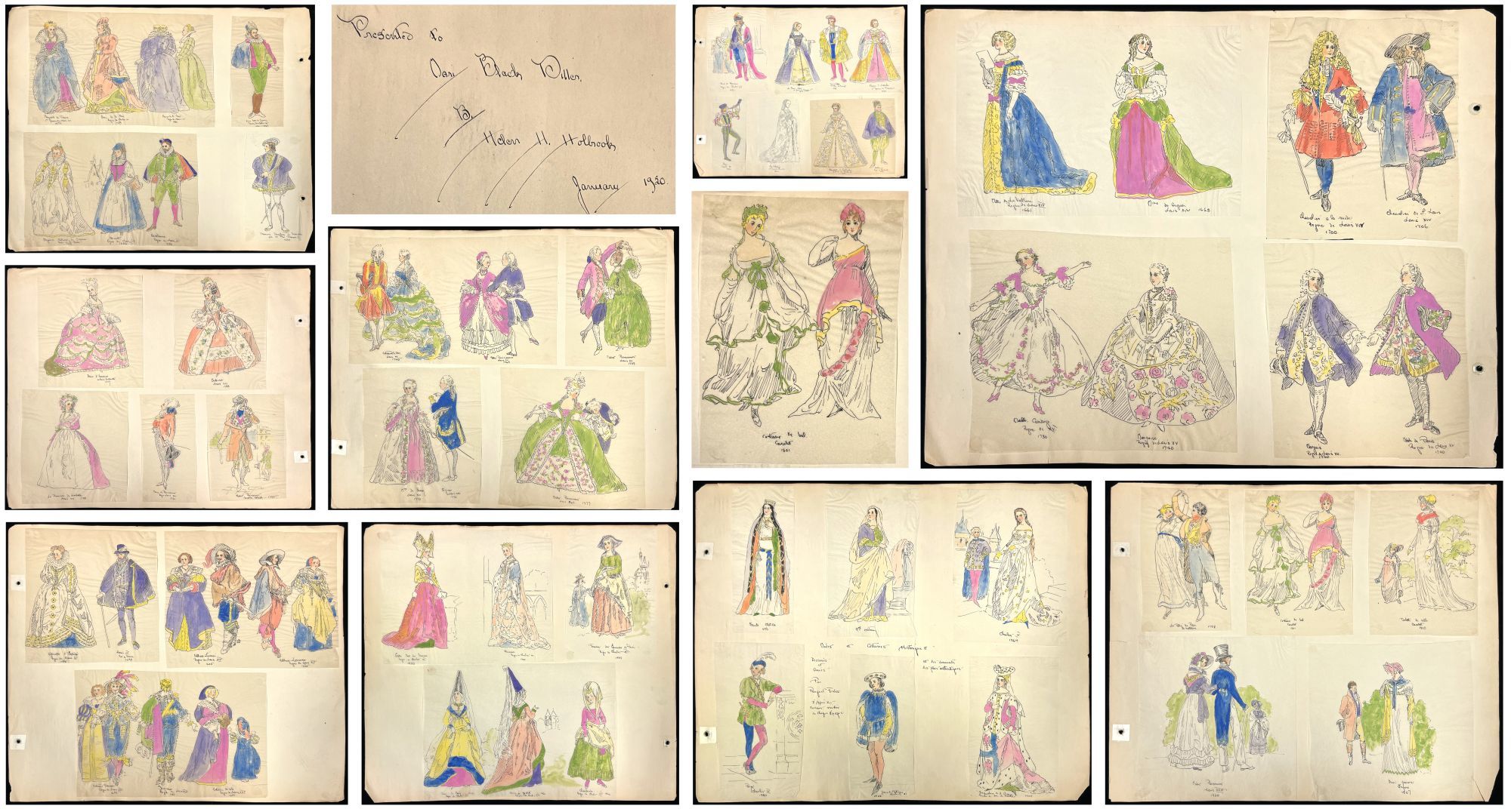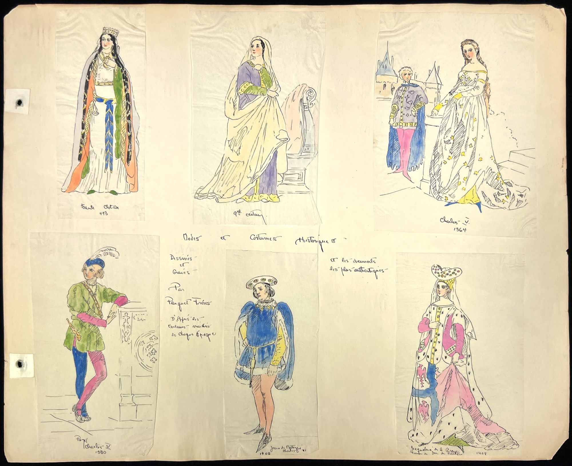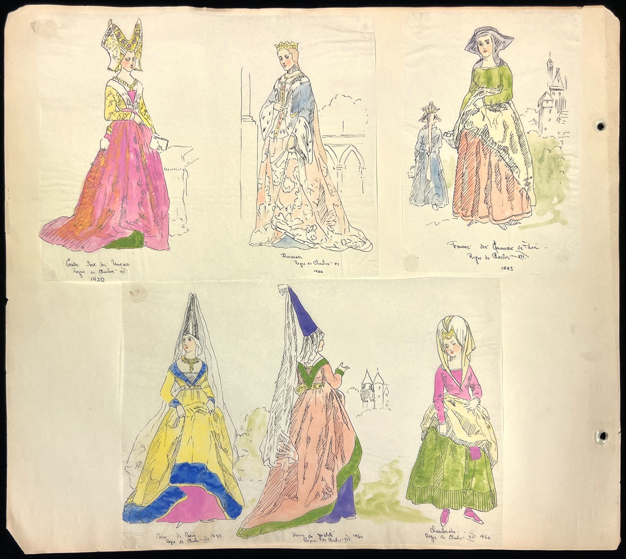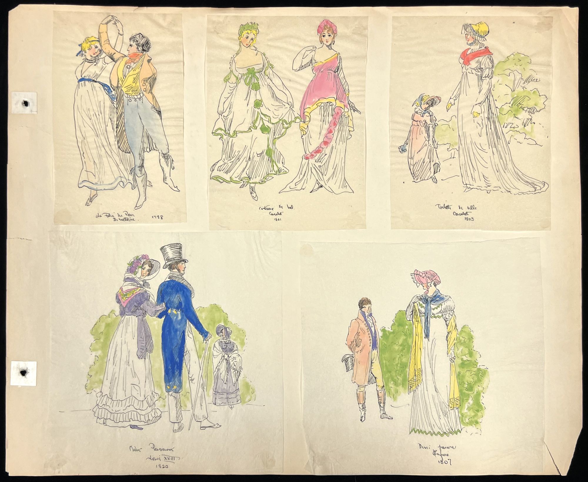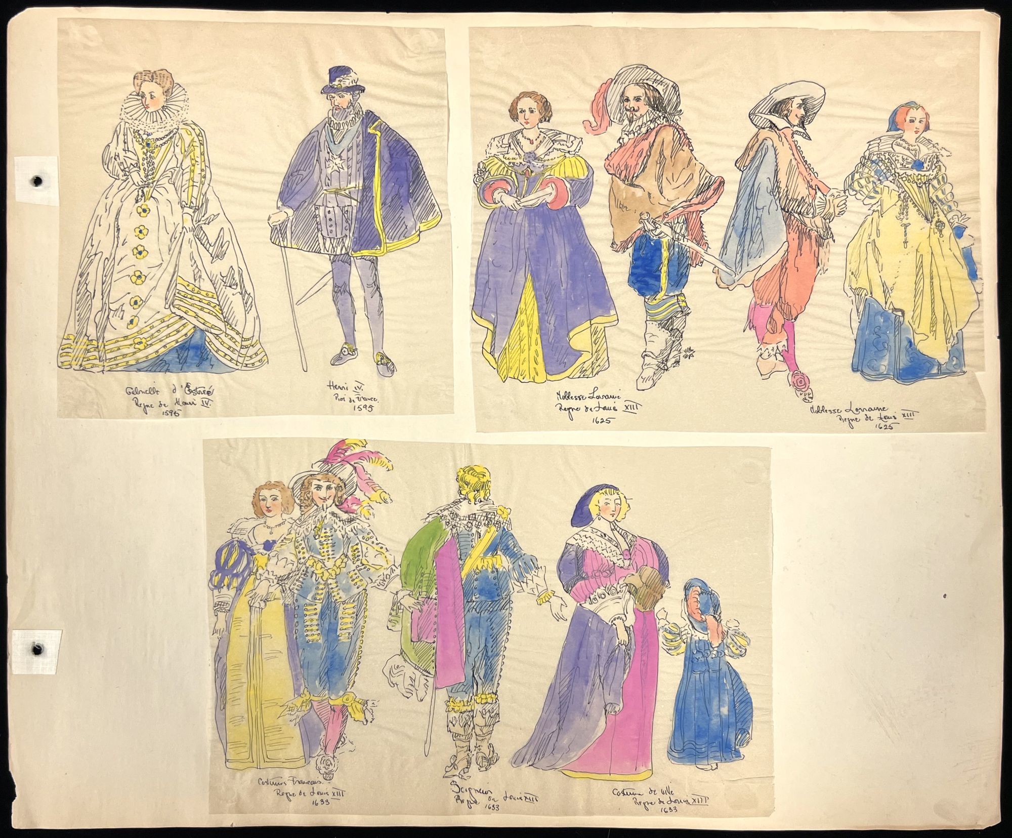 N.pl. (France?), 1920. Very good. Light toning, short tears, some warping from adhesive used on tissue.. Original costume designs, rendered in pen and ink with watercolor, depicting fifty-nine (59) different historical figures, fashions, and styles from between 493 and 1807. Dated 1920, the designs are inscribed on the cover leaf in contemporary ink: "Presented to Mary Black Diller By Helen H. Holbrook January 1920". The designs are labeled in ink in a separate hand, with sadly no indication of who the original artist was. Each design is on its own small leaf of tissue paper pasted onto larger sheets, each measuring approx. 14" by 17". There are five leaves, with an additional cover leaf. Sometime disbound from original binding or portfolio. Fifty-nine (59) total designs (some sharing same tissue paper leaf).