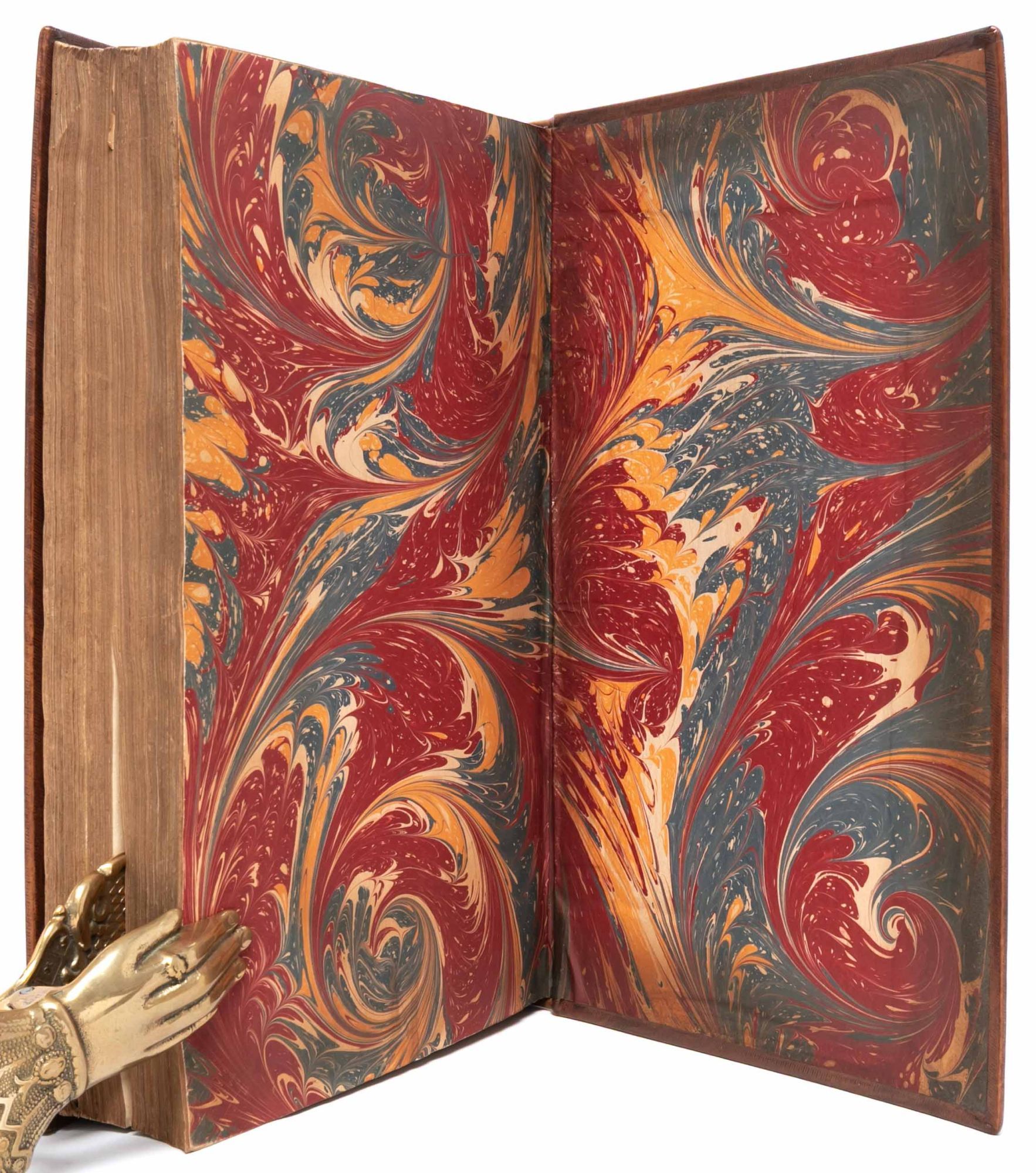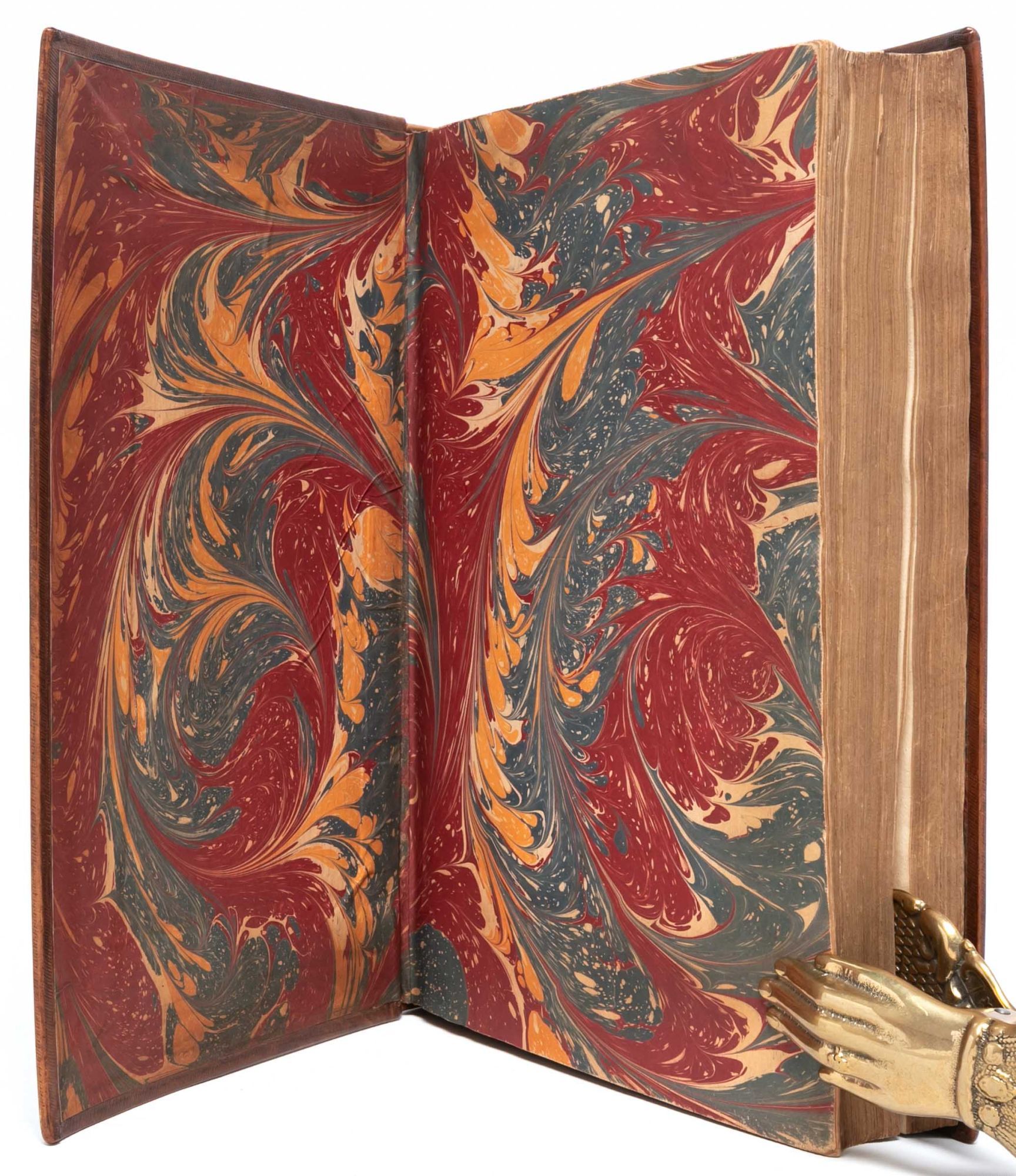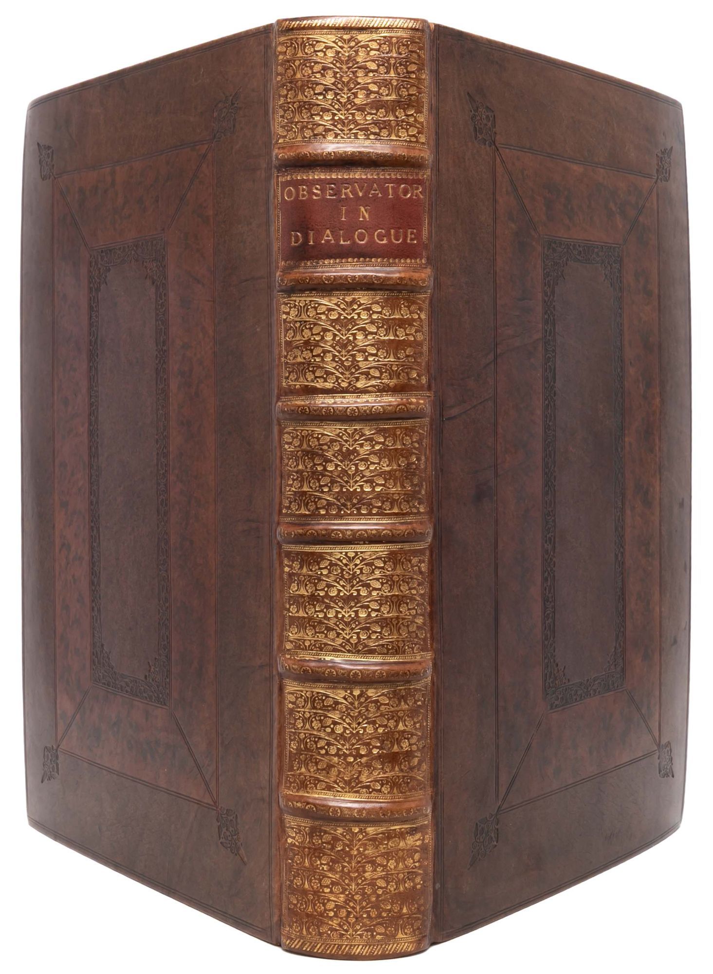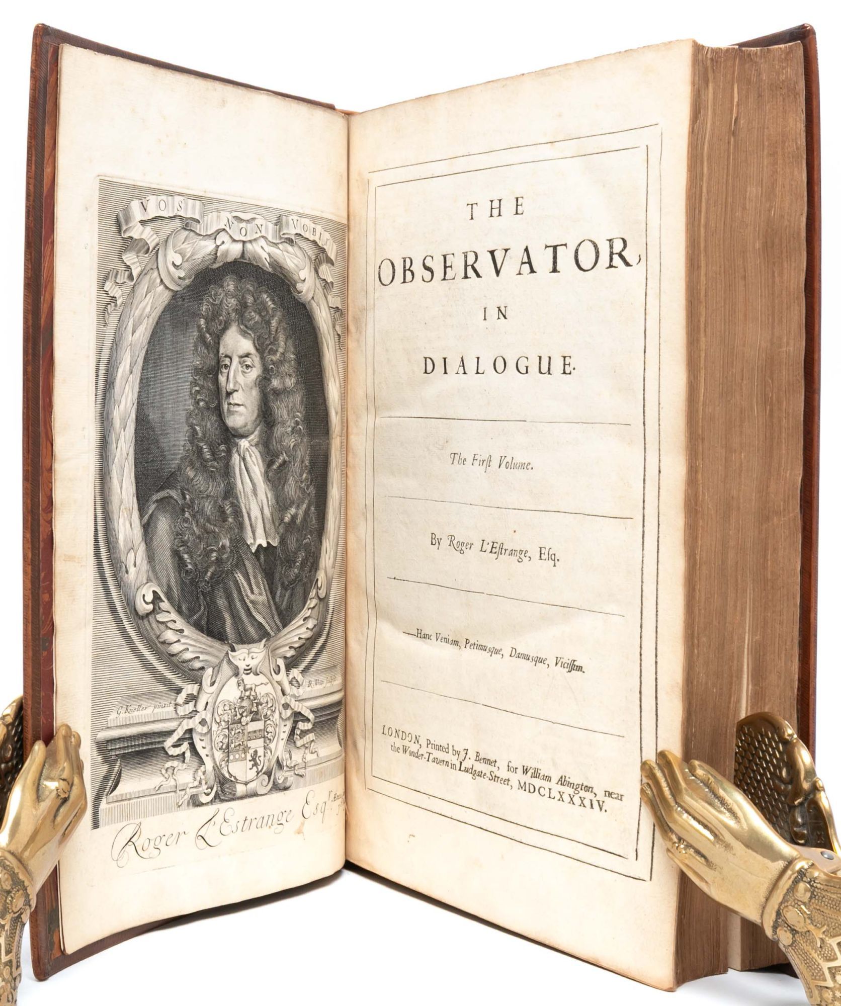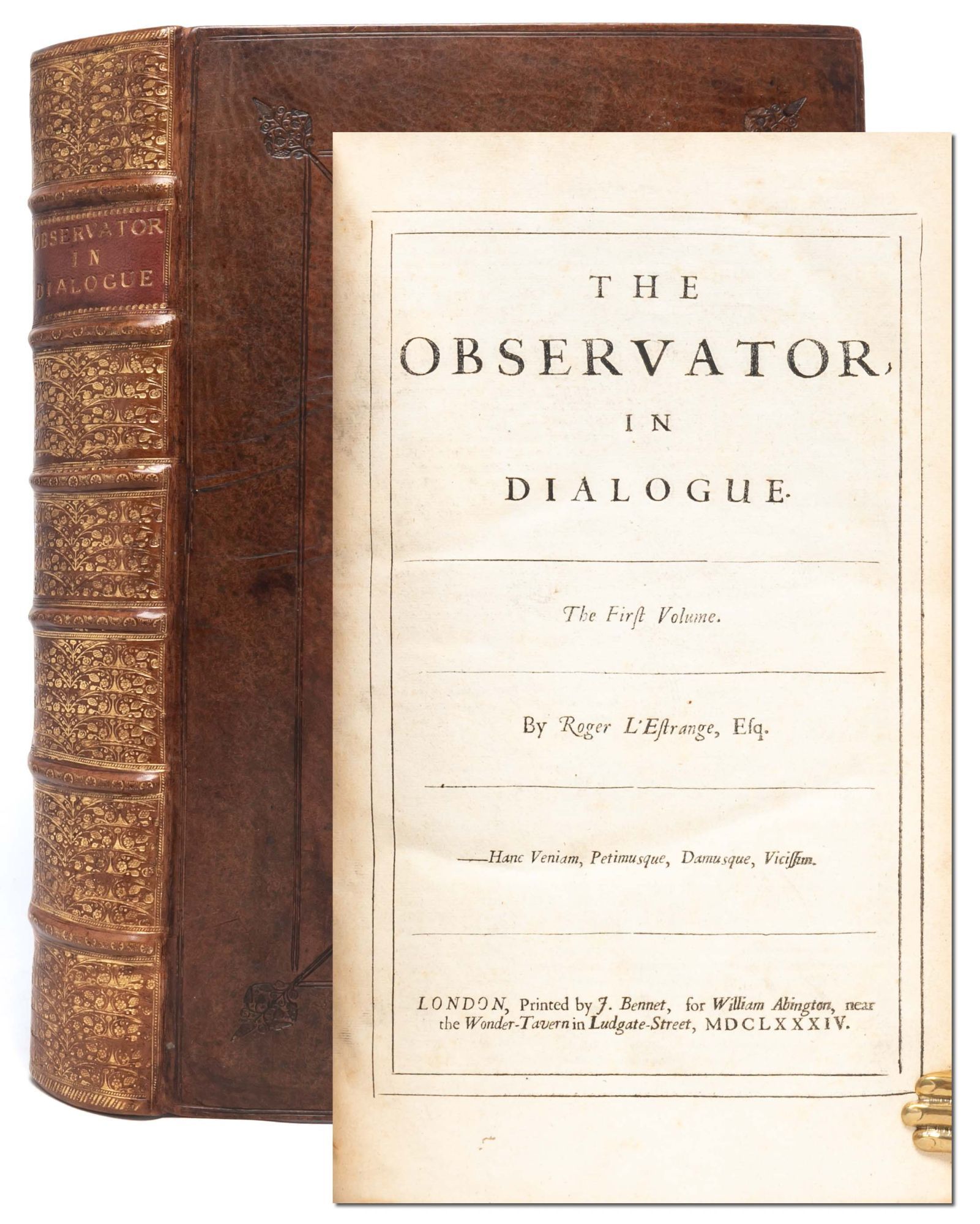 London: Printed by J. Bennett, for William Abington, 1684. First edition. Very Good +. Volume I (of 3) of the first collected edition of The Observator, Nos. 1 (Wednesday, April 13, 1681) to 470 (Wednesday, January 9, 1683). Folio (13 1/8 x 8 1/8 inches; 333 x 207 mm). [2], [4, “To the Reader”], [8, “The Table”], [3, contents], [1, blank] pp. followed by The Observator Nos. 1-470 (unpaginated). Engraved frontispiece portrait of Roger L’Estrange, dated 1684, by R. White after G. Kneller. Handsomely rebound in antique Cambridge-style paneled calf. Covers decoratively ruled and tooled in blind, spine richly tooled in gilt in compartments with six raised bands and red morocco gilt lettering label, board edges and turn-ins decoratively tooled in blind, marbled endpapers. An excellent copy.