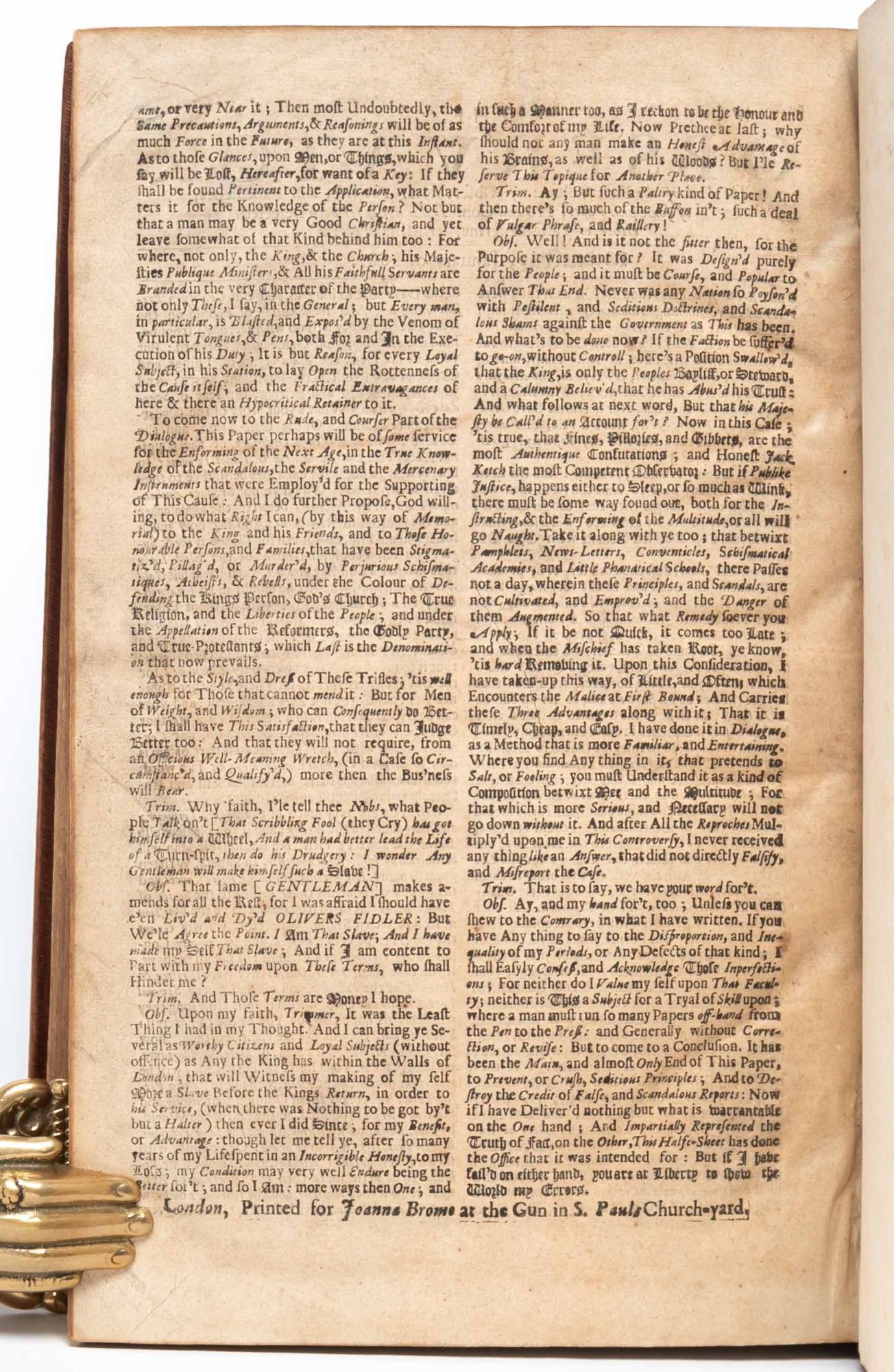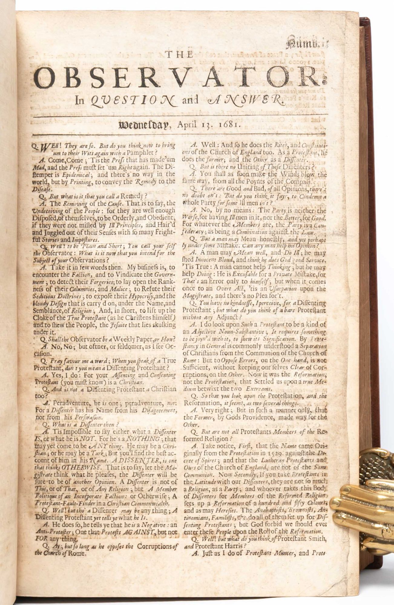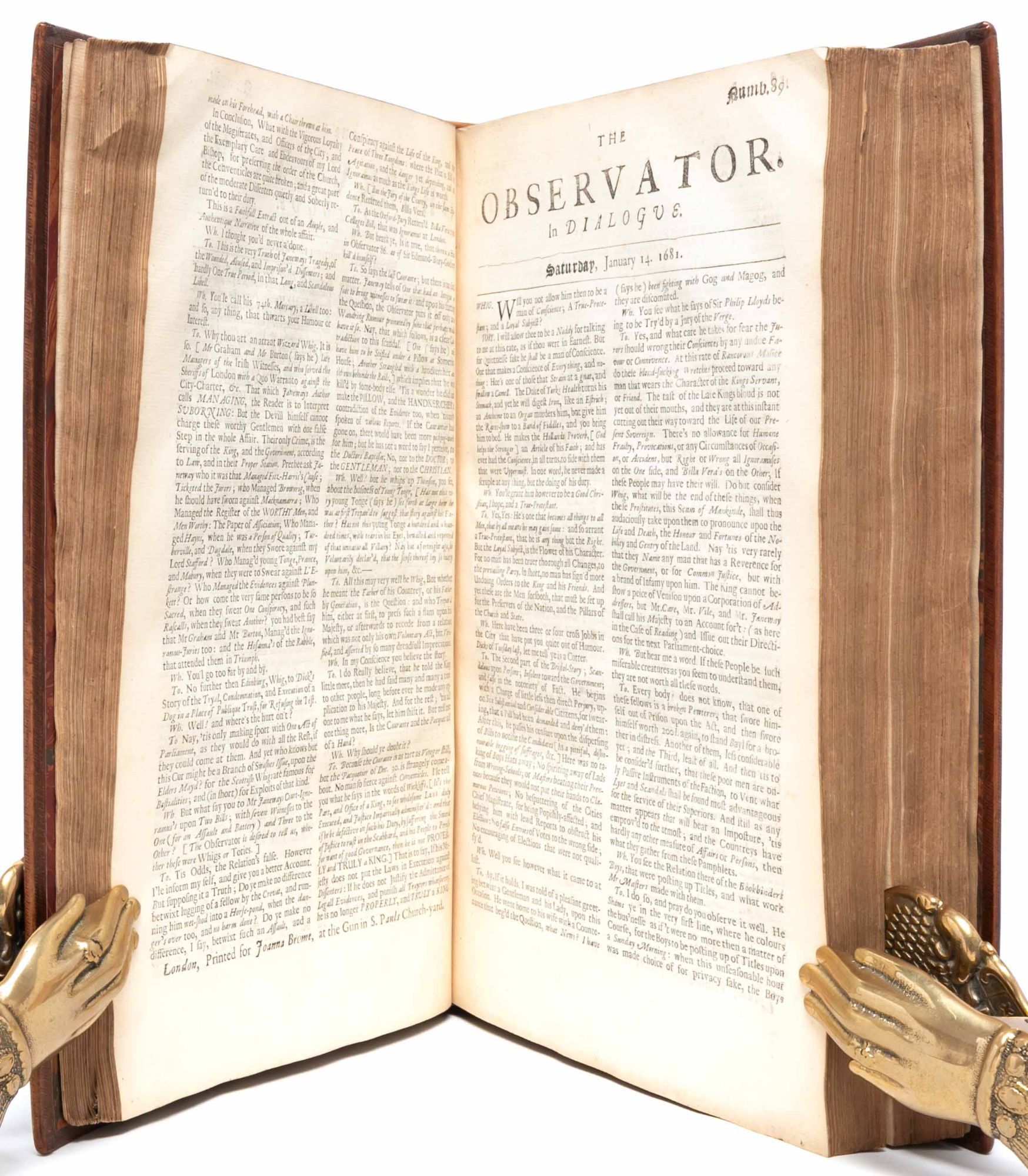 The Observator was a newspaper written in the form of a dialogue by Roger L'Estrange, and published from April 13, 1681 to March 9, 1687. There were 470 issues in the first volume (as offered here), 215 issues in the second volume, and 246 issues in the third and last volume. "Rumbustious and vitriolic, satiric and savage, week after week for six years and through two million words, Roger L'Estrange's newspaper, The Observator, corroded the foundations of Whiggery…The Observator was the work of a compulsive writer, a feat of literary endurance…L'Estrange was, said his enemies, the 'scribbler-general of Tory-land'…Its prose hectic, its thoughts haphazard, the Observator lay, its author admitted, somewhere 'betwixt fooling and philosophizing.' It transposed to print the Restoration's fondest verbal facility, raillery, delivering a cascade of libel and abuse, tempered by seriocomic moralizing, and philosophy and political theory reduced to epithets and exclamations...Its deliberate coarseness puts it at an arresting remove from the high eloquence of Dryden. Polite it was not. The Observator was Toryism at its most unbuttoned and vulgar. It was routinely scatological, or, more precisely, urological...The relentless repetitiveness of the Observator is half-redeemed by its inventiveness. The Whigs are not just a faction: they are a 'cabal,' 'consult,' consistory,' 'confederacy,' conspiracy,…' This was politics by thesaurus" (Goldie, in Roger L'Estrange and the Making of Restoration Culture, pp. 67-68).