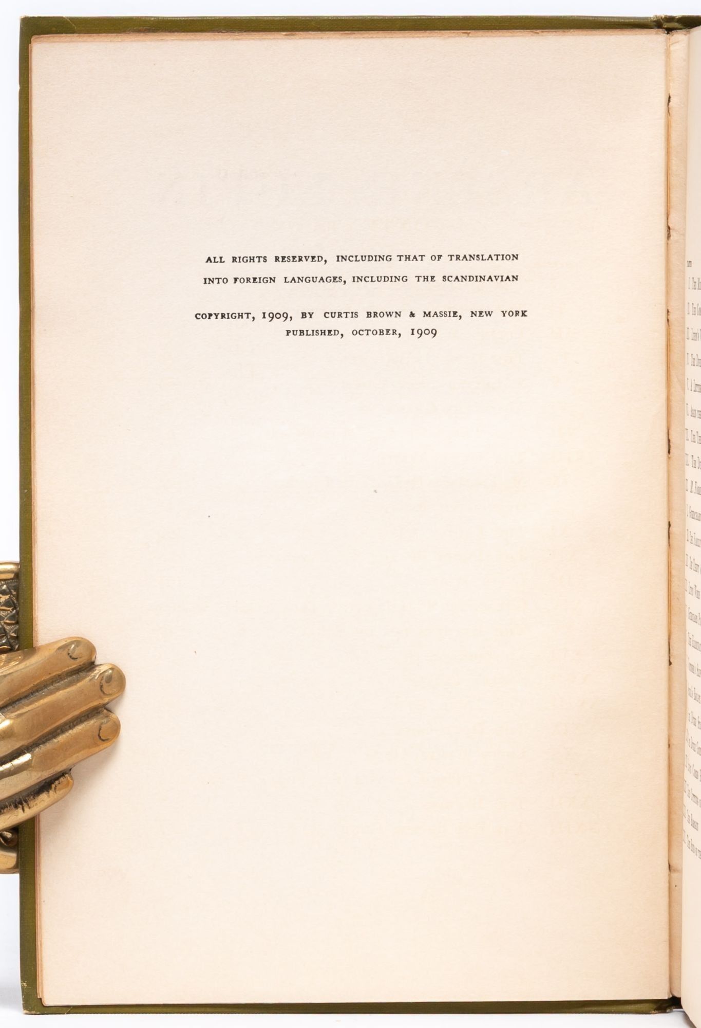 New York: Doubleday, Page and Company, 1909. First American edition. Near Fine. A Near Fine copy of the book. Bound in green cloth, spamped in black with onlay illustration to the front board. Complete with four illustrated plates (including the frontis). A few small dampstains to the illustrated front board, spine gently rolled, and small closed tear to upper margin of pages 185-186 not affecting text. Otherwise and attractive copy.