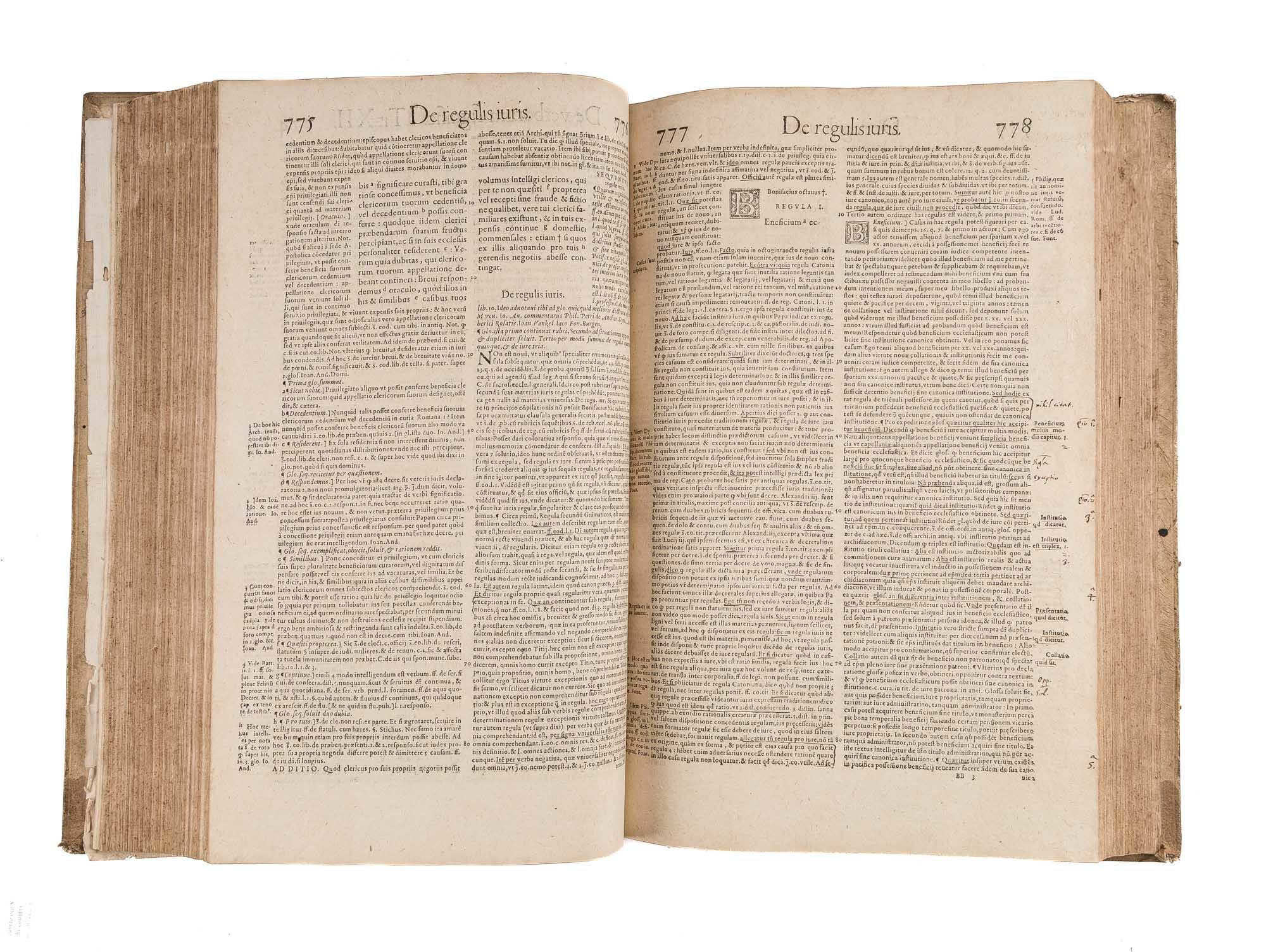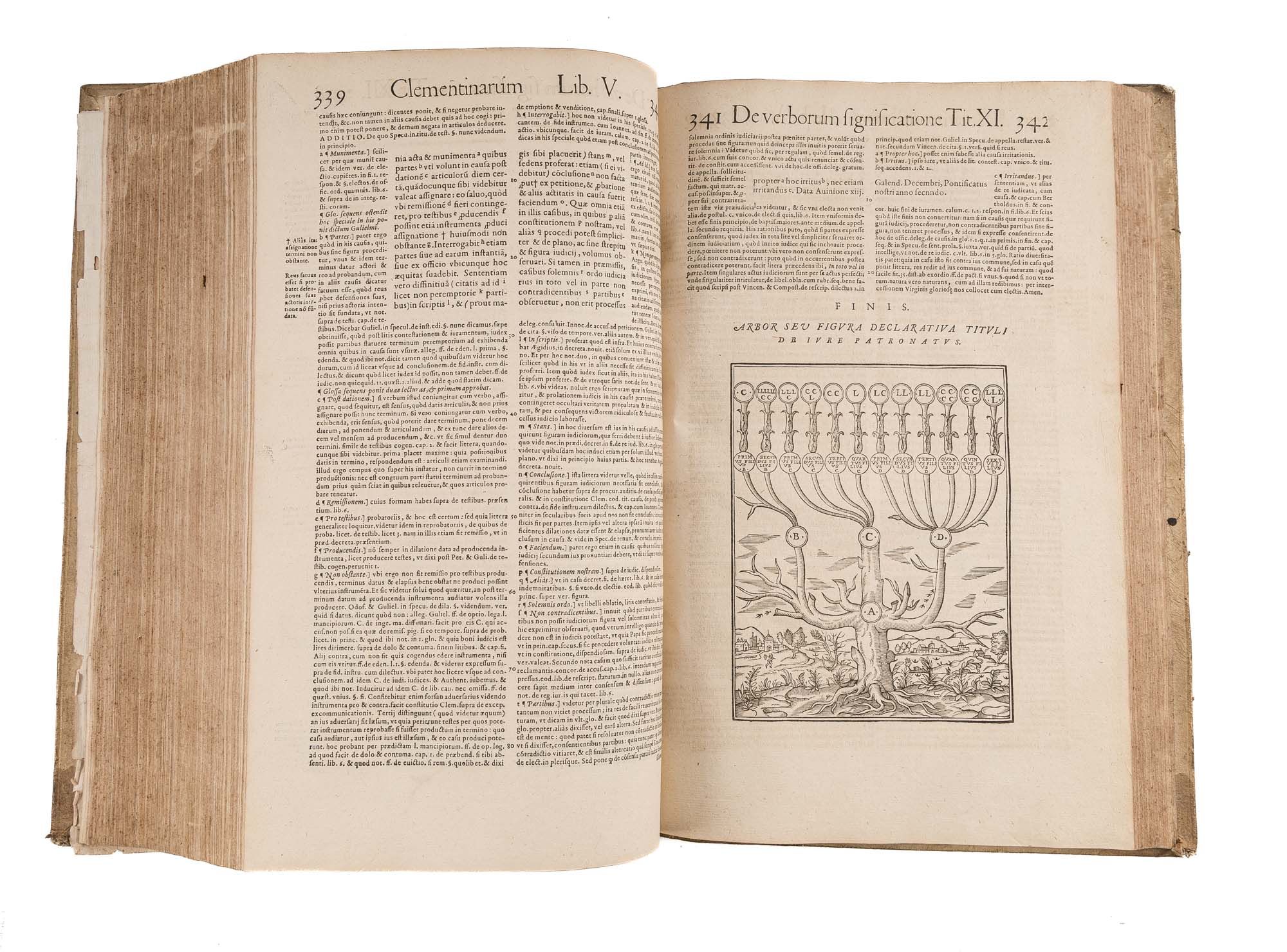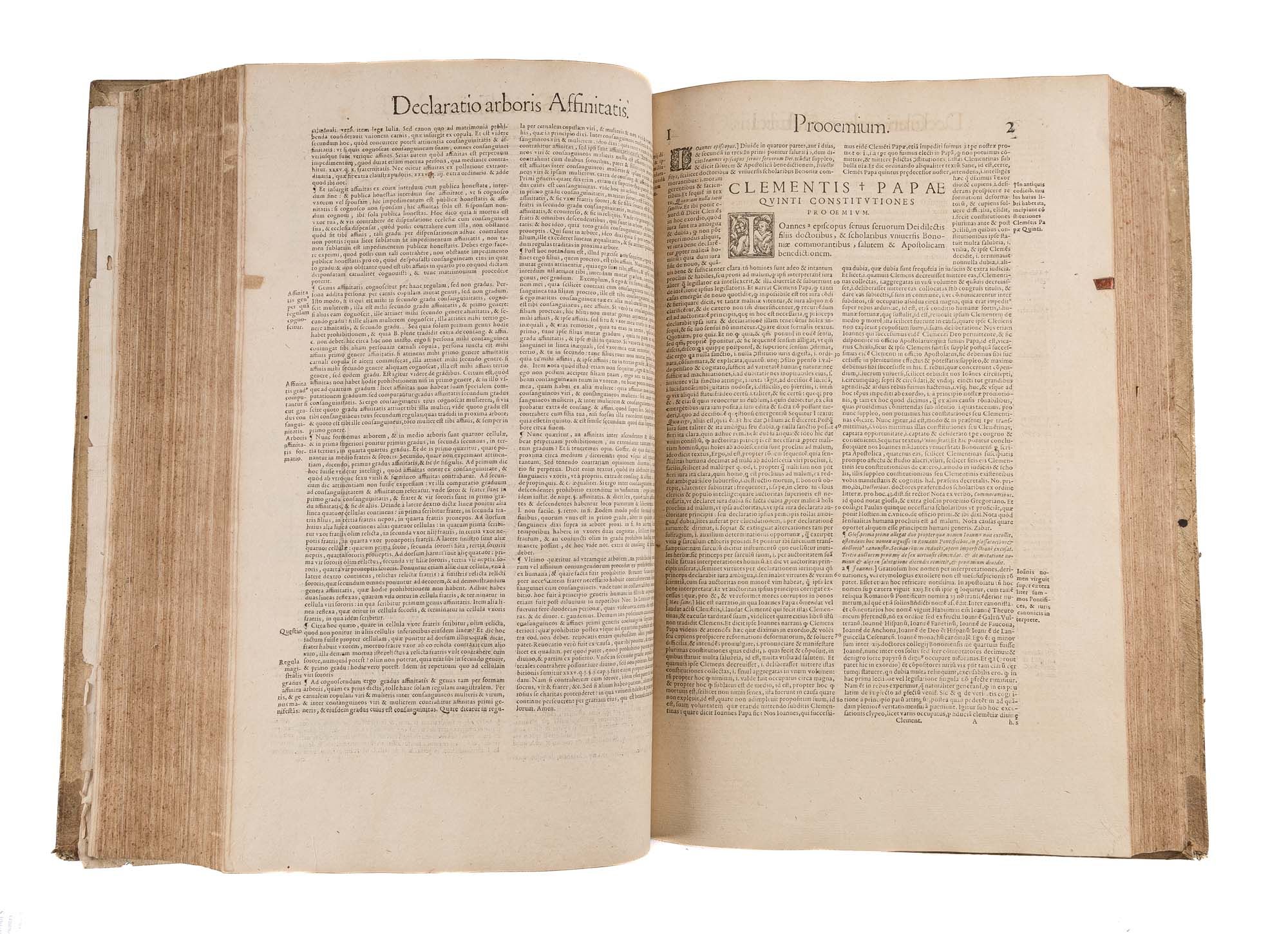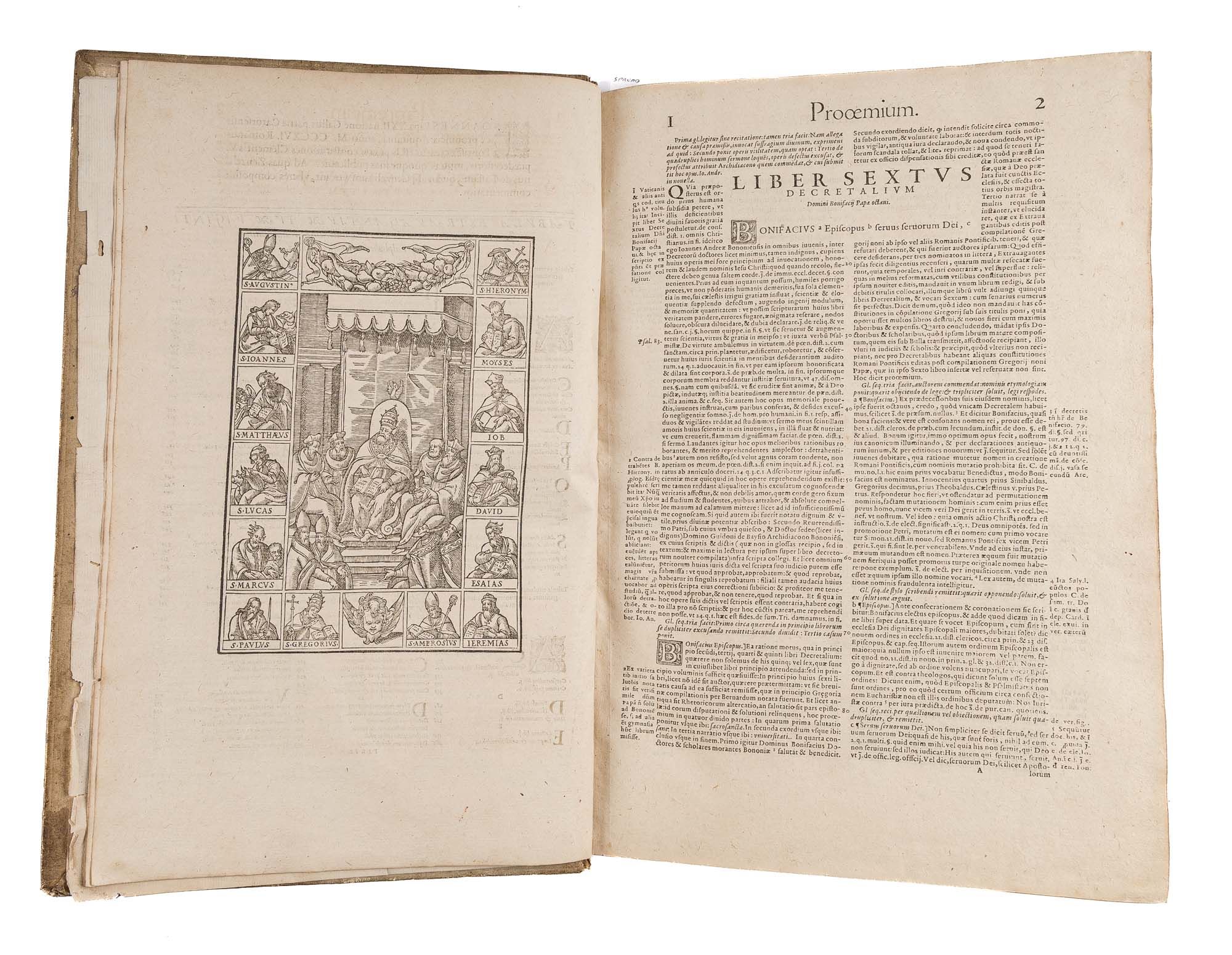 1584. Lyon: De Licentia D.N. Gregorii, 1584. Folio.. Lyon: De Licentia D.N. Gregorii, 1584. Folio. OCLC Locates No Copies in North America: A Scarce 1584 Printing of Texts from the Corpus Juris Canonici, This Copy from a German Jesuit Library Boniface VIII, Pope [c.1235-1303]. Clement V, Pope [c.1264-1314]. John XXII, Pope [1244-1334]. D'Andrea, Giovanni [c.1270-1348], Glossator. Liber Sextus Decretalium D. Bonifacii Papae VIII. Clementis Papae V. Constitutiones. Extravagantes tum Viginti D. Ioannis Papae XXII. Tum Communes. Haec Omnia cum Suis Glossis Suae Integritati Restituta, & Ad Exemplar Romanum Diligenter Recognita. Lyon: De Licentia D.N. Gregorii XIII. Pont. Max., 1584. [viii] pp., 870, [6] pp.; 348; 364 cols., [22] pp. Folio (15-1/2" x 10"; 39.3 x 25.4 cm). Contemporary paneled pigskin, raised bands, blind fillets and faint hand-lettered title and shelf mark to spine, fragments of thong ties. Light soiling, faint staining and a few small marks to boards, moderate rubbing to extremities, corners bumped and moderately worn, spine darkened, minor worming to pastedowns, endleaves and adjacent leaves, including title page, front free endpaper detached and edgeworn. Title page, with large woodcut device, printed in red and black, full-page woodcut of Pope Boniface within historiated border depicting biblical figures and church fathers to verso of p. 4, large woodcut diagrammatic trees of family relations (consanguinitatis, affinitatis) to ?1, ?3 (pp. [1], [3] following Liber Sextus) and foot of L6 (cols. 341-342 of Clementis). Moderate toning to interior, faint dampstaining to margins in places, annotations and underlining in an early hand to a few leaves, later owner inscription of the Jesuit College of Landsberg am Lech, Bavaria to head of title page, which is lightly soiled. A very good copy of a scarce imprint. $2,500. **THIS DESCRIPTION IS TRUNCATED DUE TO CHARACTER LIMITS. PLEASE CONTACT US FOR A COMPLETE VERSION.** * This volume collects several texts from the compilation known as the Corpus Juris Canonici: the Liber Sextus Decretalium of Boniface VIII (1298), the Liber Quinque Decretalium of Gregory IX (1234), the Liber Septimus Decretalium of John XXII, better known as the Constitutiones Clementis V or simply Clementinae (1317), the Extravagantes of John XXII (1325) and the.