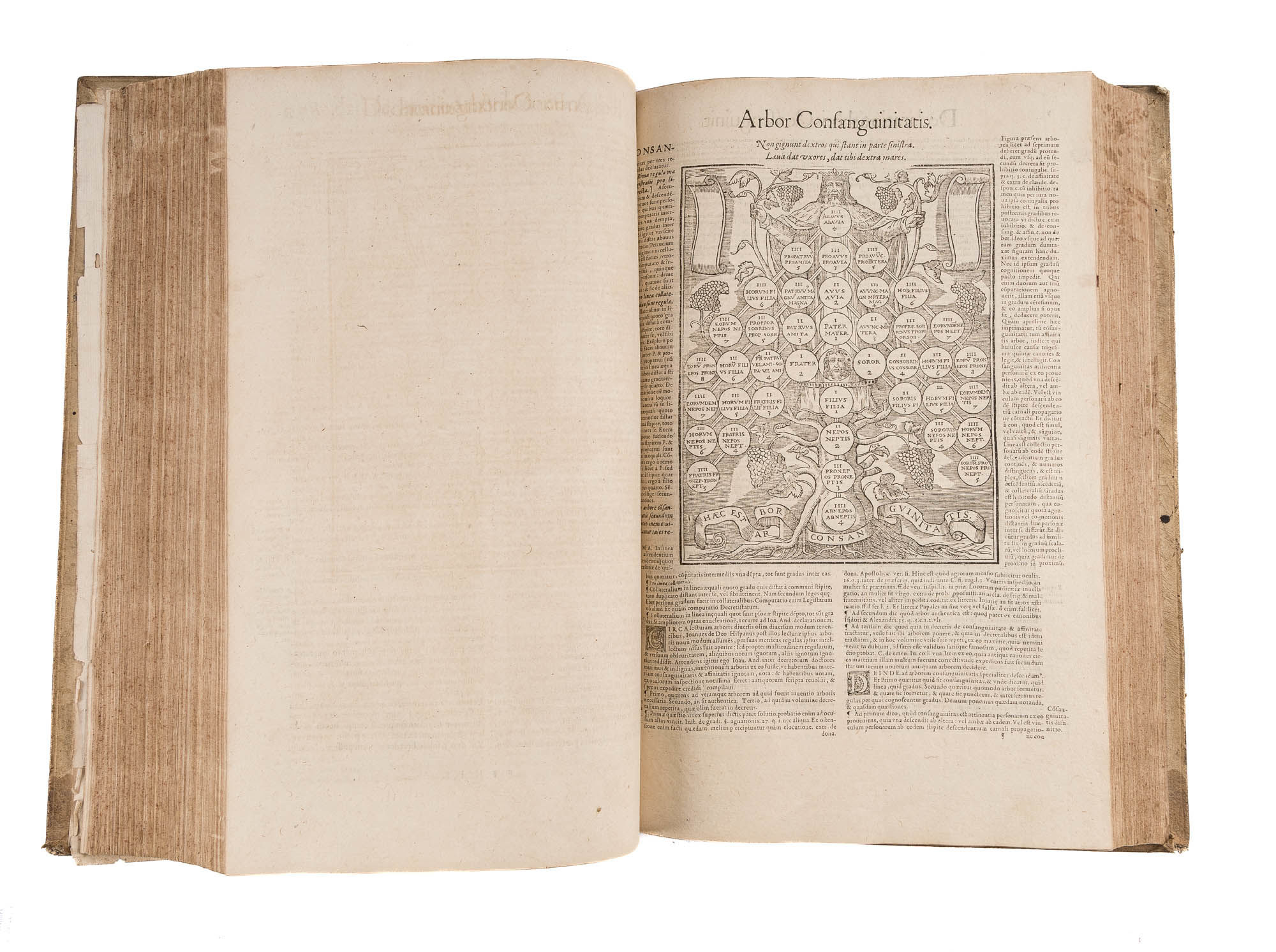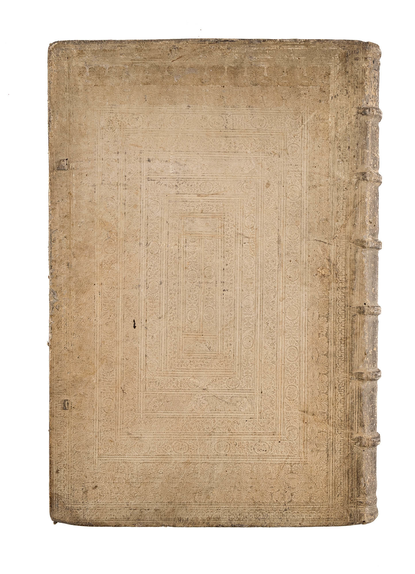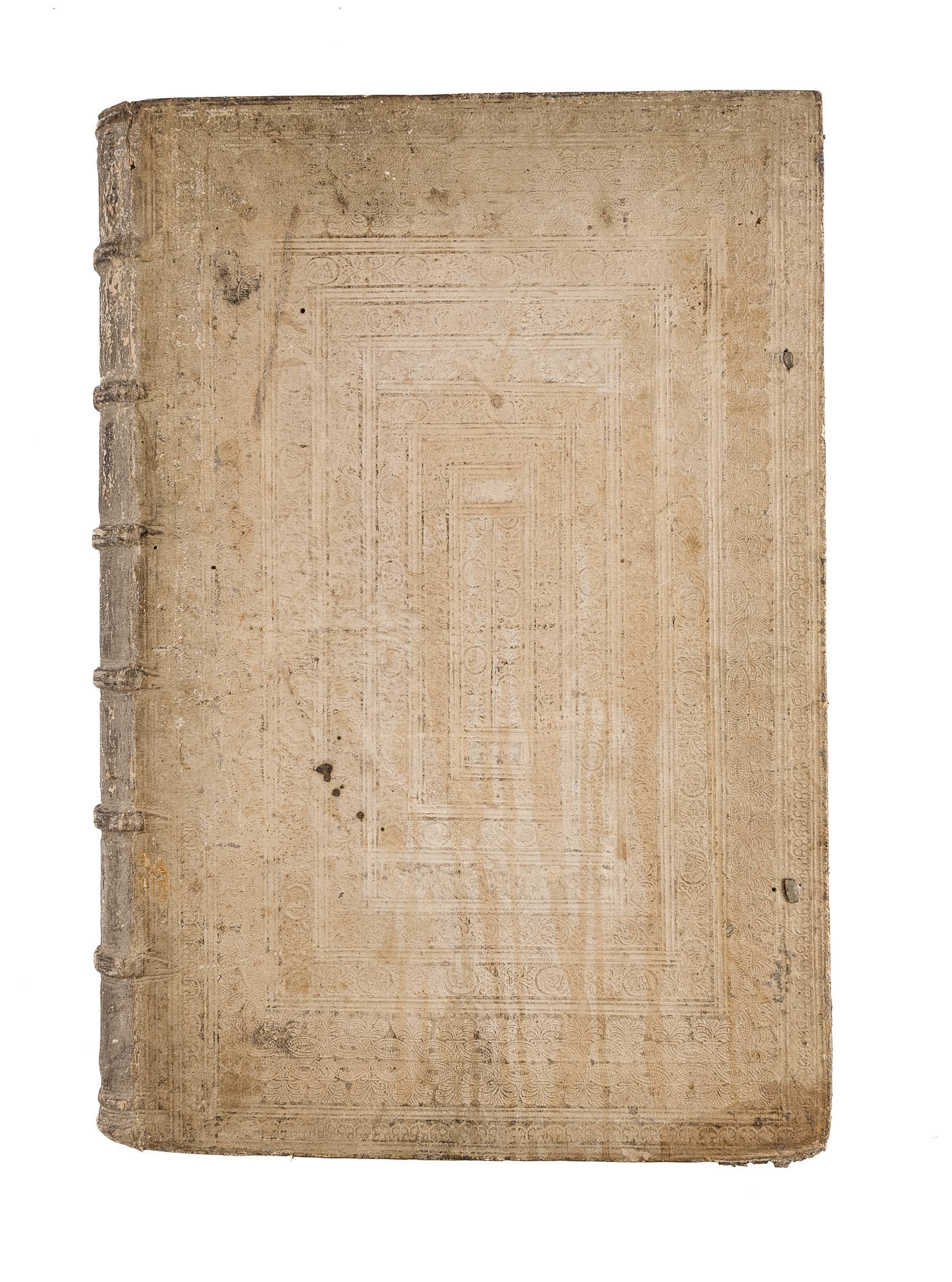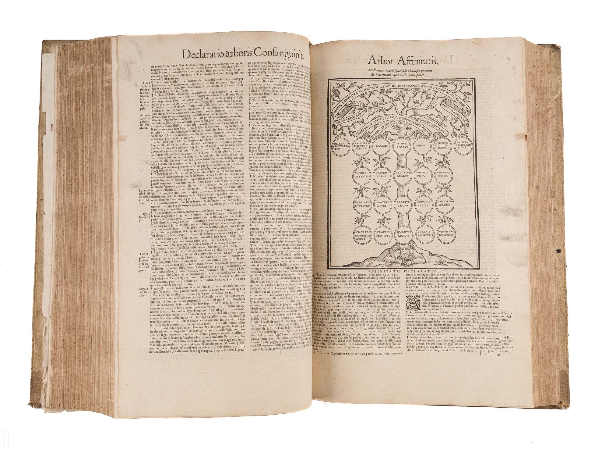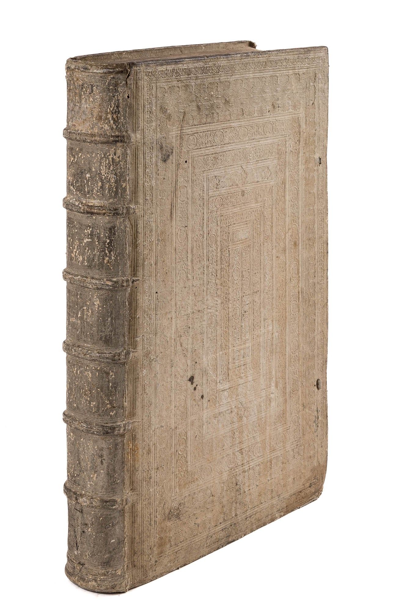1584. Lyon: De Licentia D.N. Gregorii, 1584. Folio.. Lyon: De Licentia D.N. Gregorii, 1584. Folio. OCLC Locates No Copies in North America: A Scarce 1584 Printing of Texts from the Corpus Juris Canonici, This Copy from a German Jesuit Library Boniface VIII, Pope [c.1235-1303]. Clement V, Pope [c.1264-1314]. John XXII, Pope [1244-1334]. D'Andrea, Giovanni [c.1270-1348], Glossator. Liber Sextus Decretalium D. Bonifacii Papae VIII. Clementis Papae V. Constitutiones. Extravagantes tum Viginti D. Ioannis Papae XXII. Tum Communes. Haec Omnia cum Suis Glossis Suae Integritati Restituta, & Ad Exemplar Romanum Diligenter Recognita. Lyon: De Licentia D.N. Gregorii XIII. Pont. Max., 1584. [viii] pp., 870, [6] pp.; 348; 364 cols., [22] pp. Folio (15-1/2" x 10"; 39.3 x 25.4 cm). Contemporary paneled pigskin, raised bands, blind fillets and faint hand-lettered title and shelf mark to spine, fragments of thong ties. Light soiling, faint staining and a few small marks to boards, moderate rubbing to extremities, corners bumped and moderately worn, spine darkened, minor worming to pastedowns, endleaves and adjacent leaves, including title page, front free endpaper detached and edgeworn. Title page, with large woodcut device, printed in red and black, full-page woodcut of Pope Boniface within historiated border depicting biblical figures and church fathers to verso of p. 4, large woodcut diagrammatic trees of family relations (consanguinitatis, affinitatis) to ?1, ?3 (pp. [1], [3] following Liber Sextus) and foot of L6 (cols. 341-342 of Clementis). Moderate toning to interior, faint dampstaining to margins in places, annotations and underlining in an early hand to a few leaves, later owner inscription of the Jesuit College of Landsberg am Lech, Bavaria to head of title page, which is lightly soiled. A very good copy of a scarce imprint. $2,500. **THIS DESCRIPTION IS TRUNCATED DUE TO CHARACTER LIMITS. PLEASE CONTACT US FOR A COMPLETE VERSION.** * This volume collects several texts from the compilation known as the Corpus Juris Canonici: the Liber Sextus Decretalium of Boniface VIII (1298), the Liber Quinque Decretalium of Gregory IX (1234), the Liber Septimus Decretalium of John XXII, better known as the Constitutiones Clementis V or simply Clementinae (1317), the Extravagantes of John XXII (1325) and the.