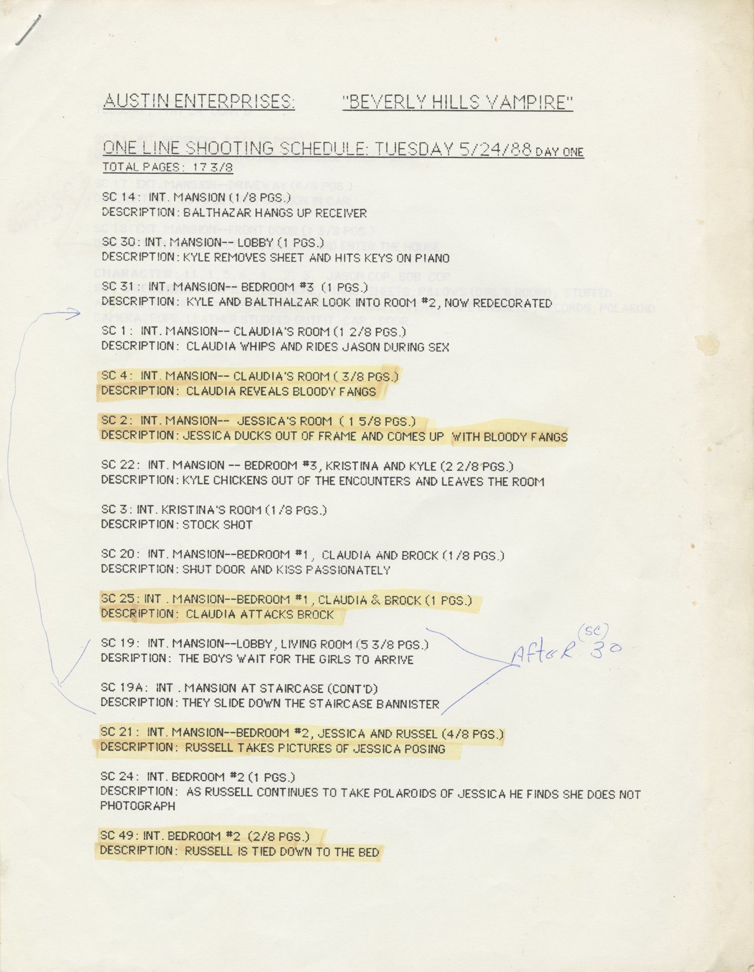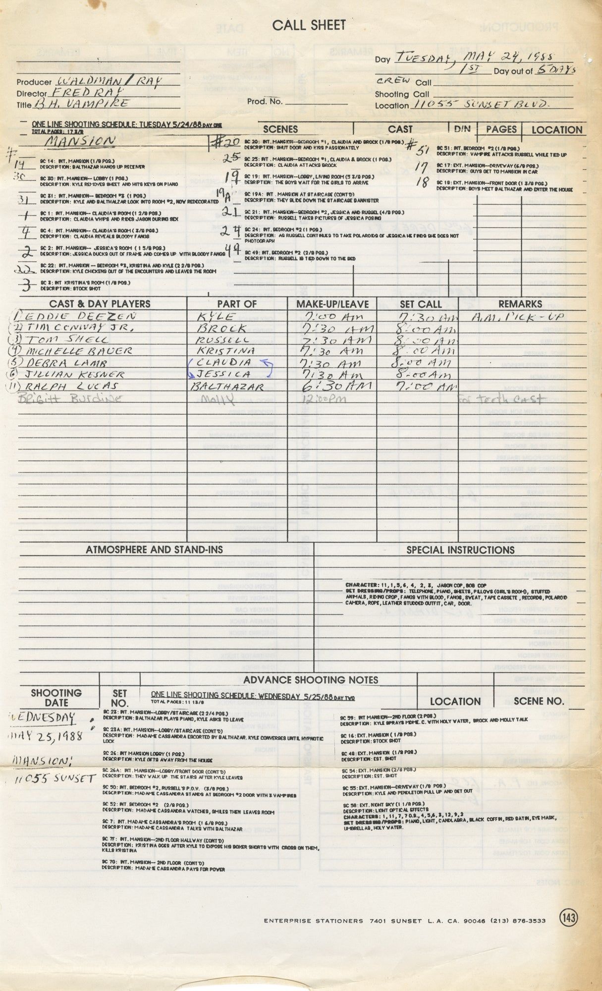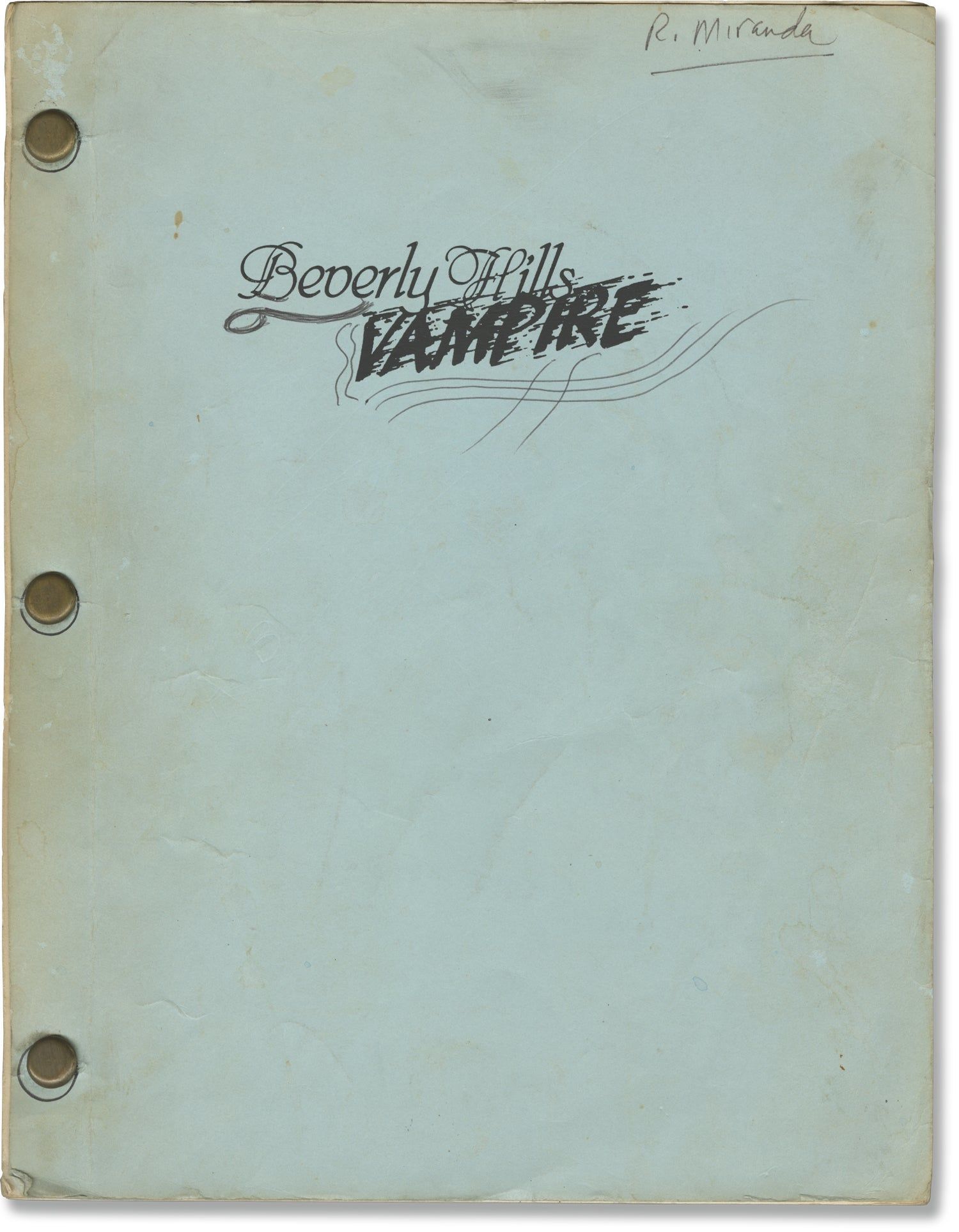 Hollywood: Austin Enterprises, 1989. Draft script for the 1989 film, seen here under the working title "Beverly Hills Vampire." Copy belonging to makeup artist Richard Miranda, with his name in manuscript ink on the front wrapper, and his annotations throughout. Laid in with the script is a five-day shooting schedule, along with a call sheet dated May 24, 1988.