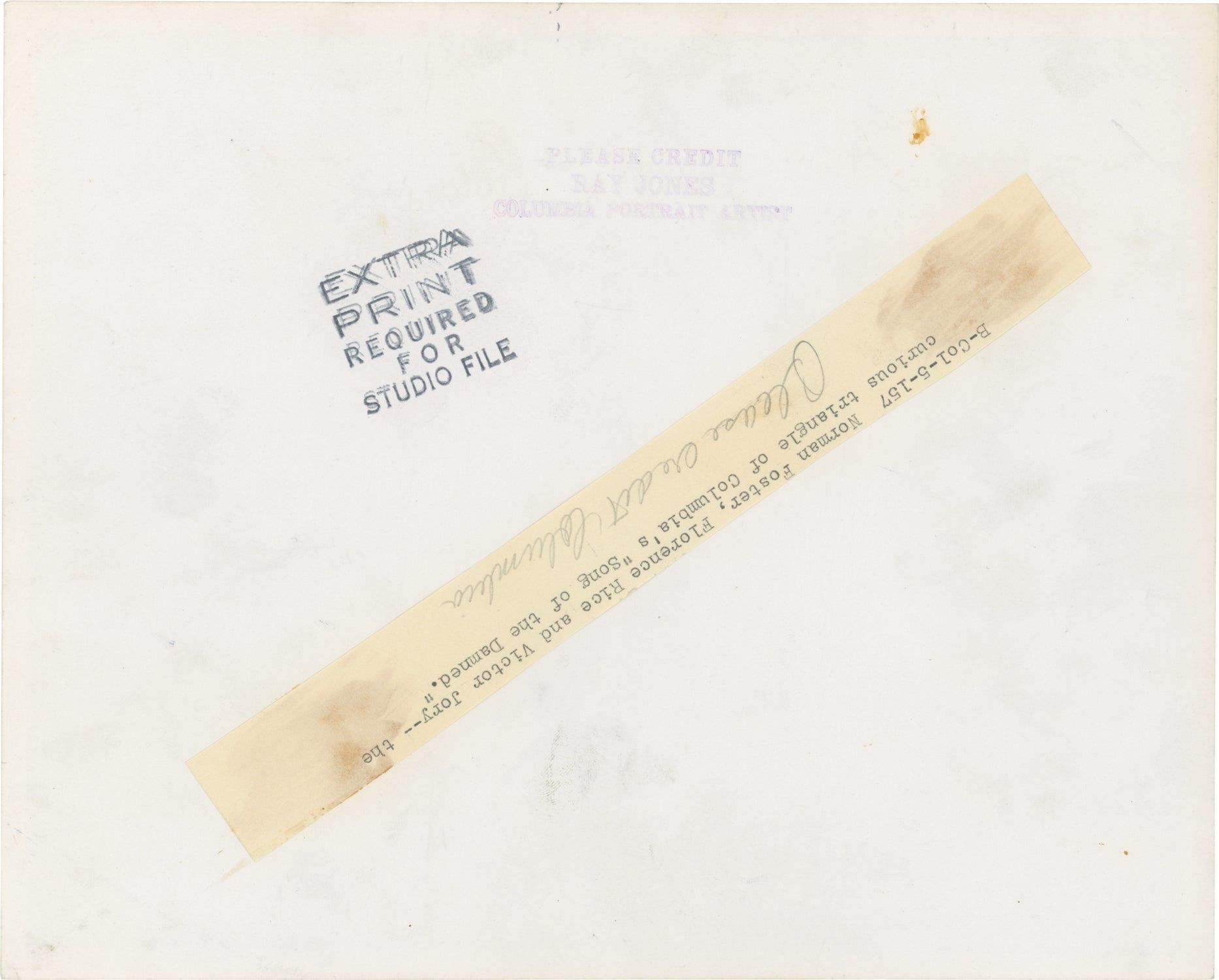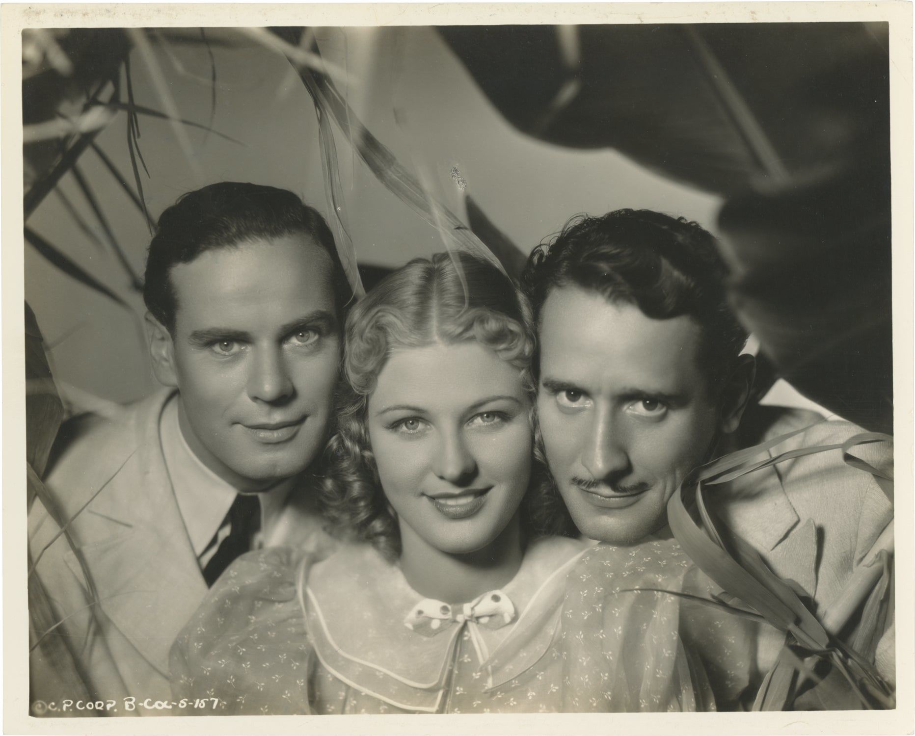 Culver City, CA: Columbia Pictures, 1935. Vintage publicity photograph of Norman Foster, Florence Rice, and Victor Jory from the 1935 film, with a two stamps on the verso, including one stamp crediting photographer" Ray Jones, and a mimeo snipe under the working title "Song of the Damned," on the verso.