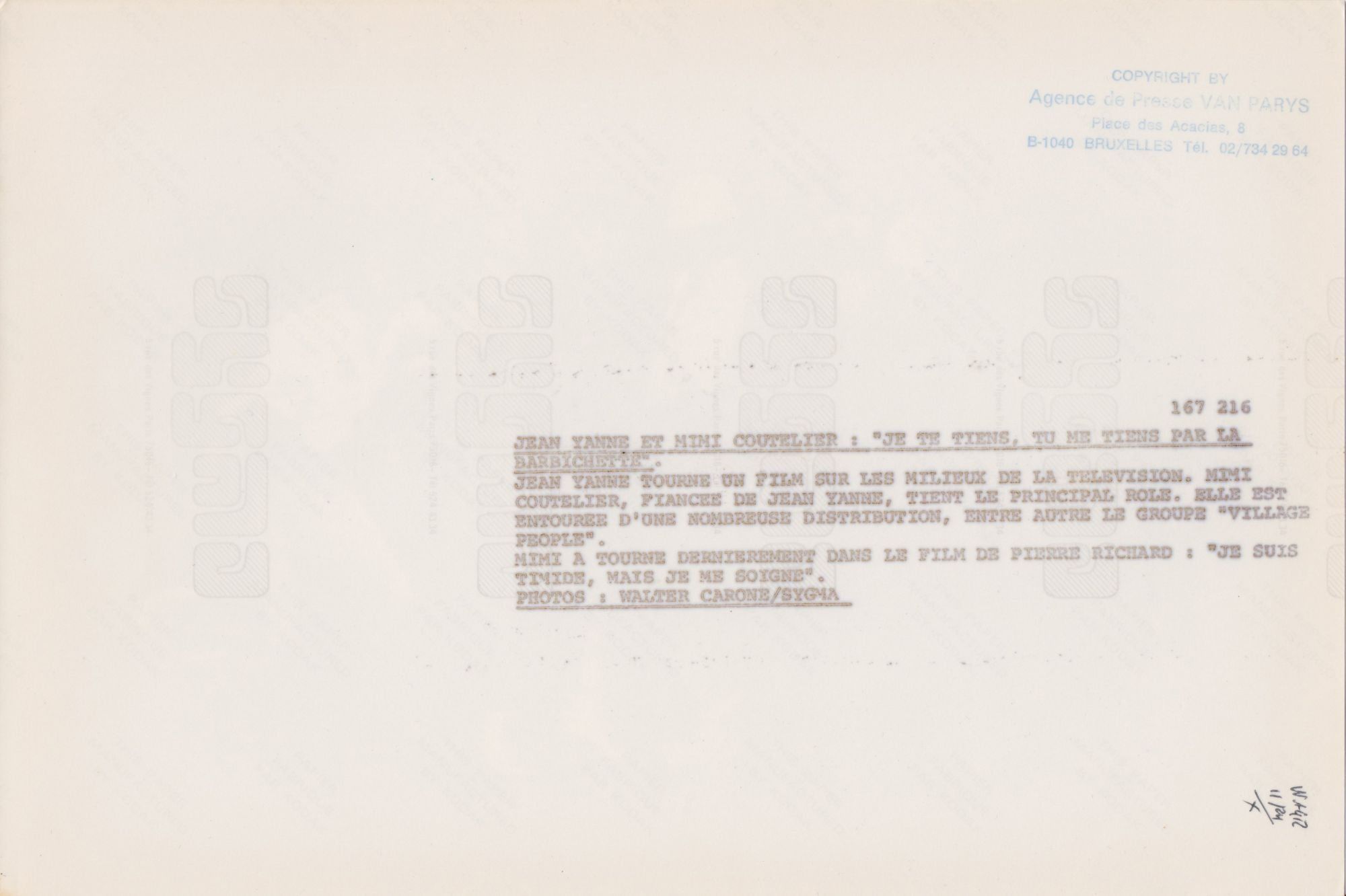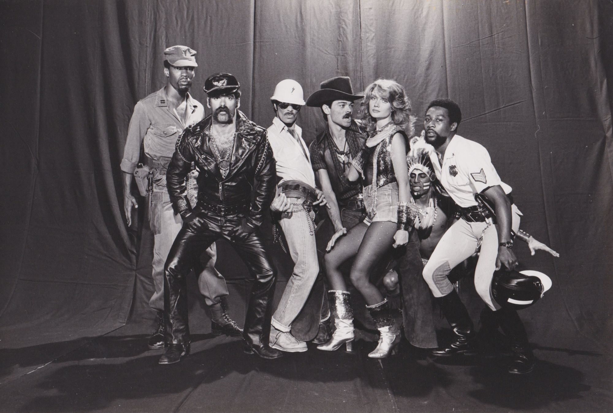 Paris: Sygma, 1979. Vintage oversize matte-finish publicity photograph from the 1979 French film, showing The Village People and actress Mimi Coutelier. French mimeo snipe and agency stamp on the verso.